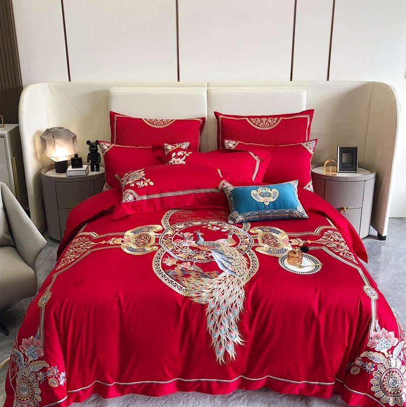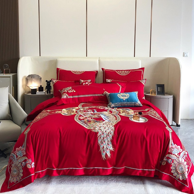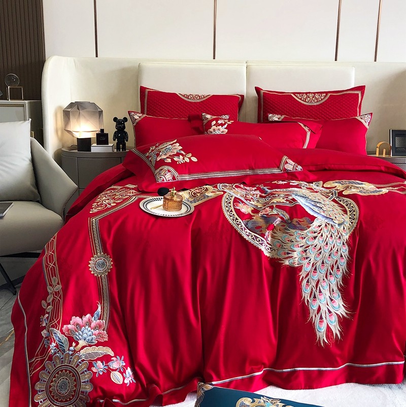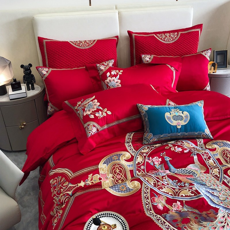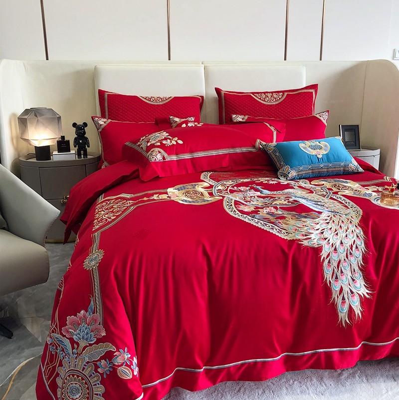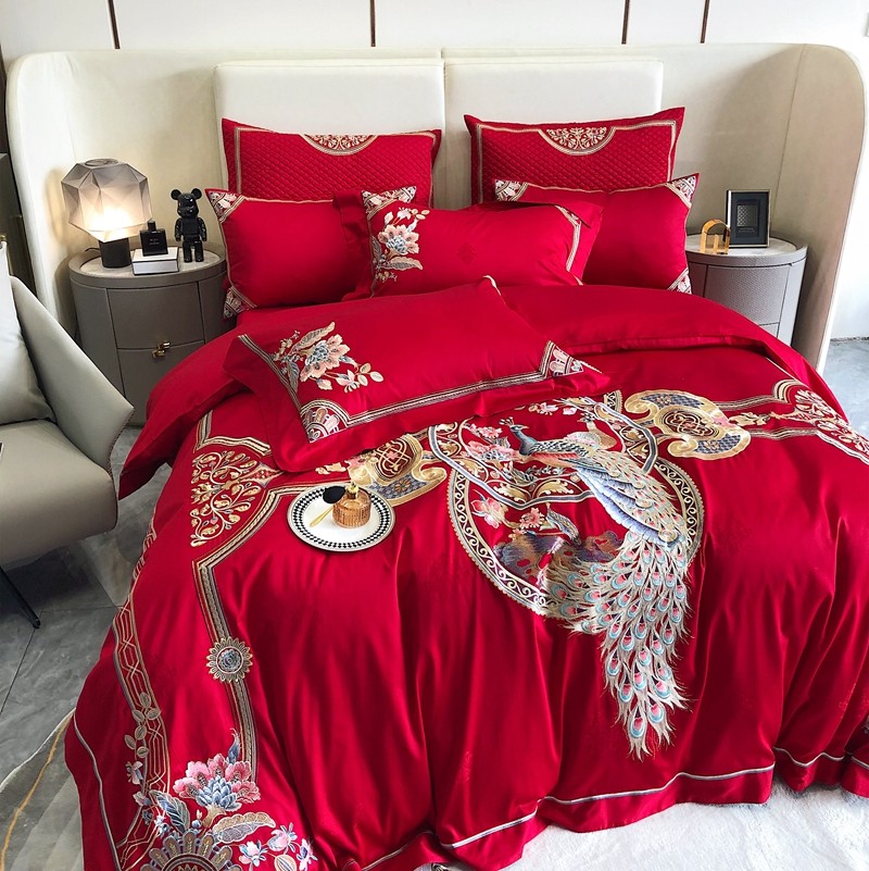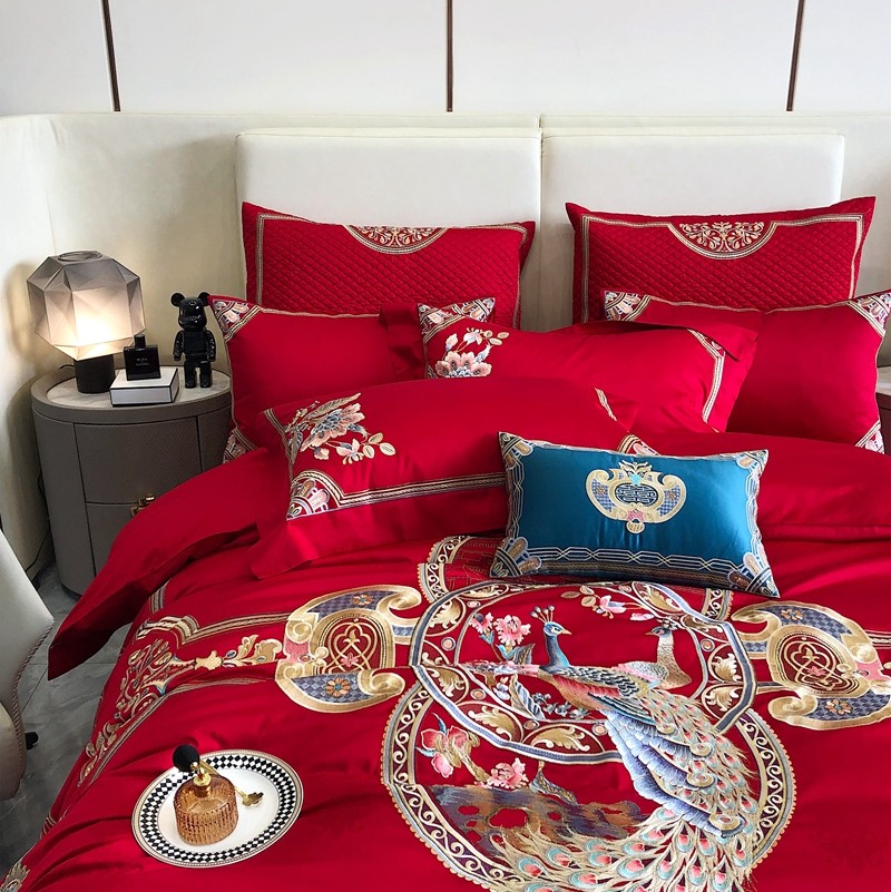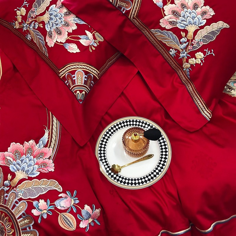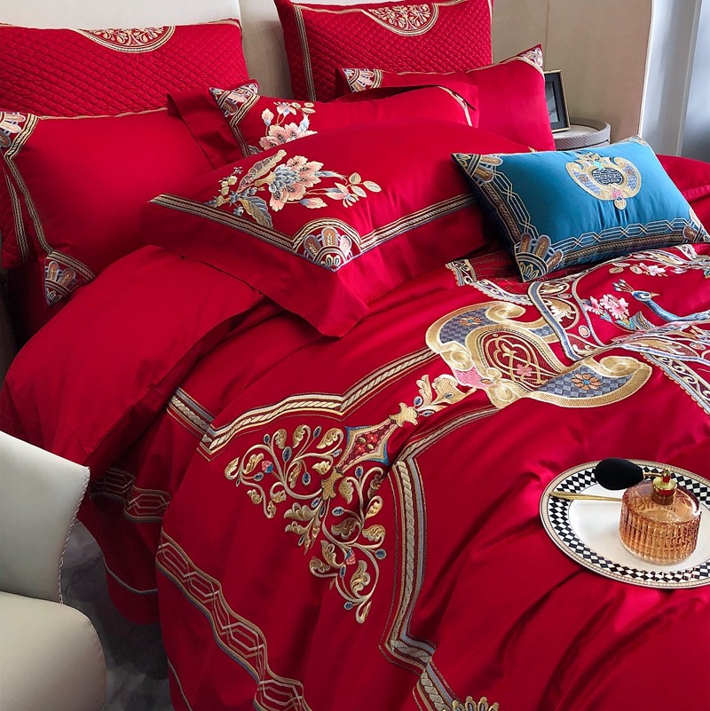 馨蕊家居2022新款140S全棉长绒棉刺绣婚庆四件套琴瑟和鸣