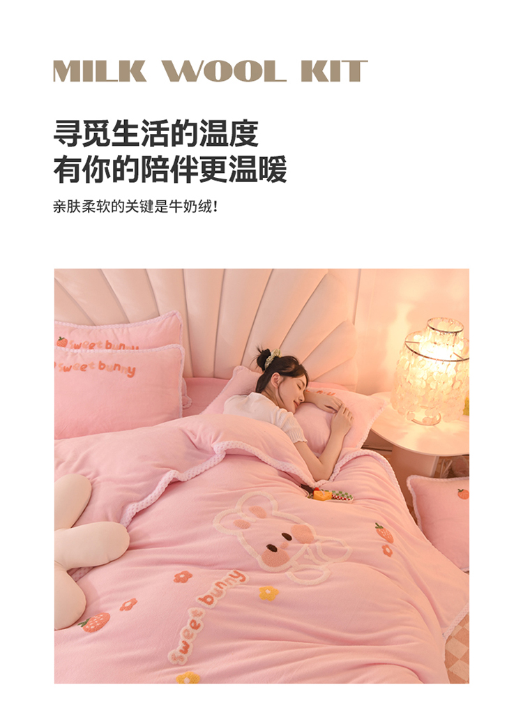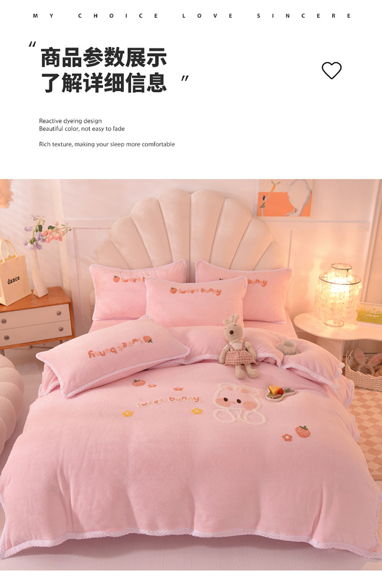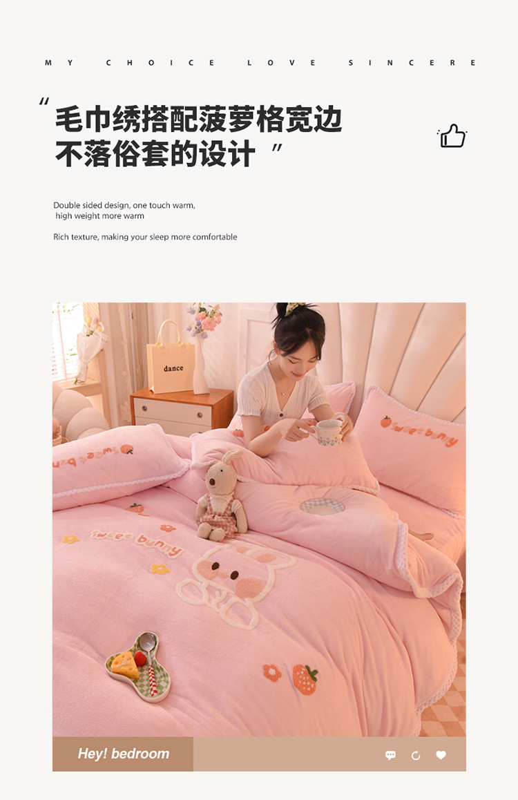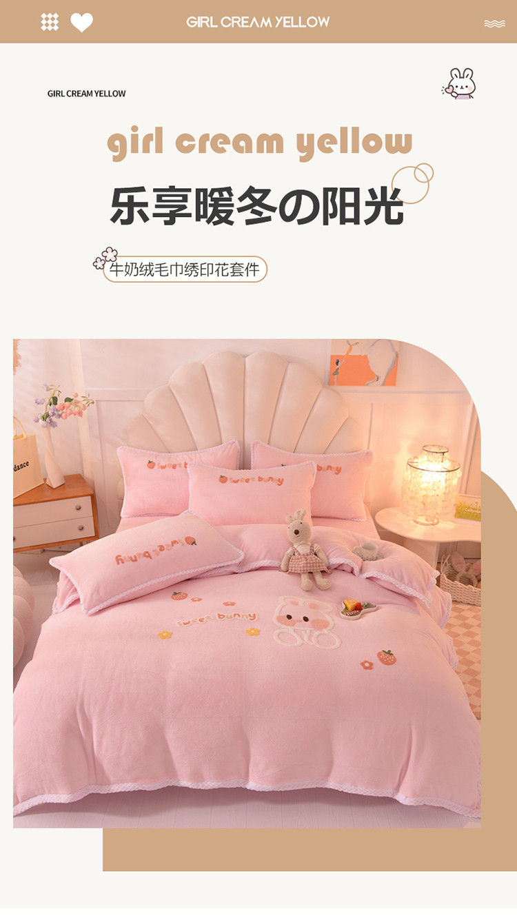 当前位置: 91家纺网 > 商品网购 > 床品套件 > 四件套 > 牛奶绒四件套 > 菲儿 2022新款毛巾绣牛奶绒四件套 甜蜜小兔-仙女粉