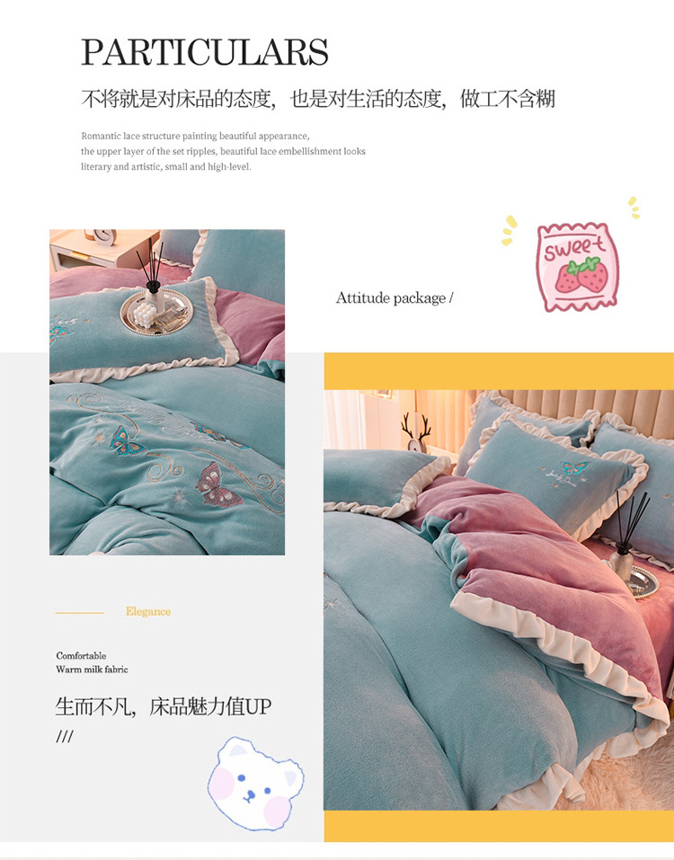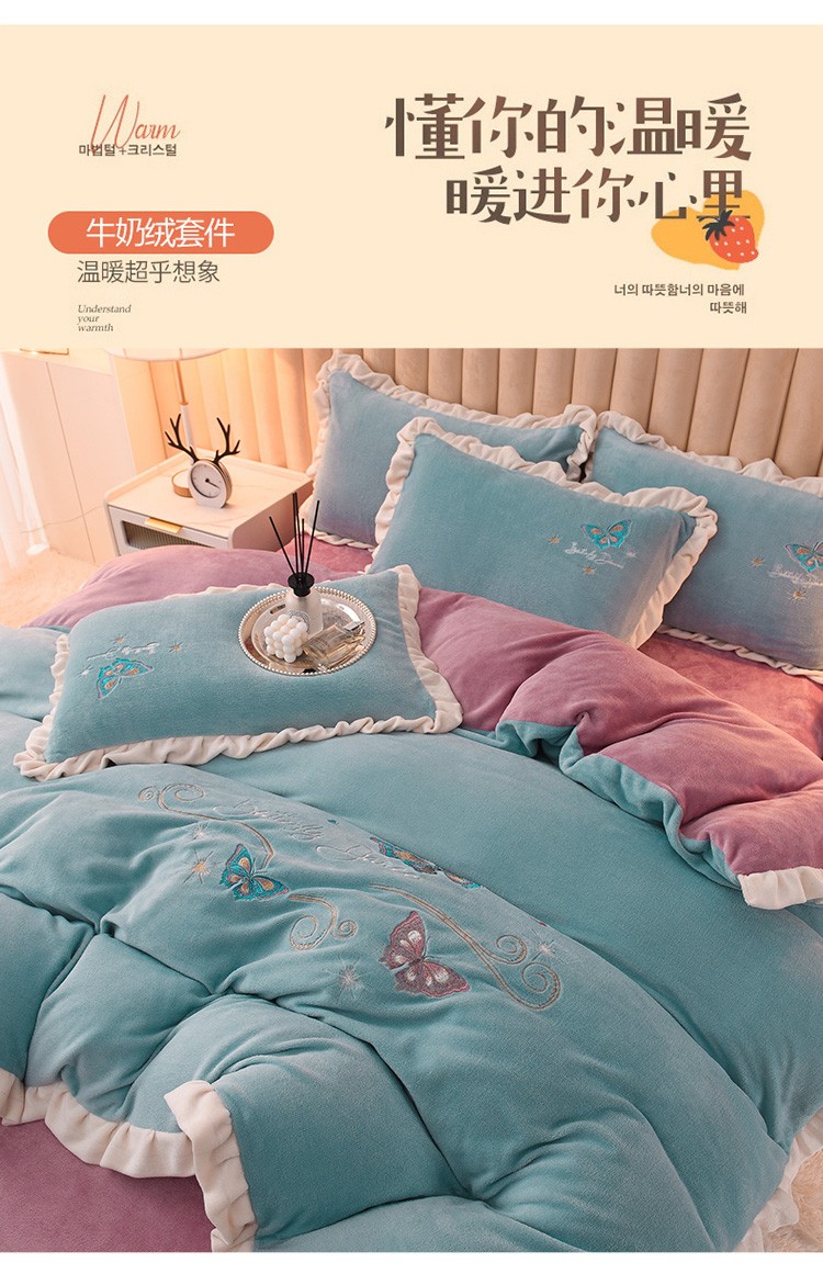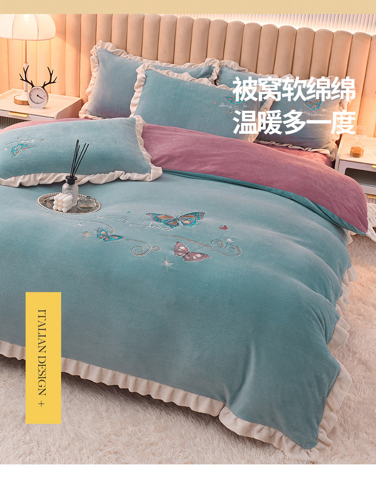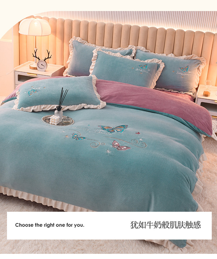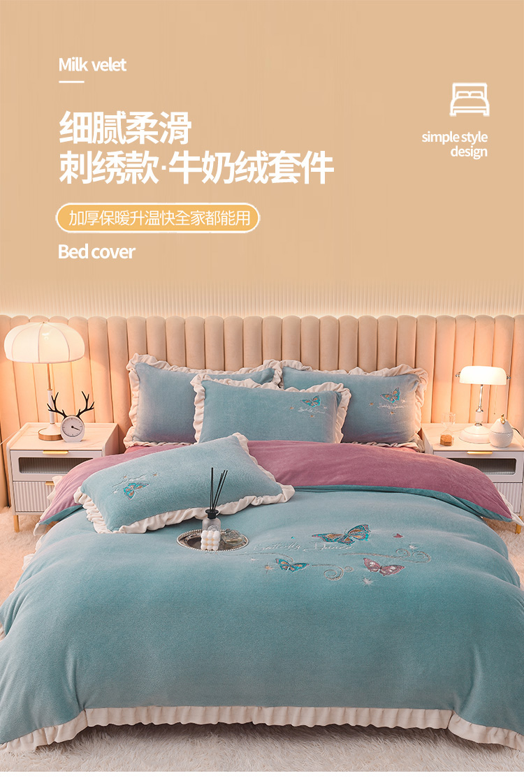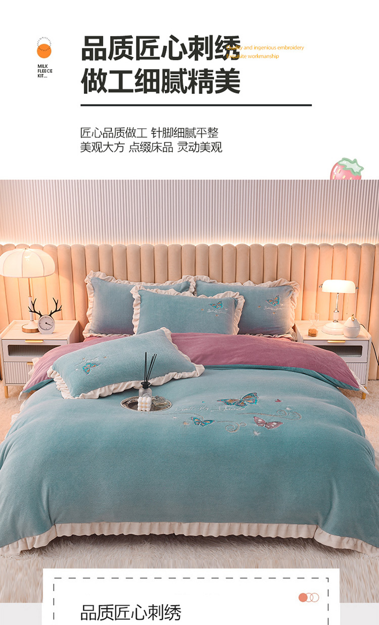 商品名称:芃成 2022新款加厚保暖牛奶绒绣花四件套 蝶舞 湖兰
