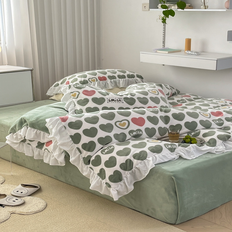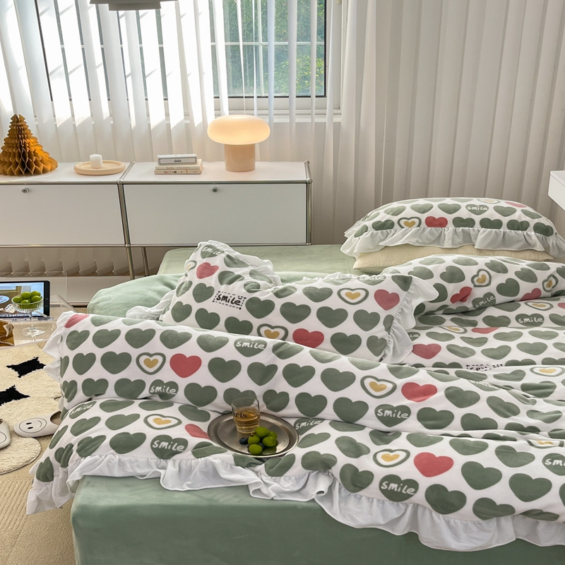 昔可 2022新款花边牛奶绒四件套 爱心微笑绿