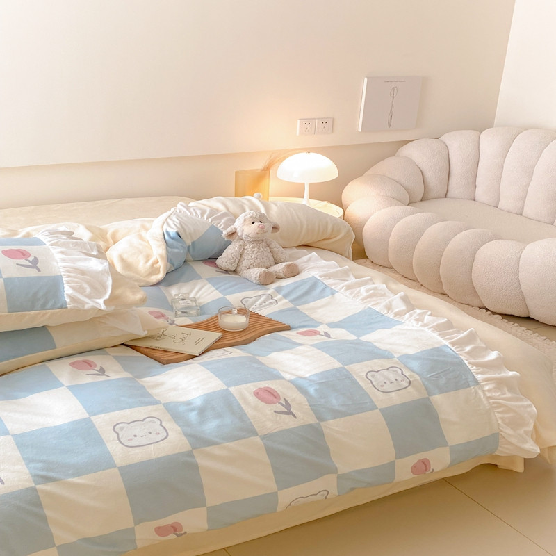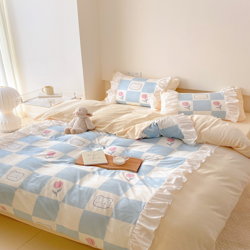 商品名称:昔可 2022新款数码印花花边款牛奶绒四件套 棋盘萌物