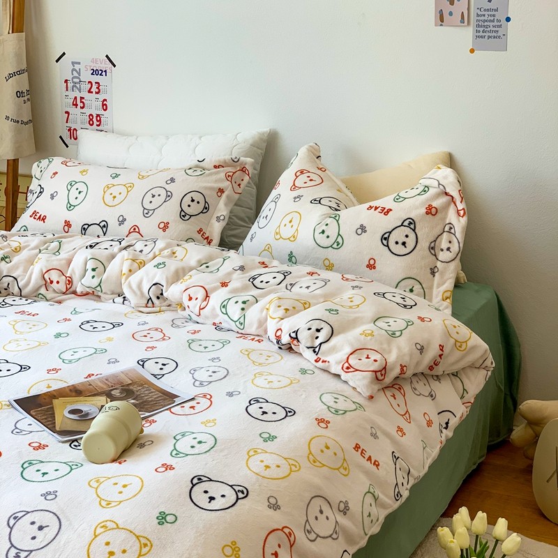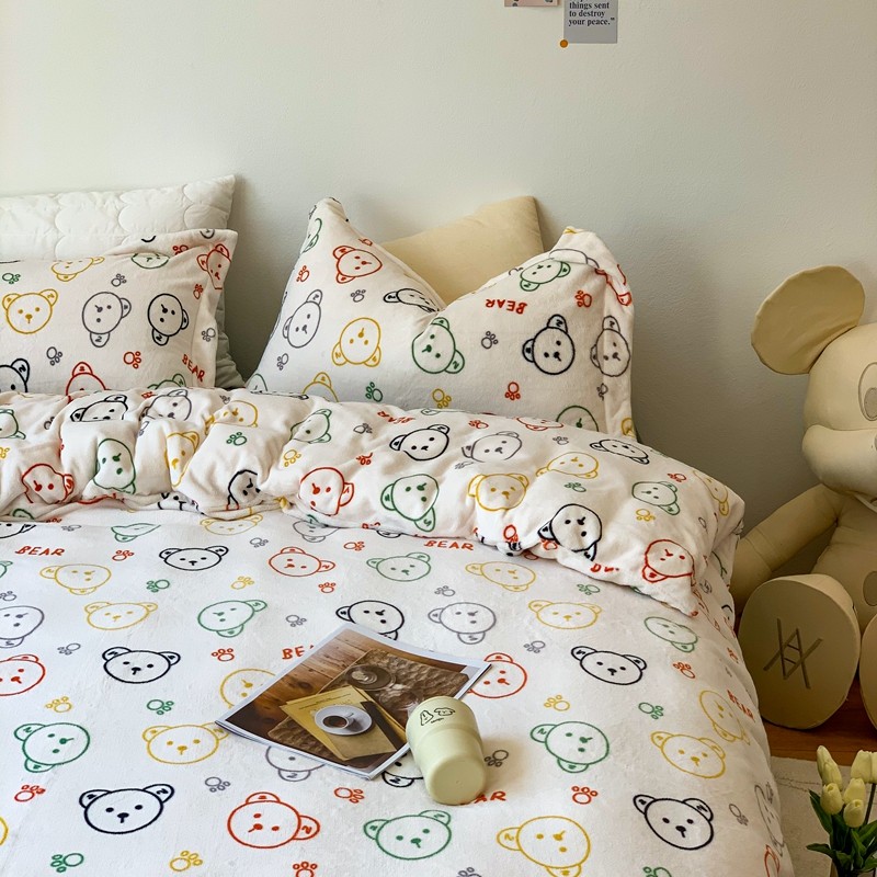 时年 2022新款全消光牛奶绒印花四件套 彩色小熊
