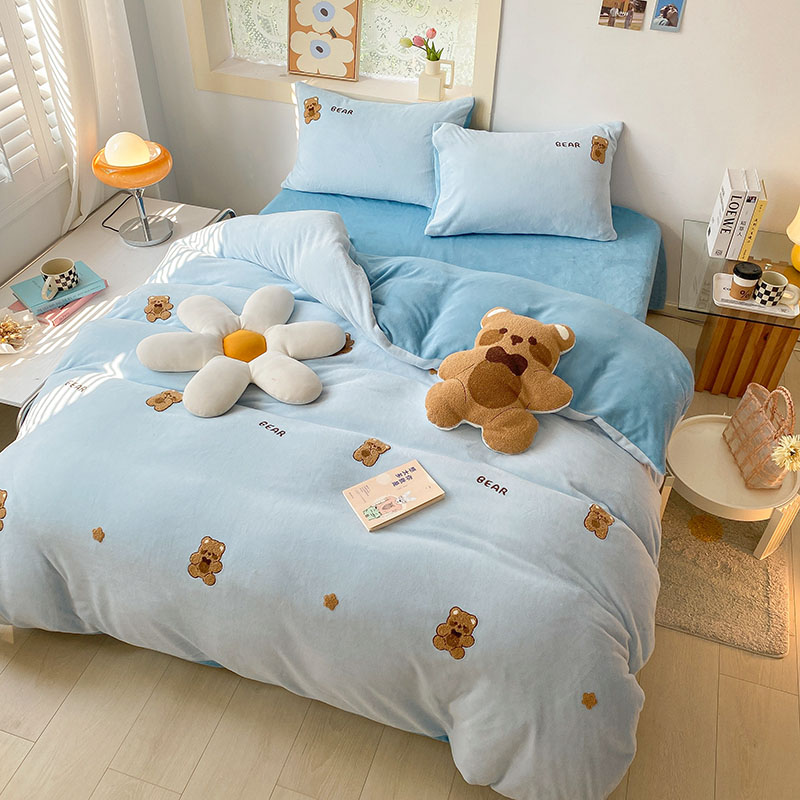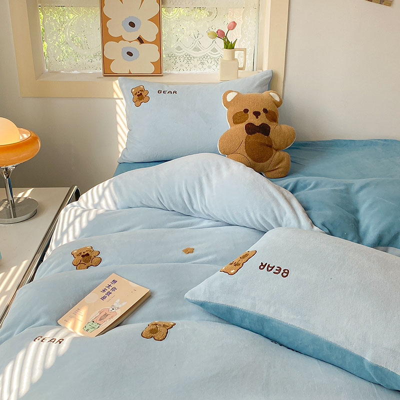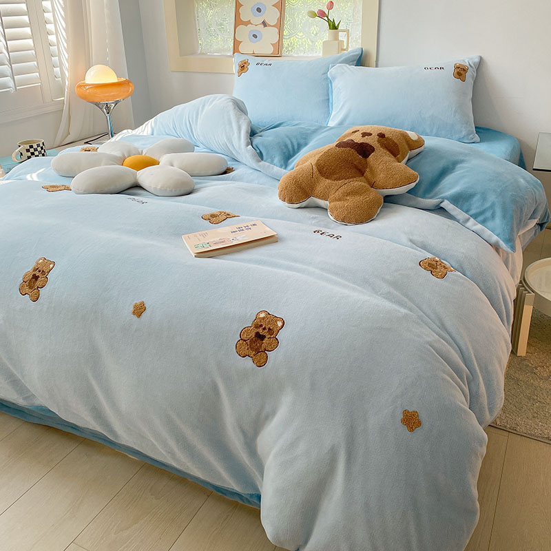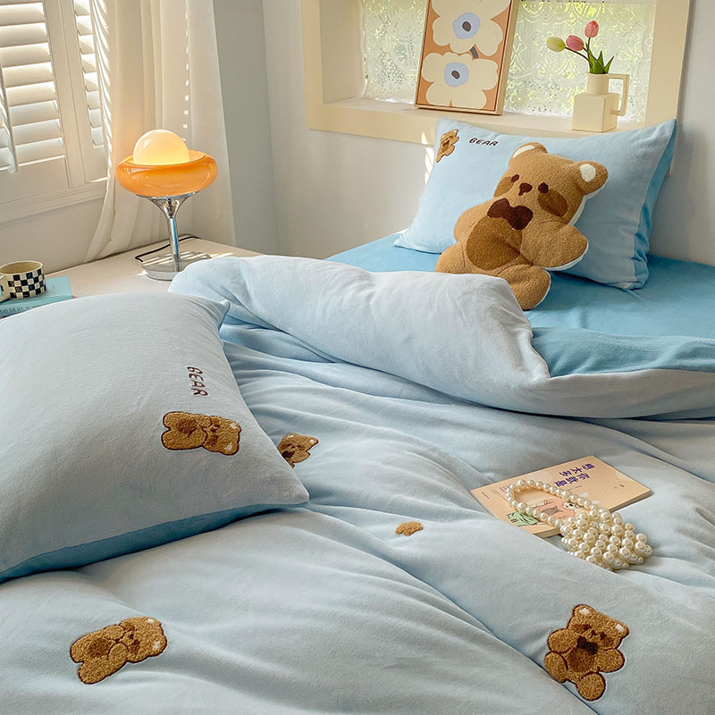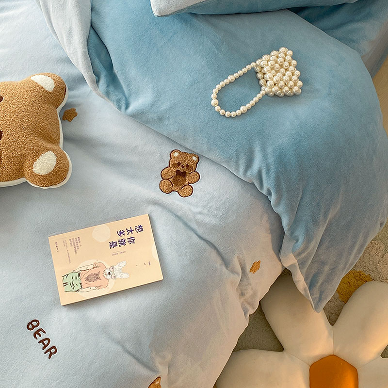 寐居2022新款毛巾绣牛奶绒单被套 萌萌熊-蓝