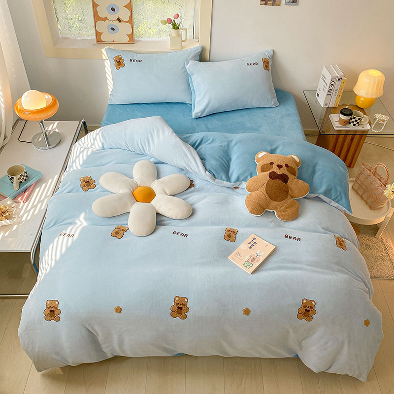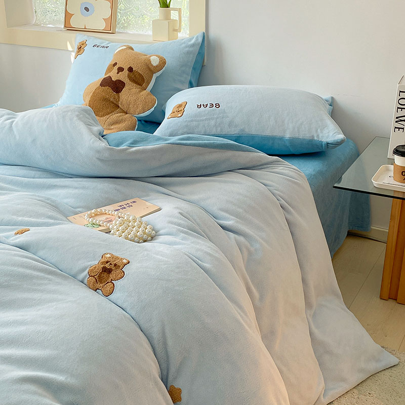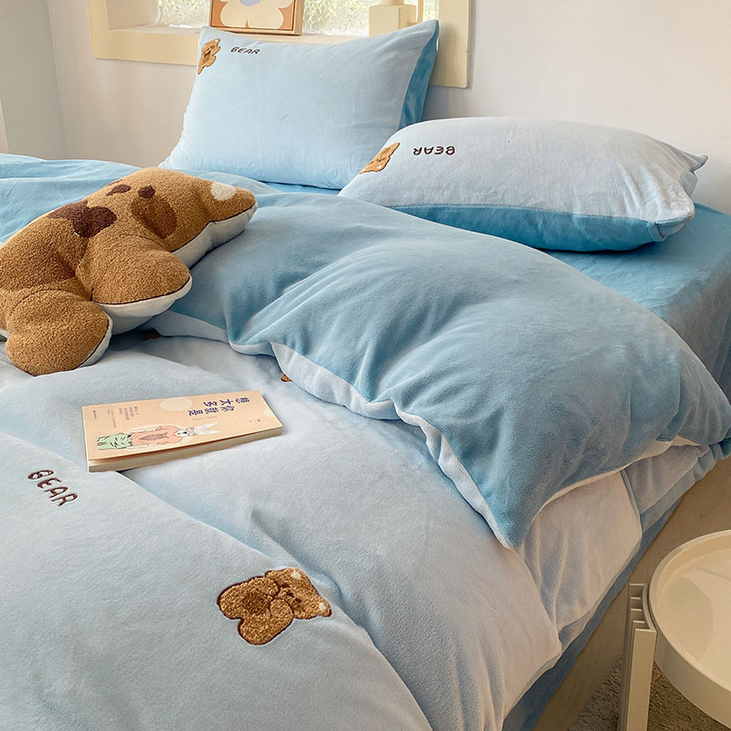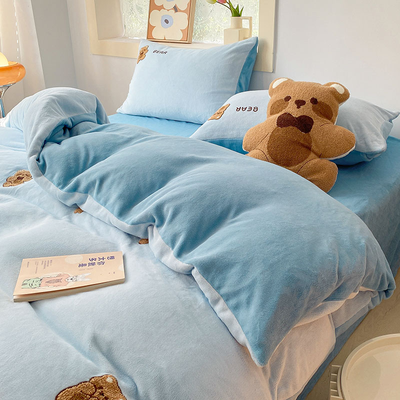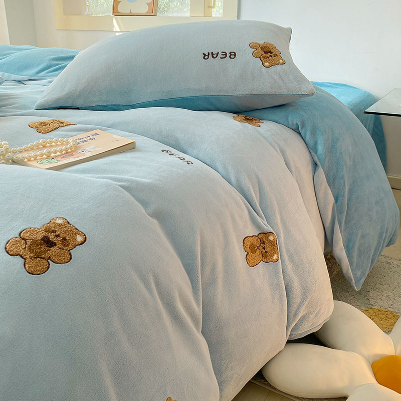 寐居2022新款毛巾绣牛奶绒单被套 萌萌熊-蓝