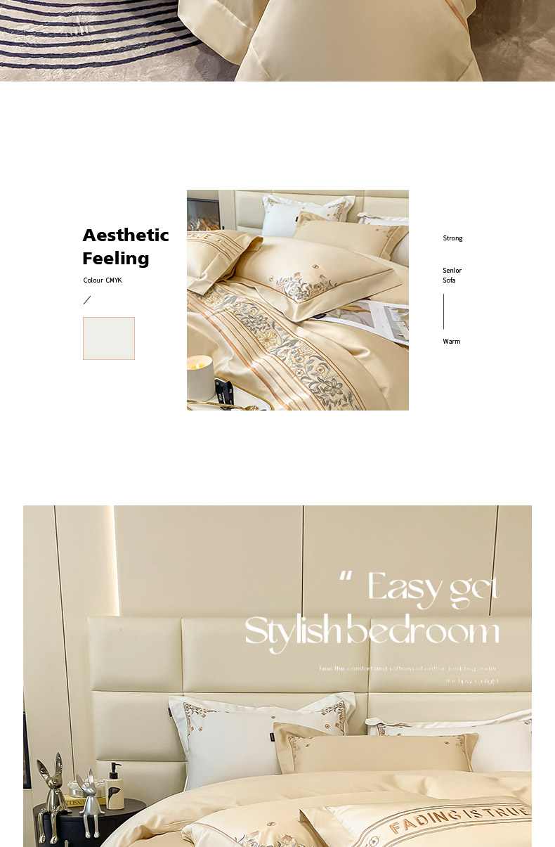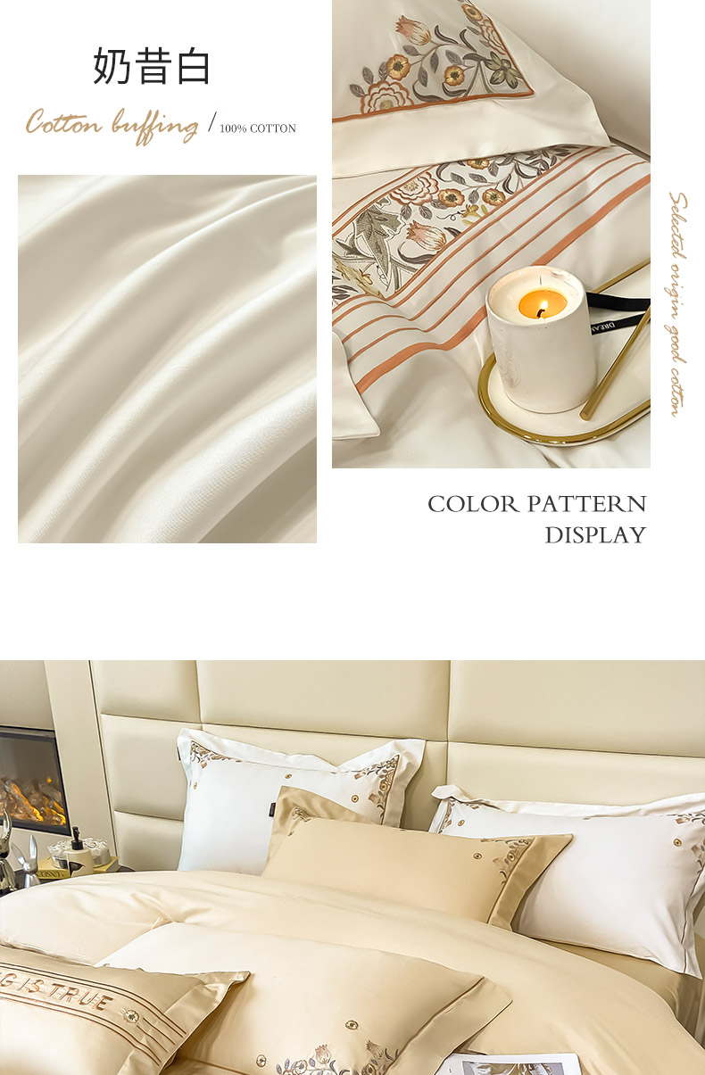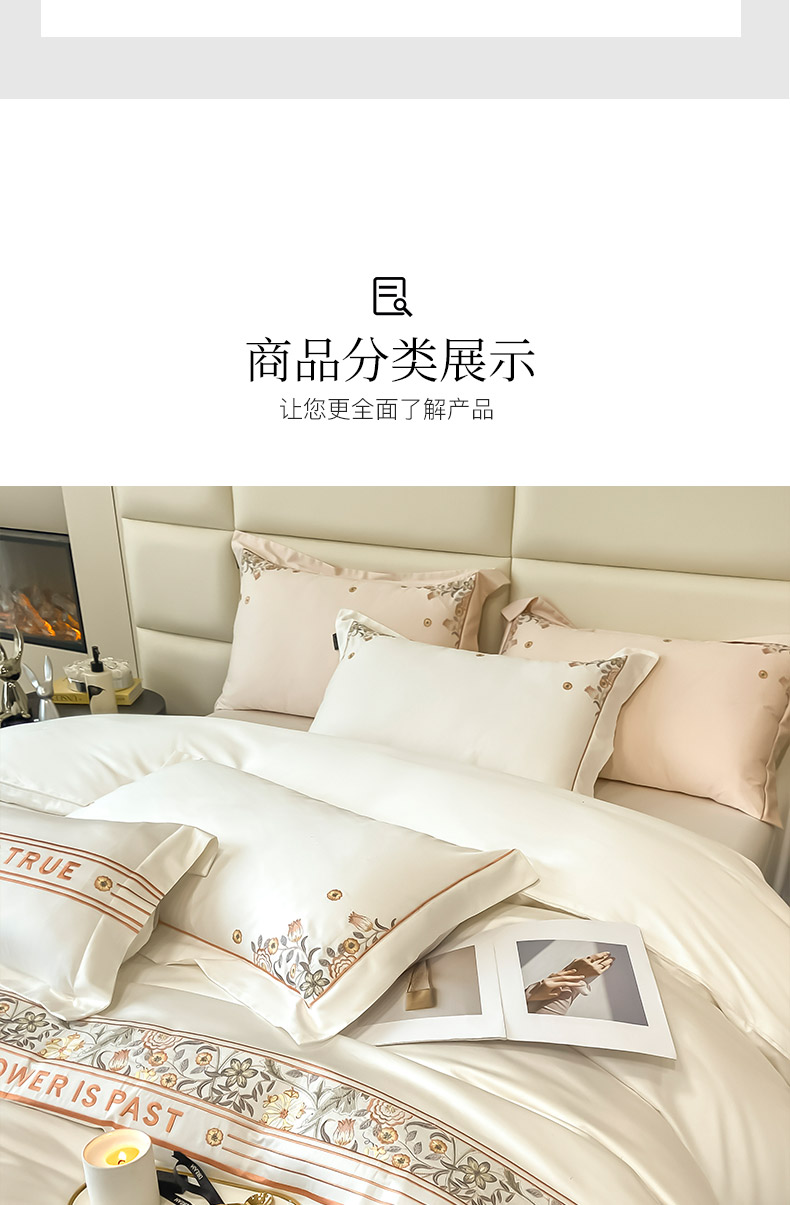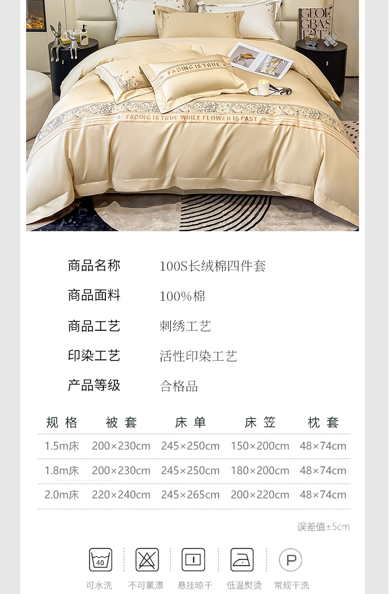 商品名称:100支长绒棉四件套纯色天丝棉刺绣床单被套新疆棉轻奢4件套 盘西-香槟金