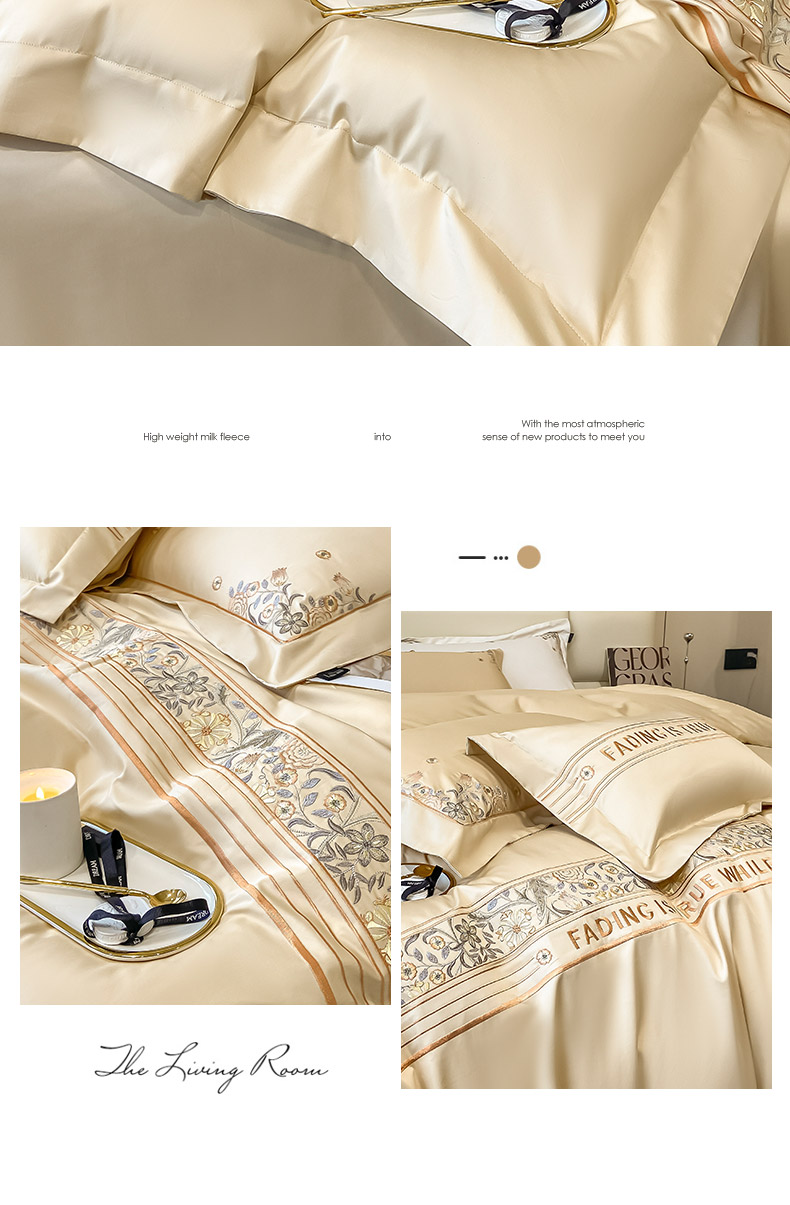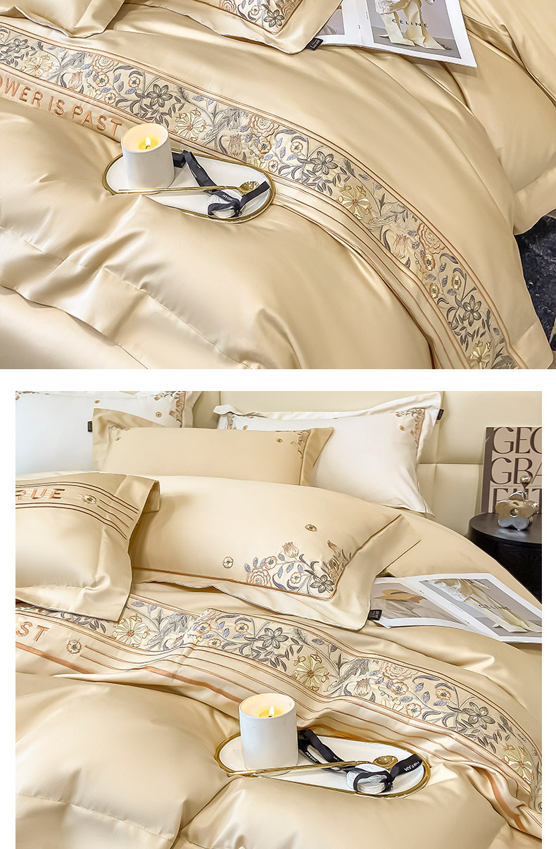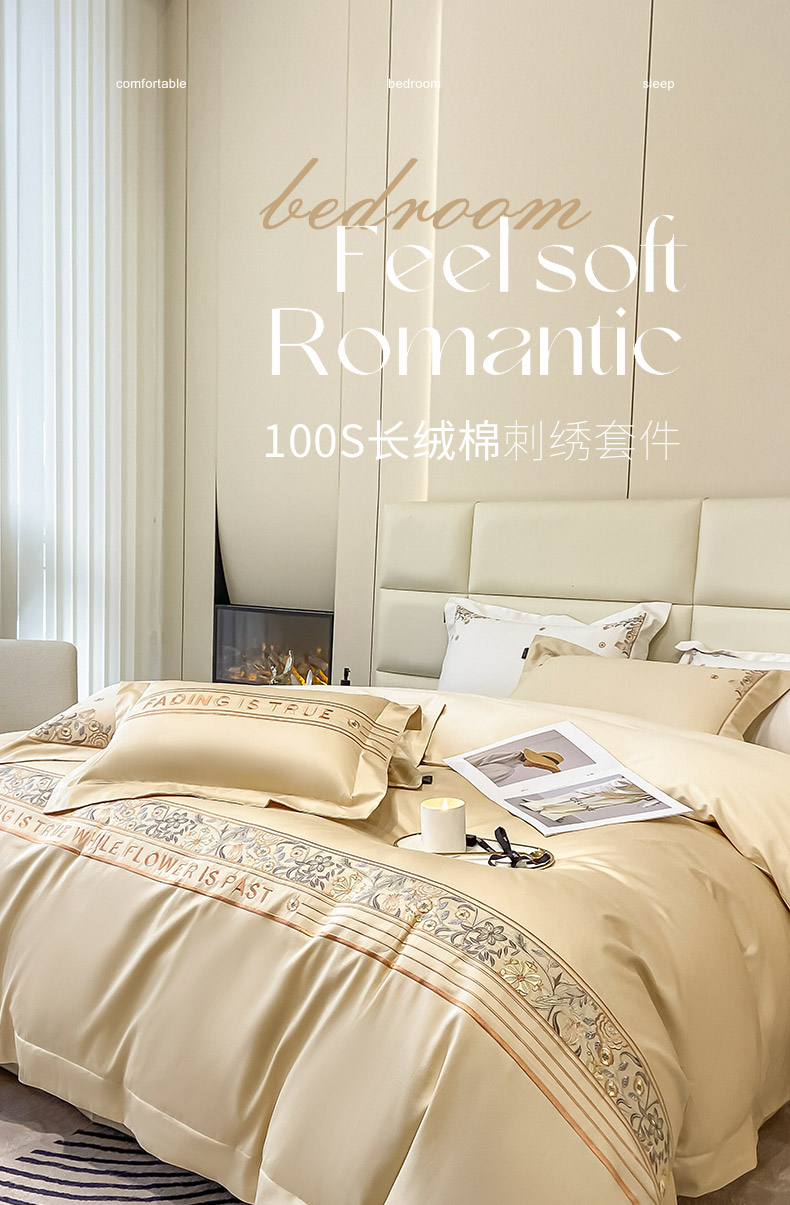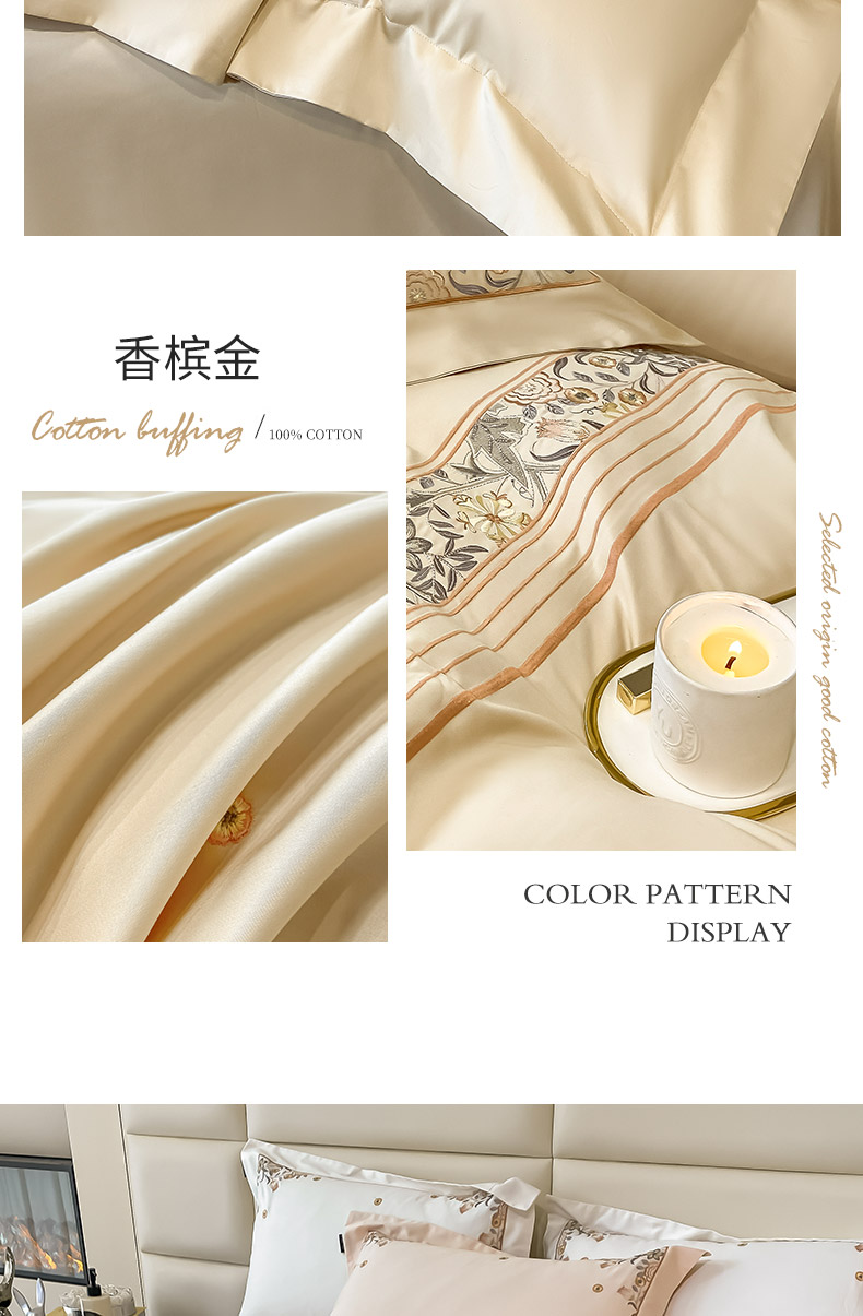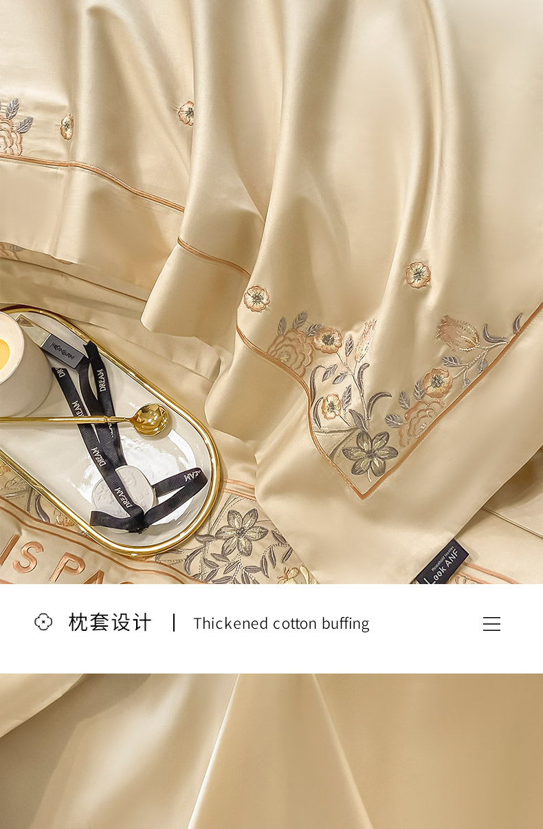 100支长绒棉四件套纯色天丝棉刺绣床单被套新疆棉轻奢4件套 盘西-香槟金