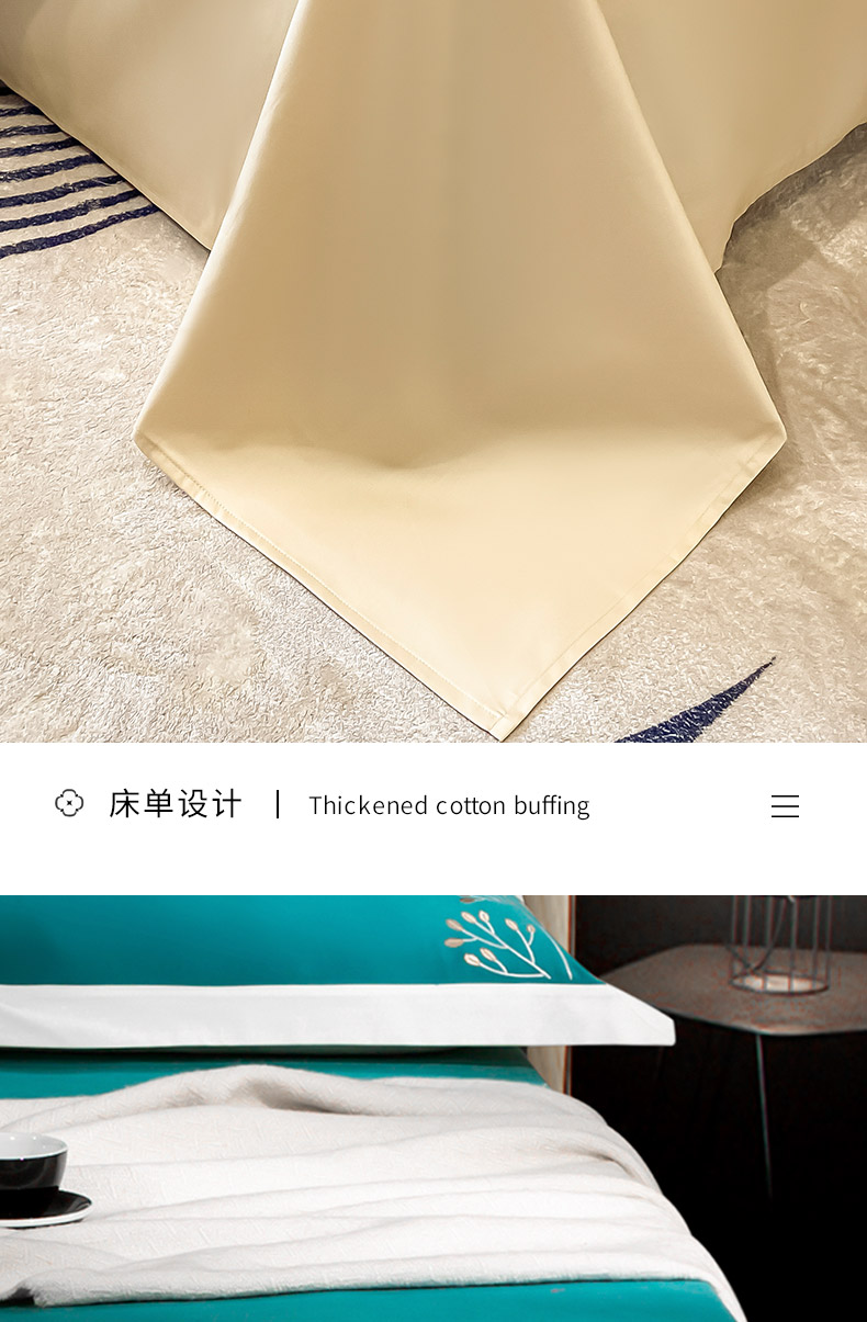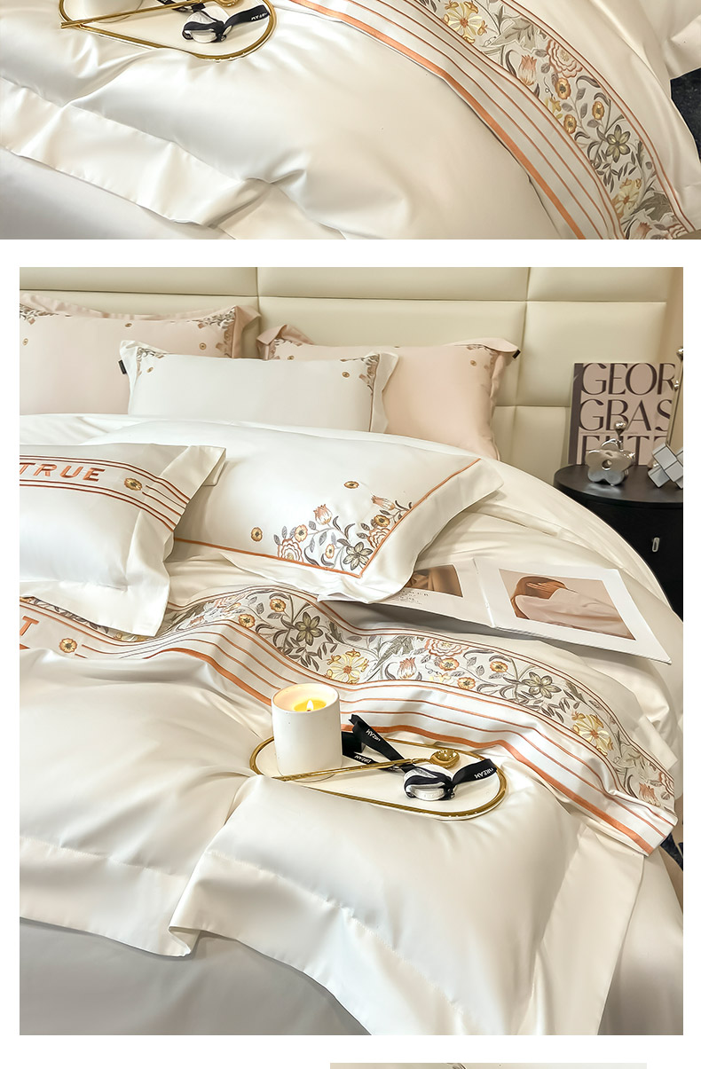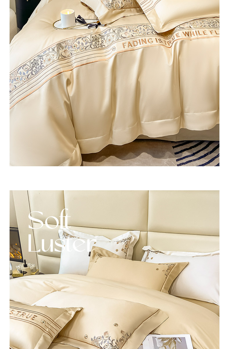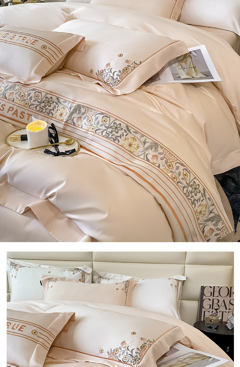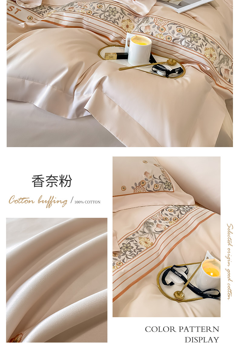 100支长绒棉四件套纯色天丝棉刺绣床单被套新疆棉轻奢4件套 盘西-香槟金