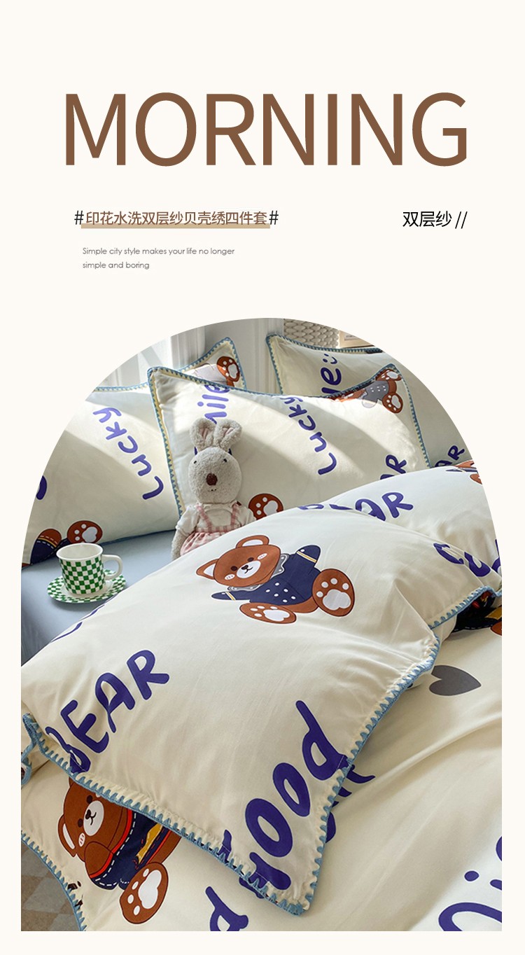 商品名称:妖妖家纺 2023印花水洗双层纱贝克绣四件套 字母熊