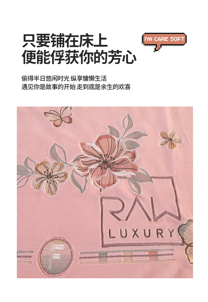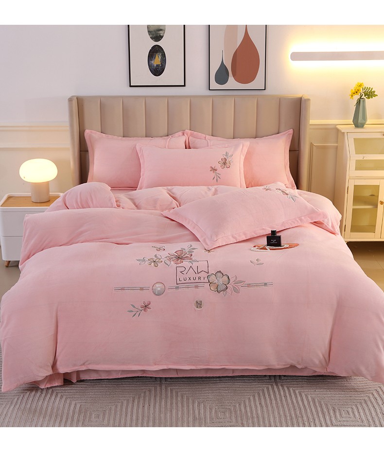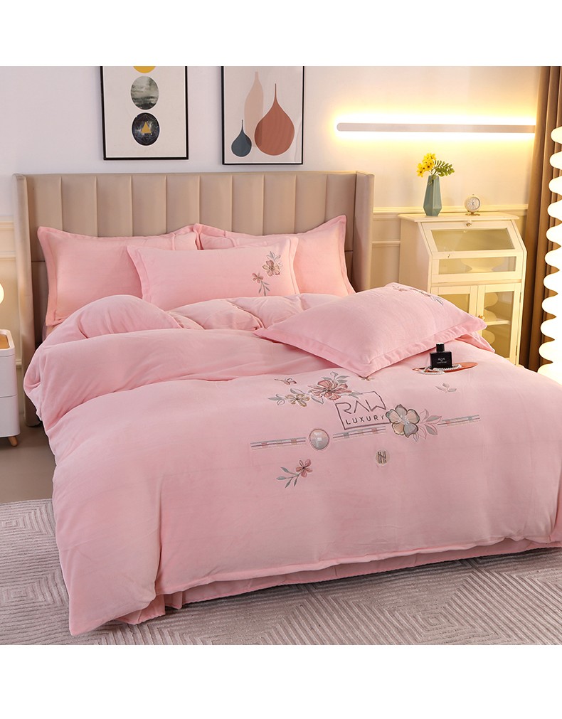 富之航 2023新款牛奶绒刺绣四件套 花香蝶影-粉