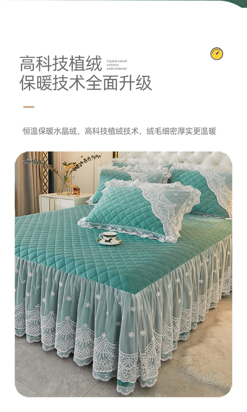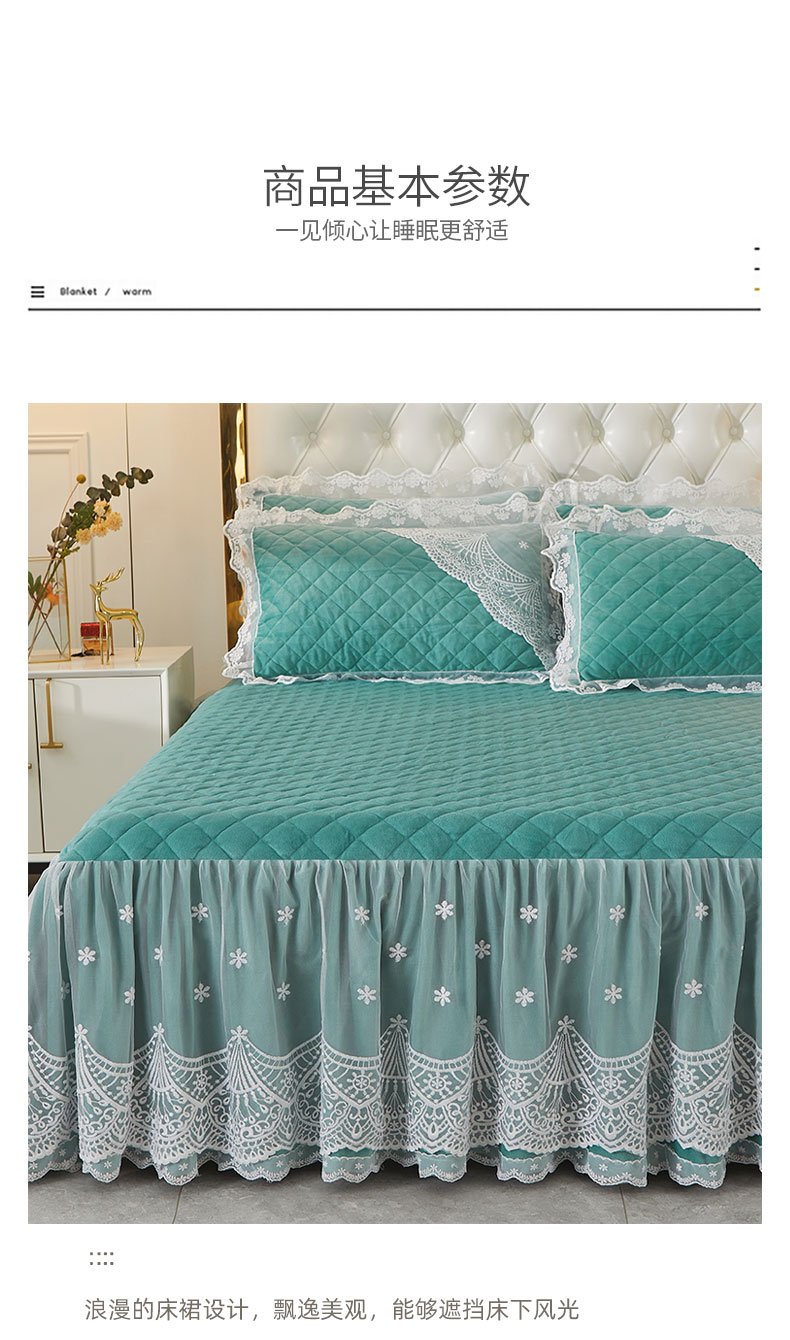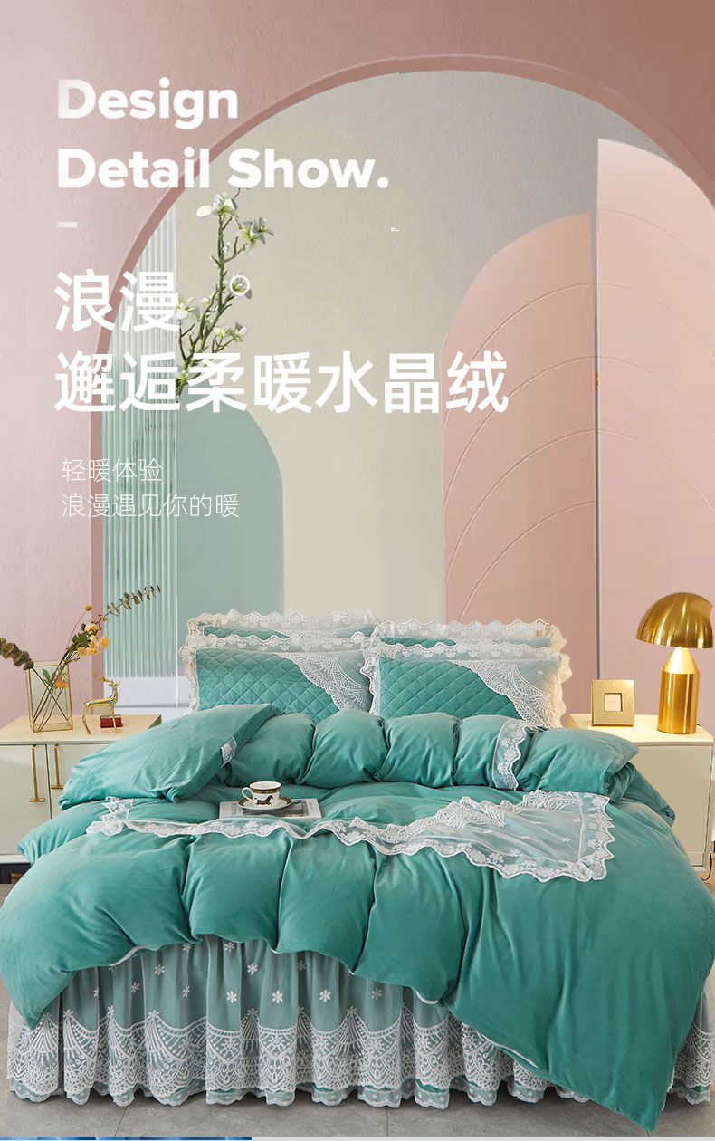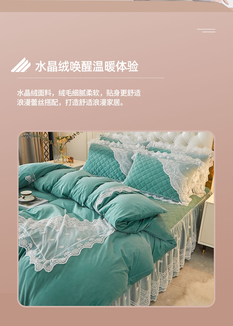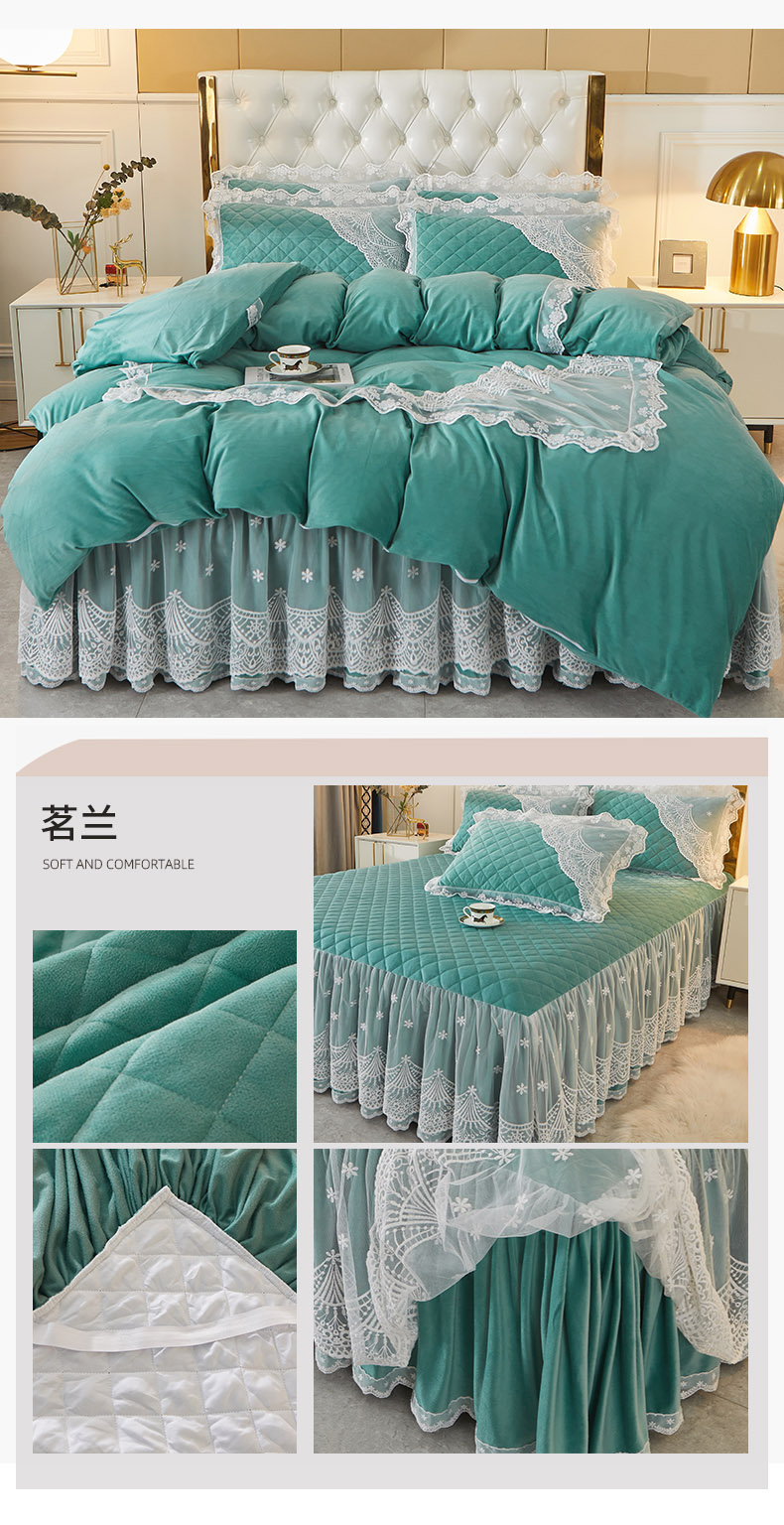 当前位置: 91家纺网 > 商品网购 > 床品套件 > 四件套 > 全棉普通四件套 > 2023新款水晶绒保暖床裙四件套爱妮系列 茗兰