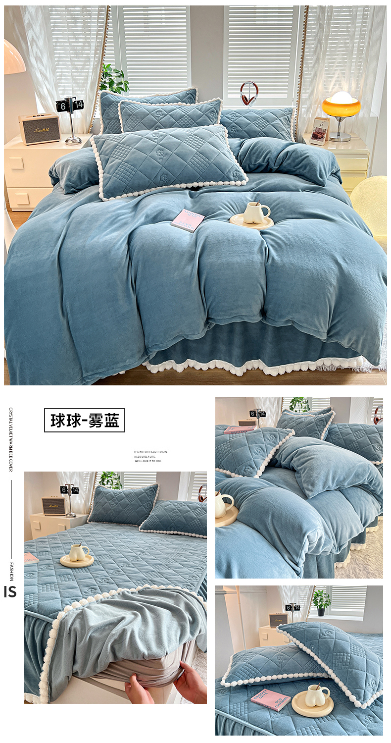 当前位置: 91家纺网 > 商品网购 > 床品套件 > 四件套 > 牛奶绒四件套 > 禧缘家纺(原梦想家) 2024新款球球夹棉床裙式床笠牛奶绒四件套 球球-雾蓝