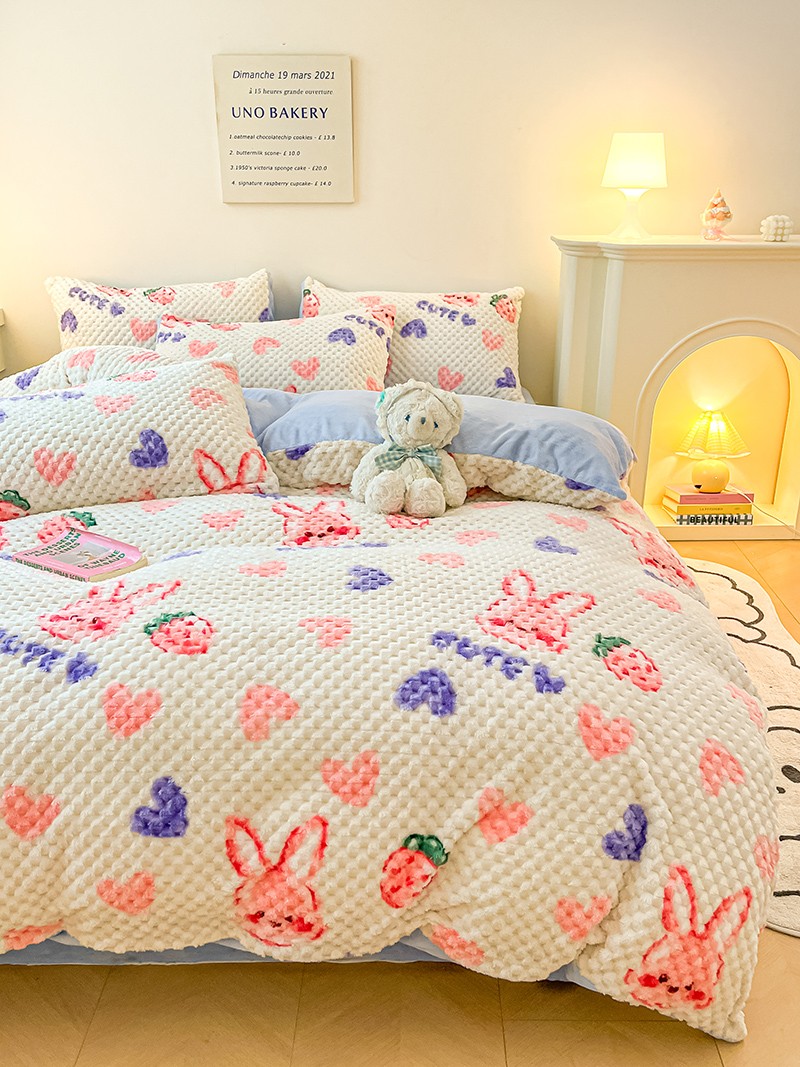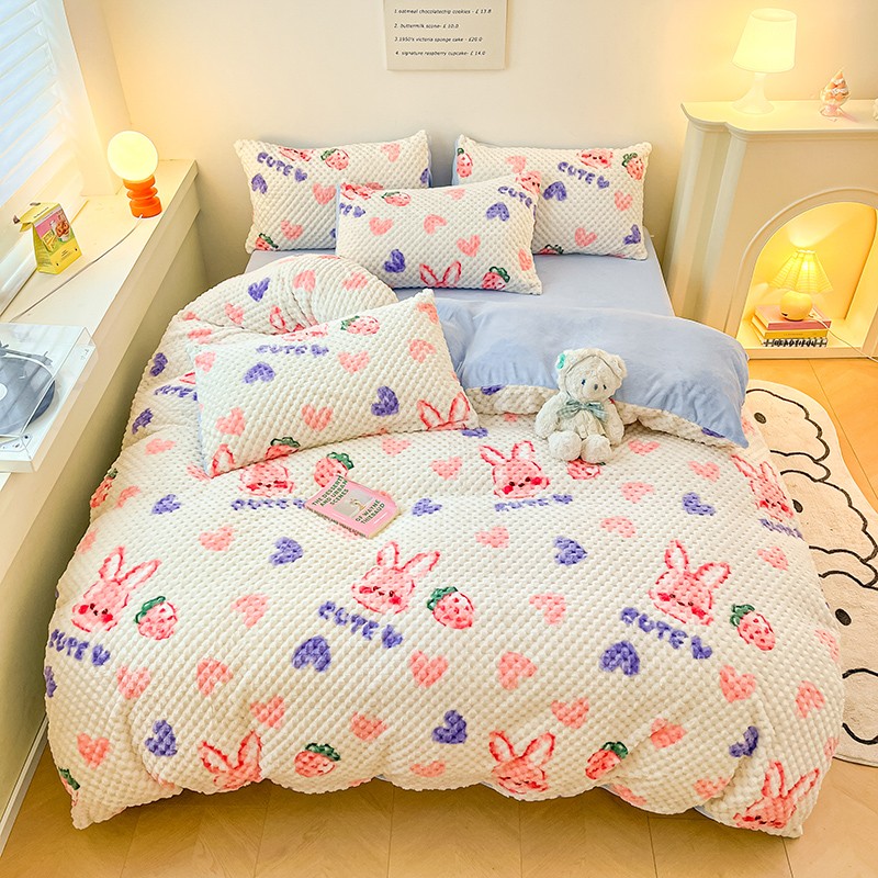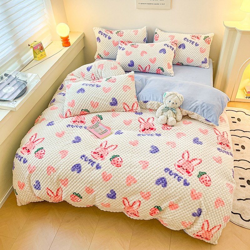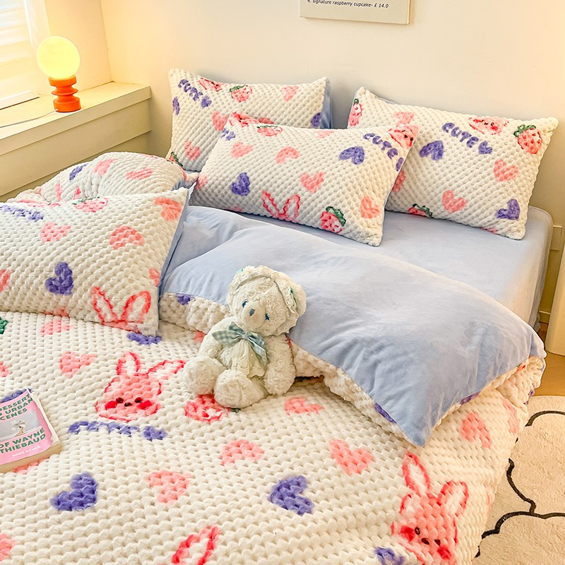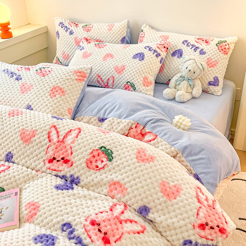 澳梵家居 2023新款印花豆豆绒牛奶绒四件套 爱心草莓兔