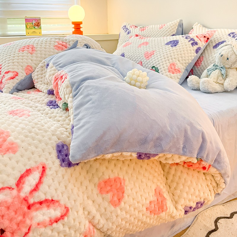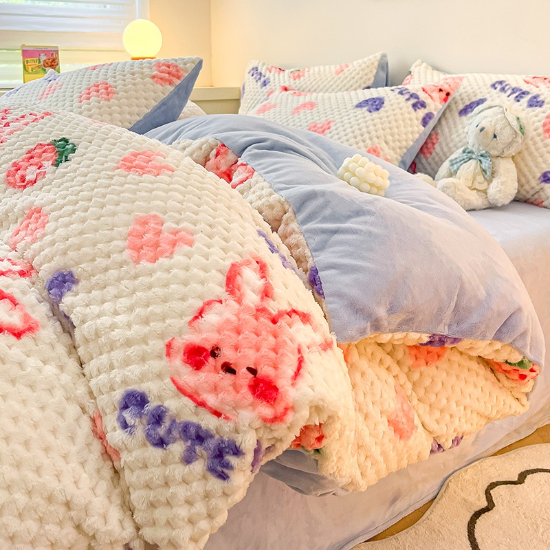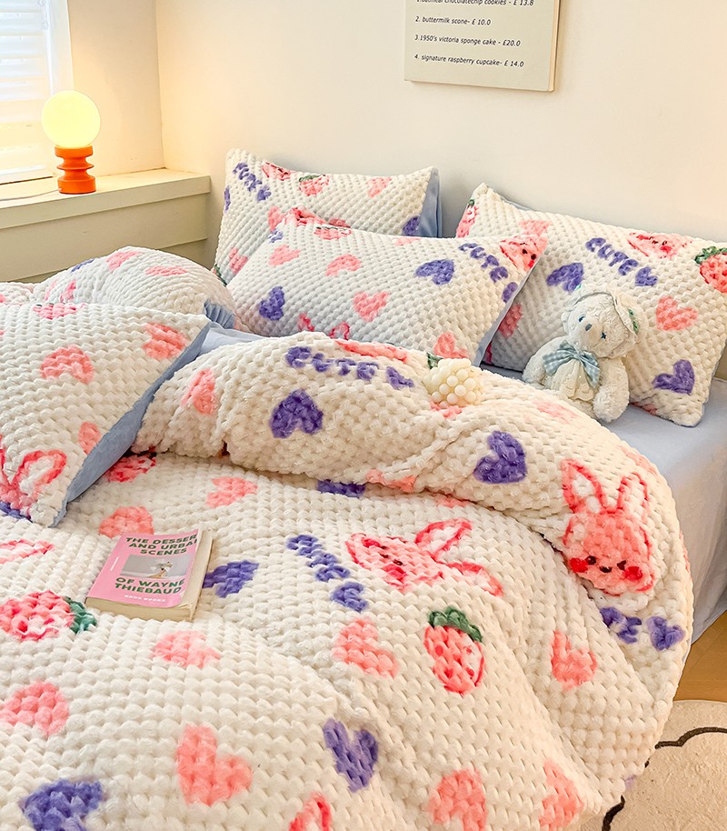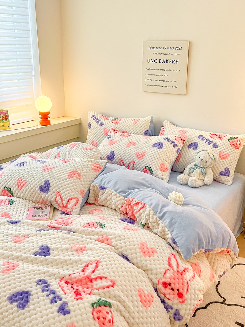 澳梵家居 2023新款印花豆豆绒牛奶绒四件套 爱心草莓兔