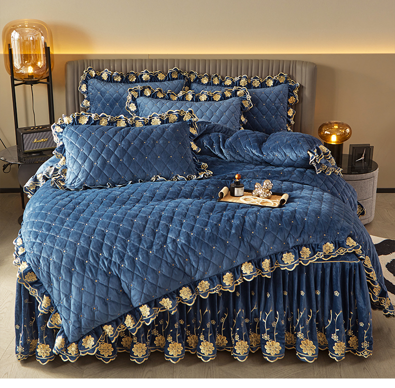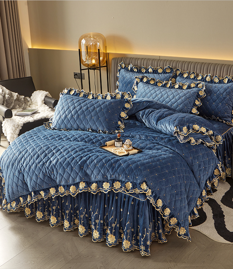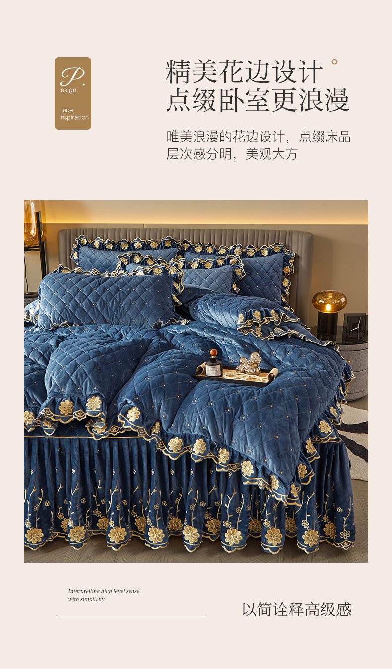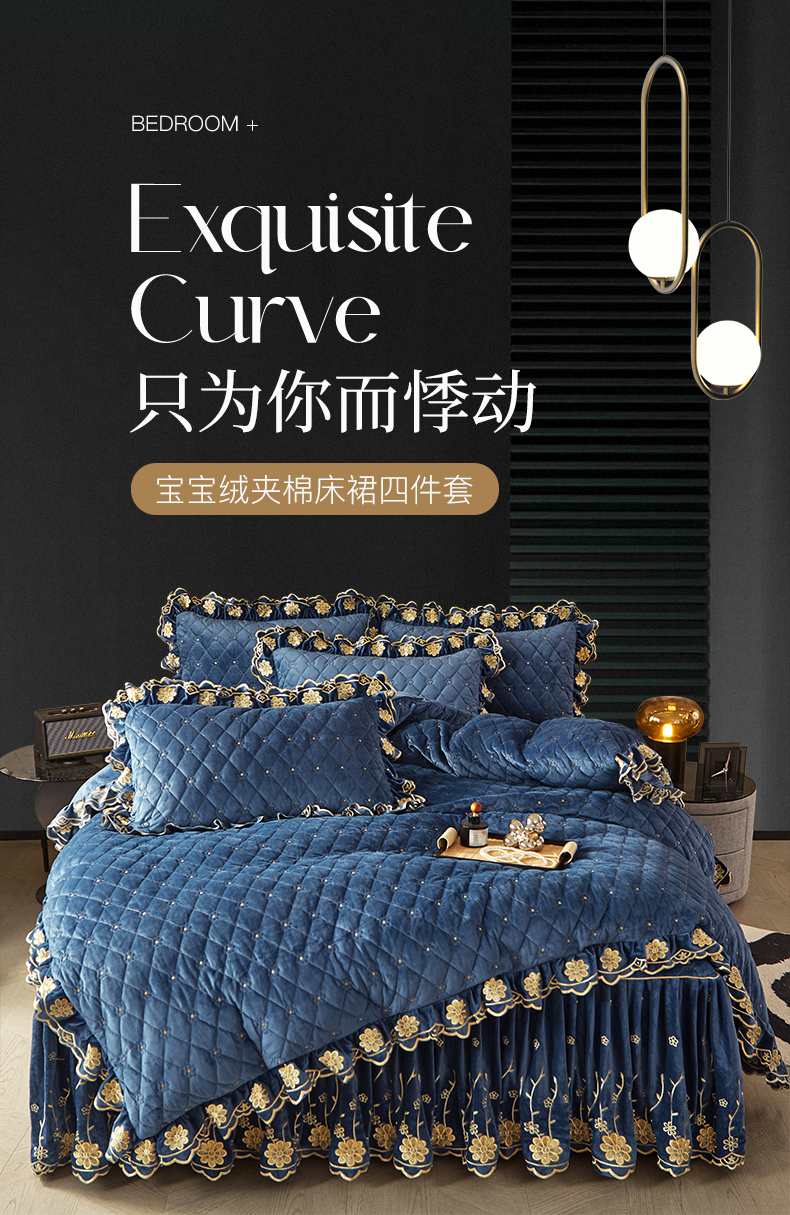 当前位置: 91家纺网 > 商品网购 > 床品套件 > 四件套 > 宝宝绒四件套 > 罗艺轩 2024新款花季宝宝绒全套夹棉絎缝加厚系列床裙套件 宝石蓝