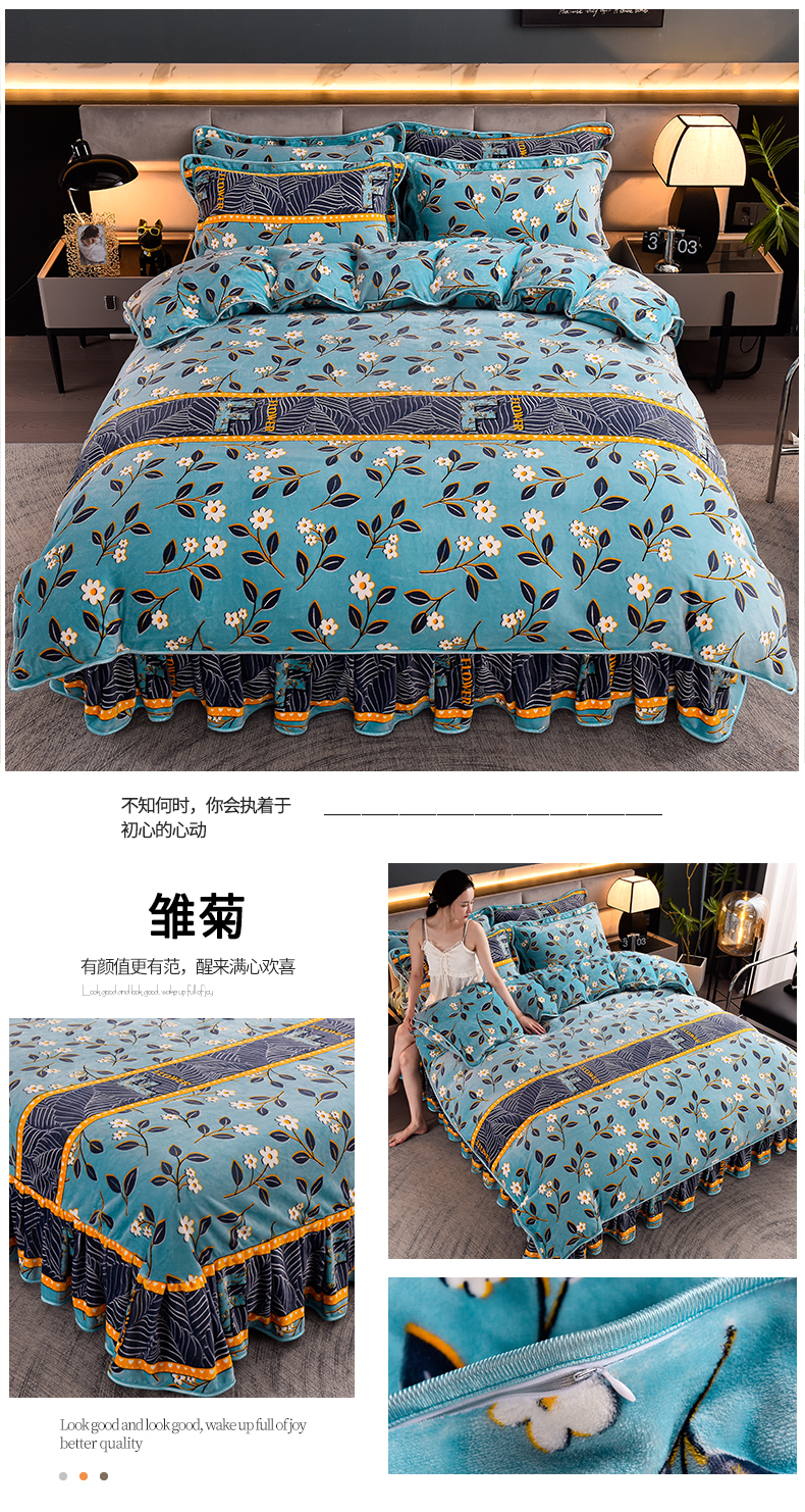 商品名称:盈超2023新款A类高克重印花牛奶绒金貂绒床裙款保暖绒四件套 雏菊