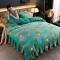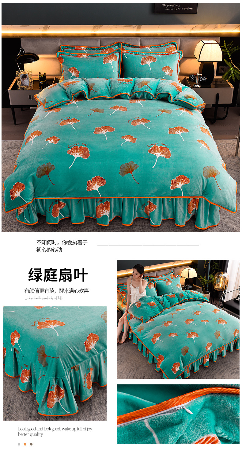 商品名称:盈超2023新款A类高克重印花牛奶绒金貂绒床裙款保暖绒四件套 绿庭扇叶