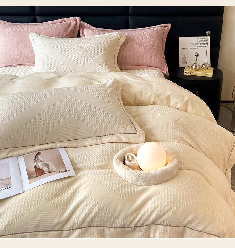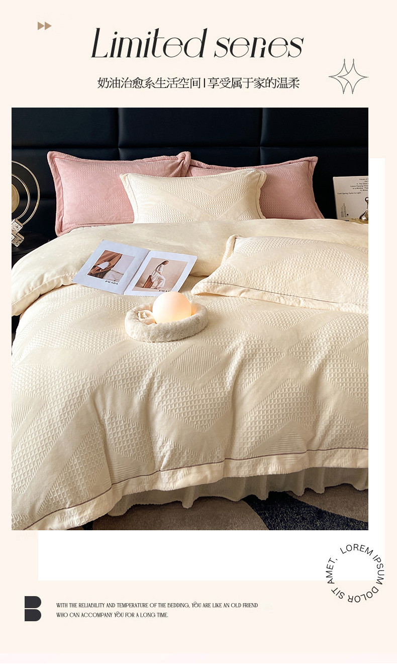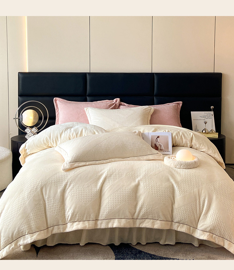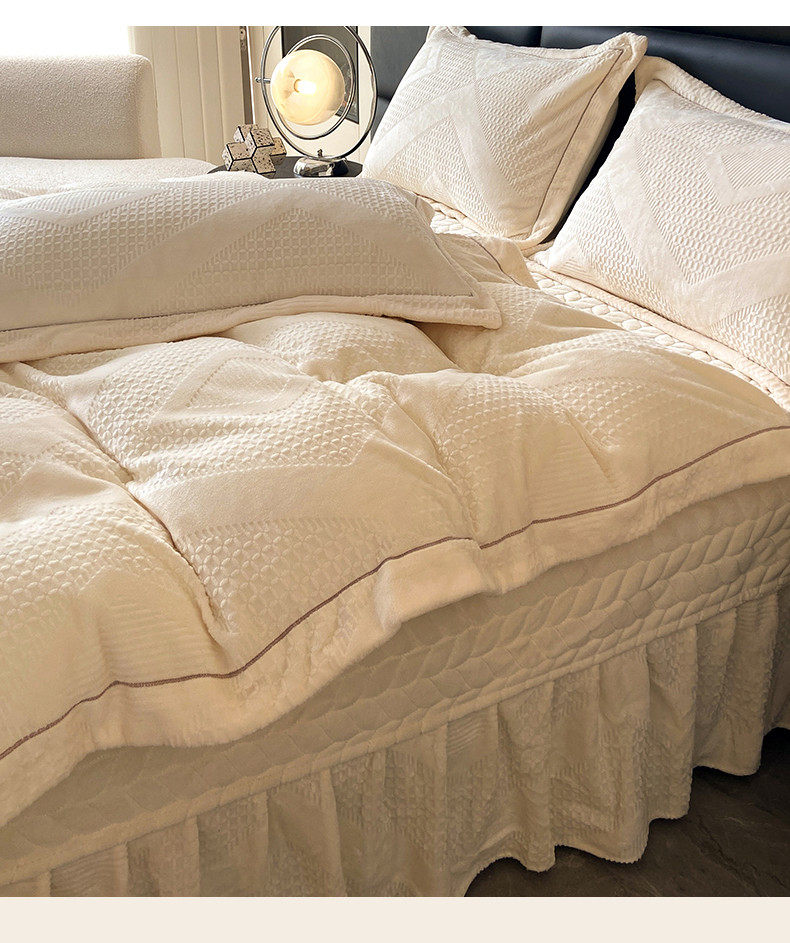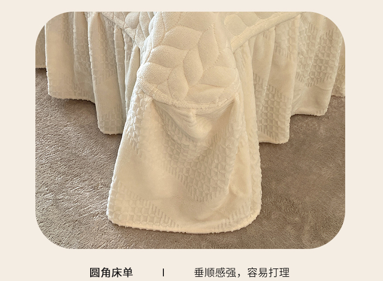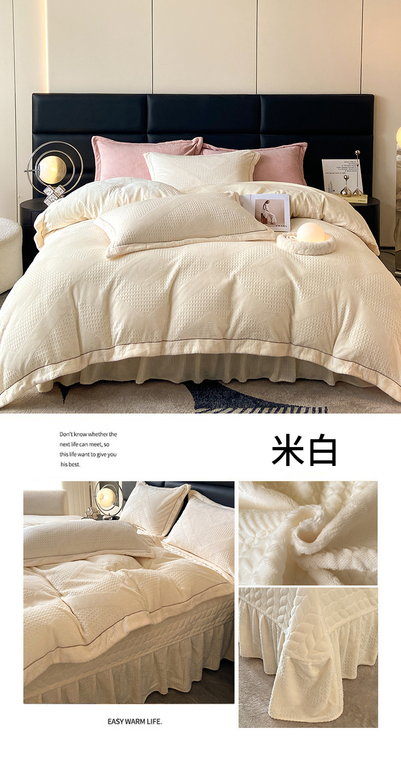 美伦美焕2023新款纯色立体雕花牛奶绒床盖四件套床裙款式 米白