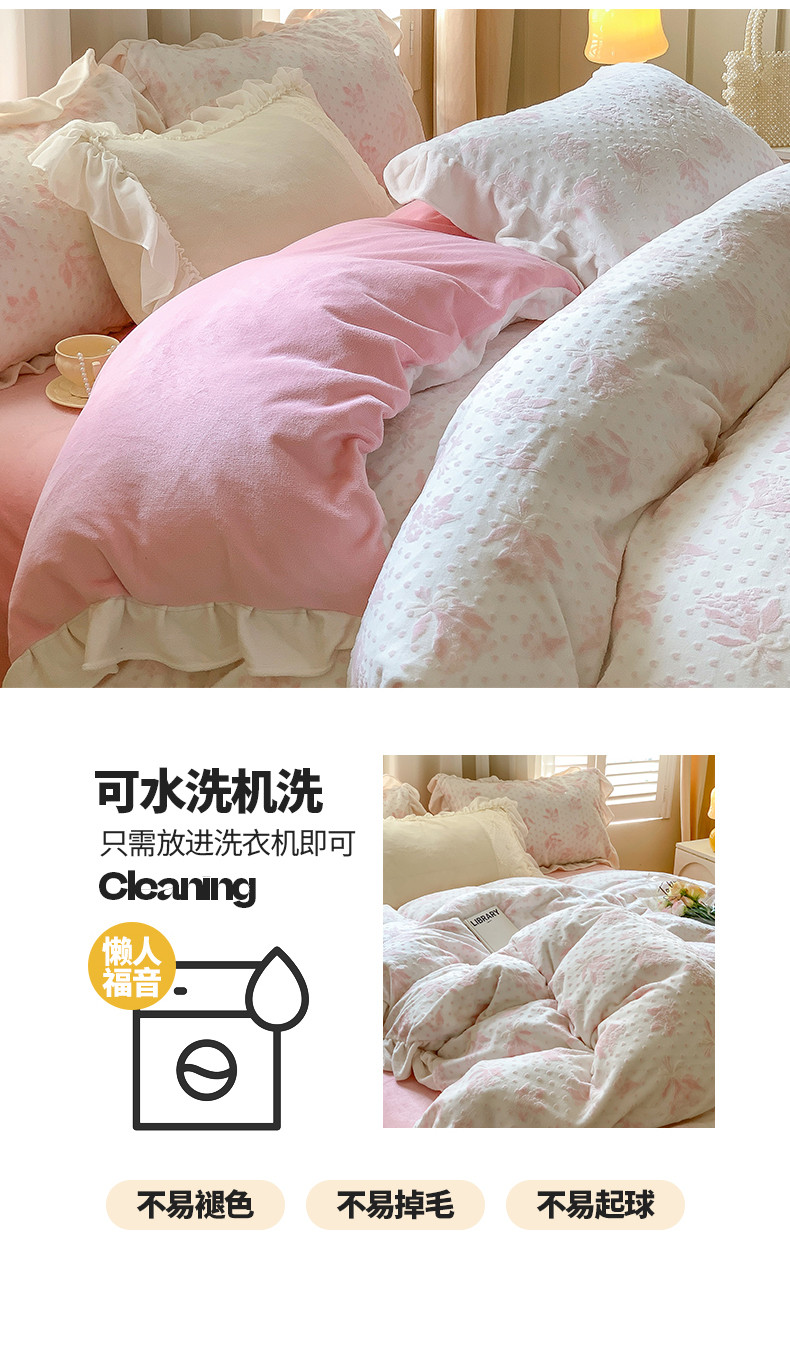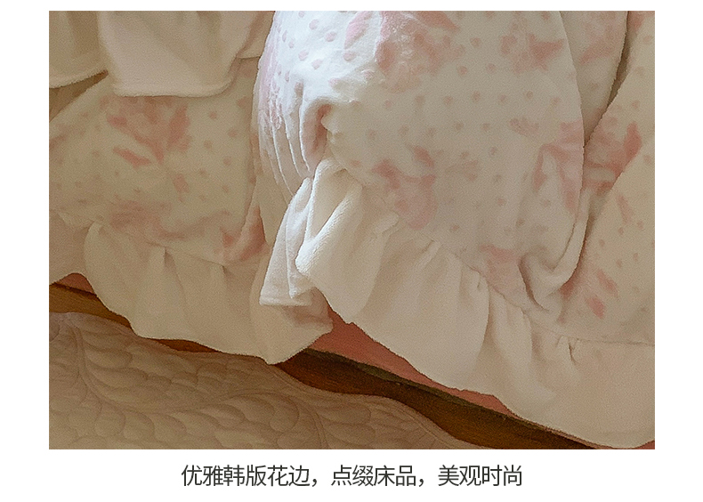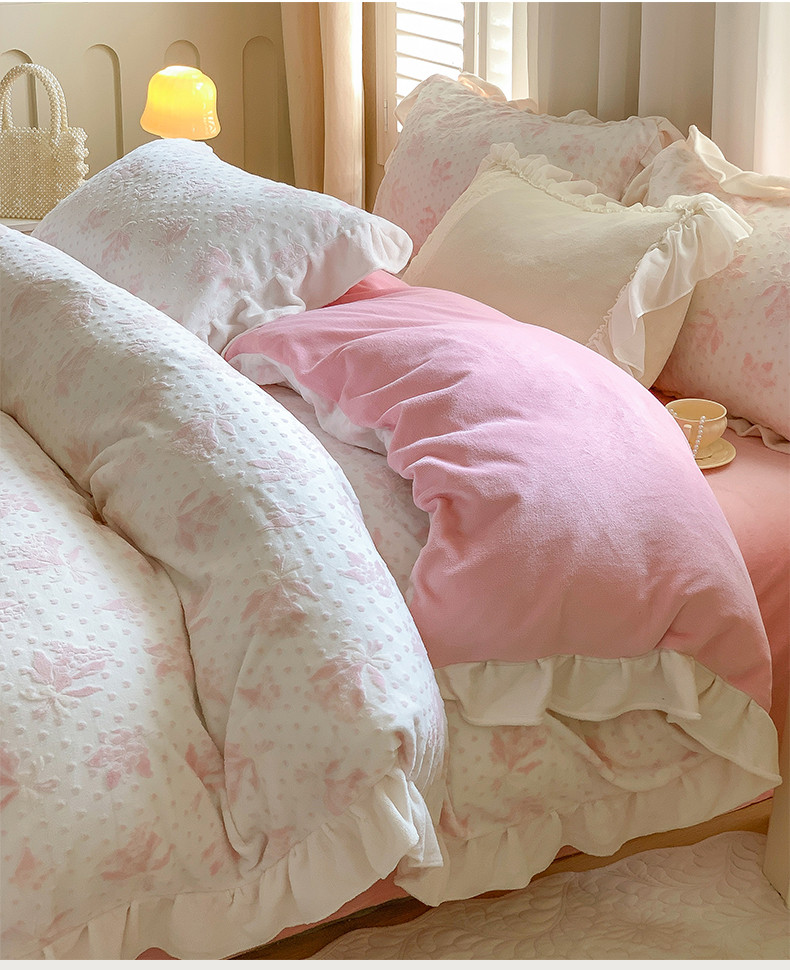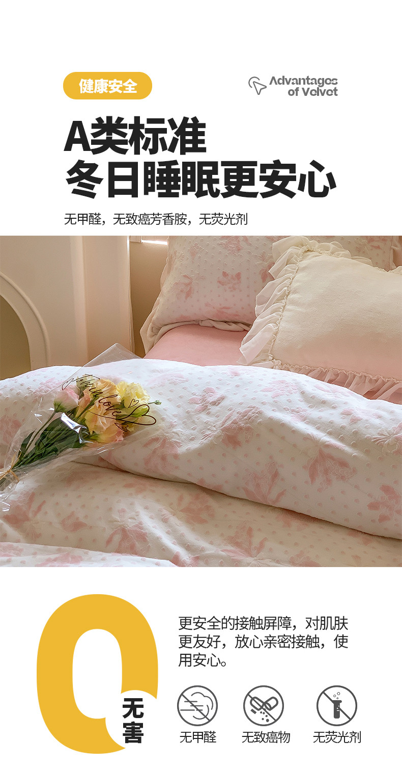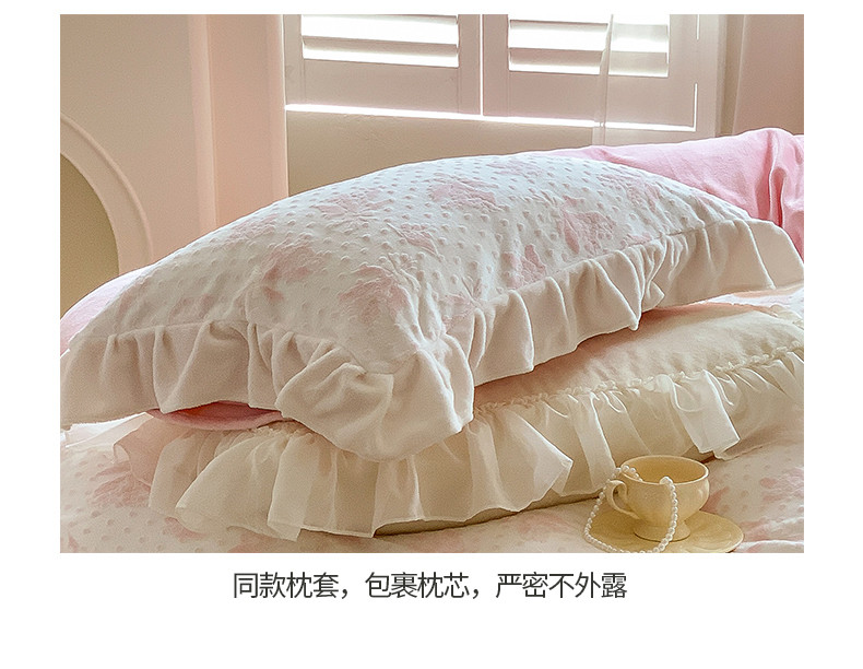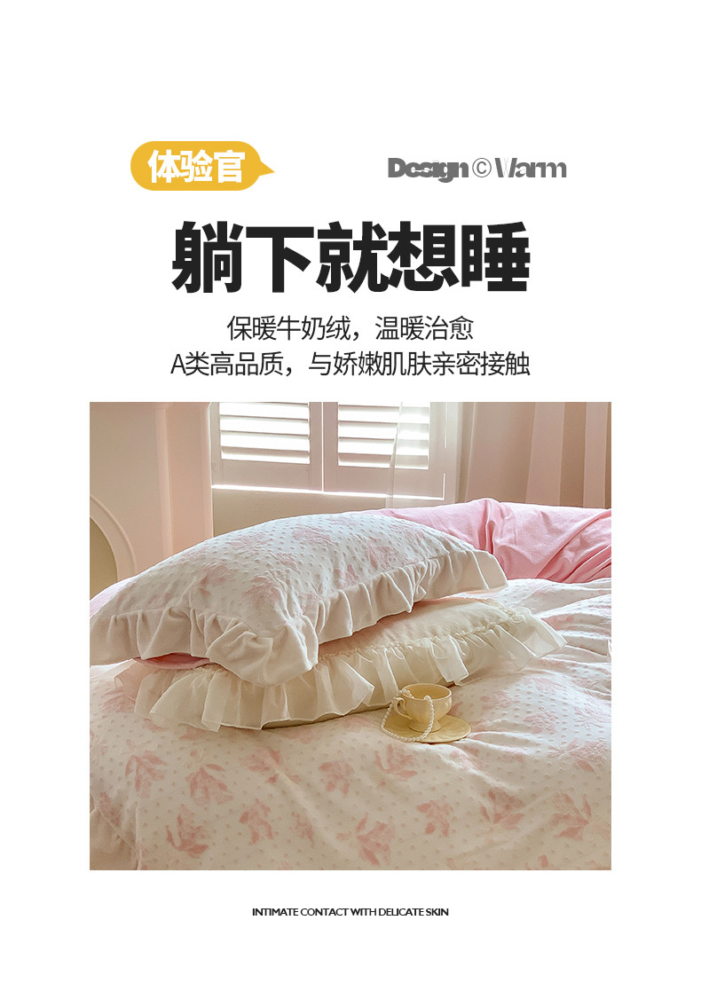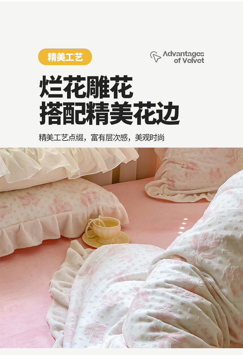 商品名称:桃子家居 2023新款A类高克重ins花边3D立体韩版牛奶绒四件套 绒烂花-温妮粉玉
