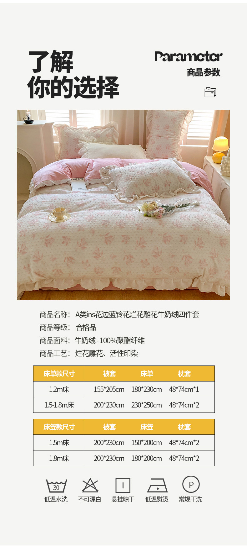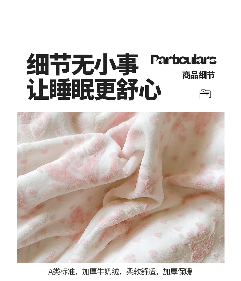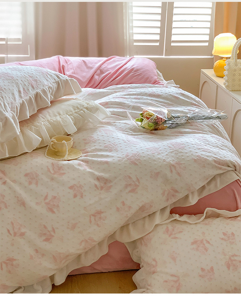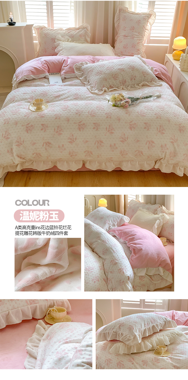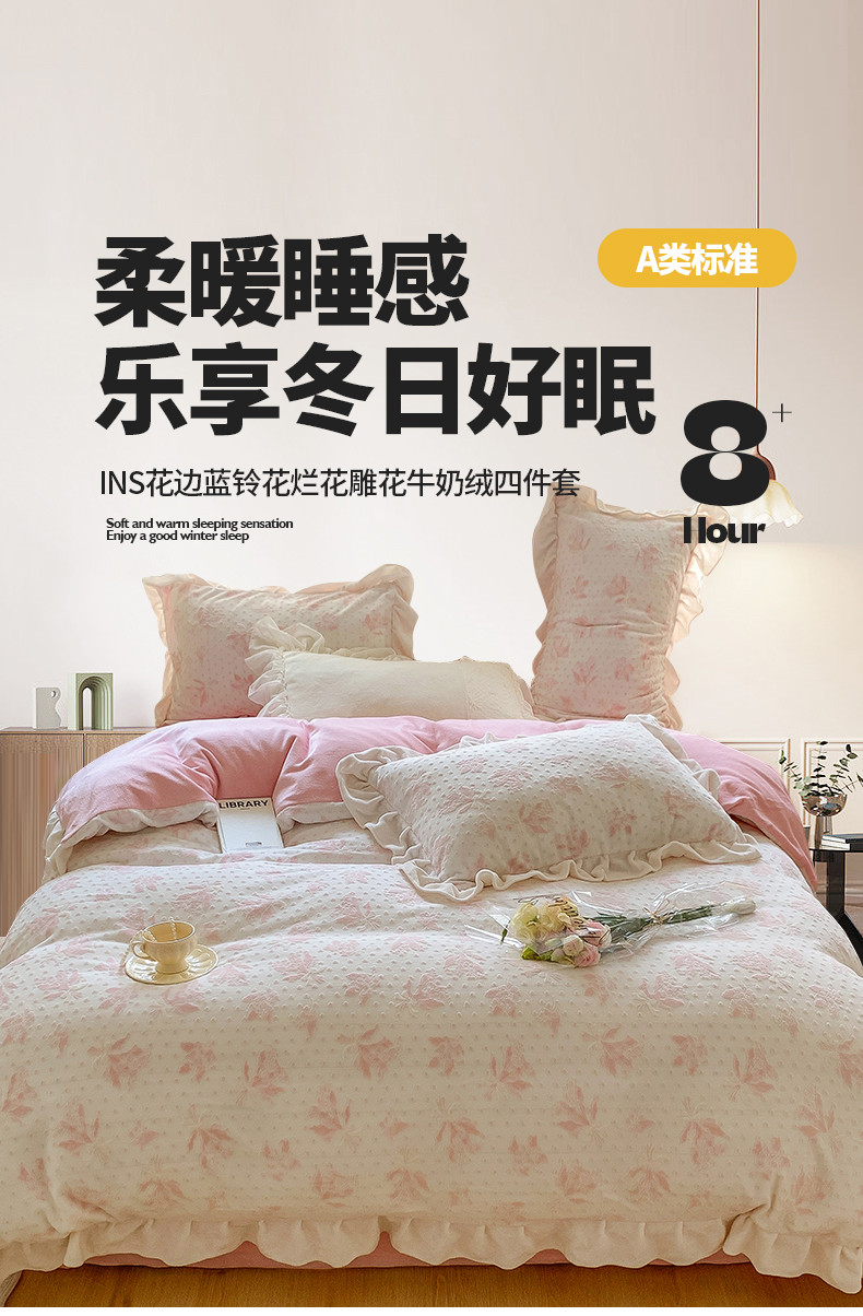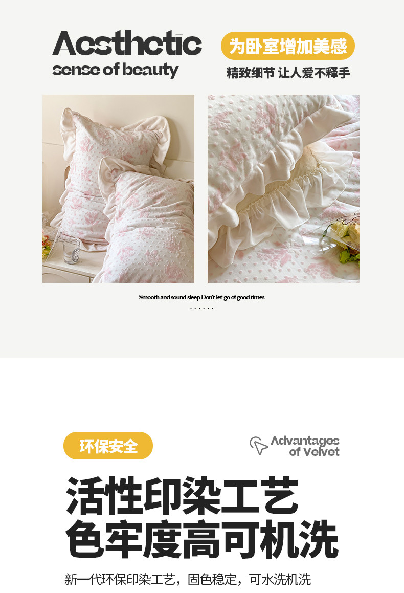 商品名称:桃子家居 2023新款A类高克重ins花边3D立体韩版牛奶绒四件套 绒烂花-温妮粉玉
