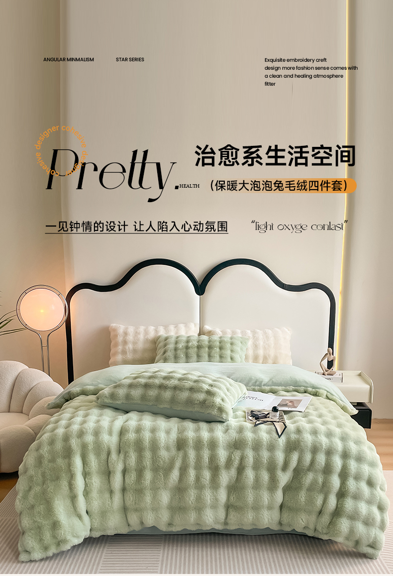 寐居家纺 2023新款高克重大泡泡兔毛绒四件套系列 抹茶绿
