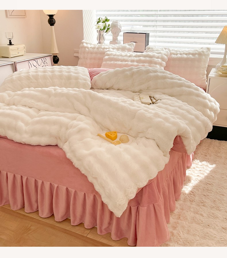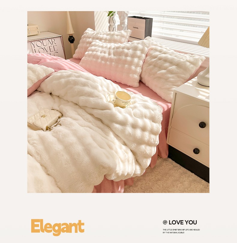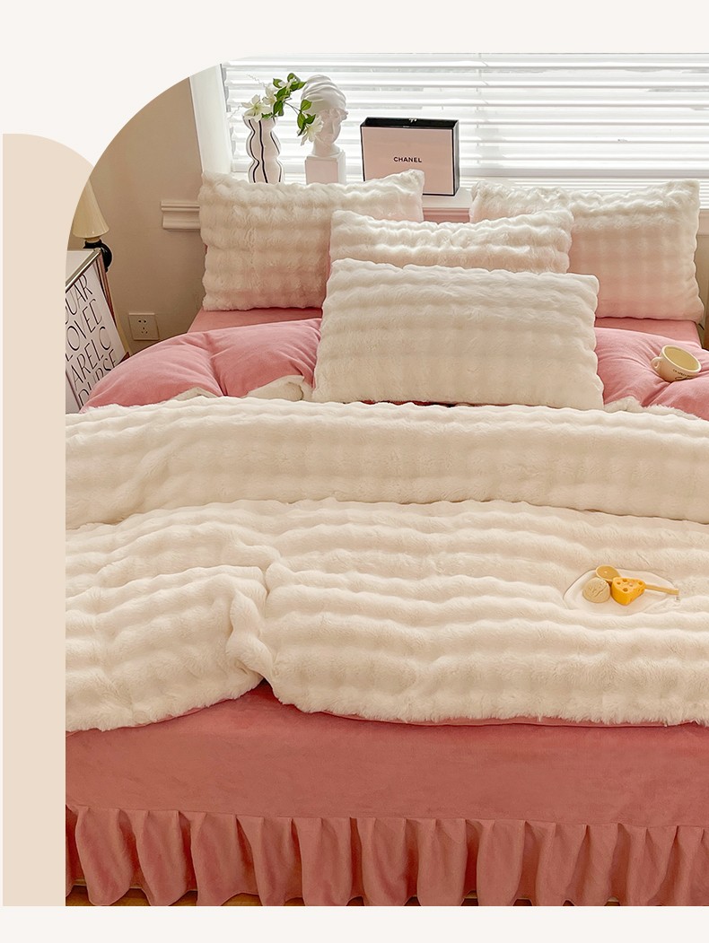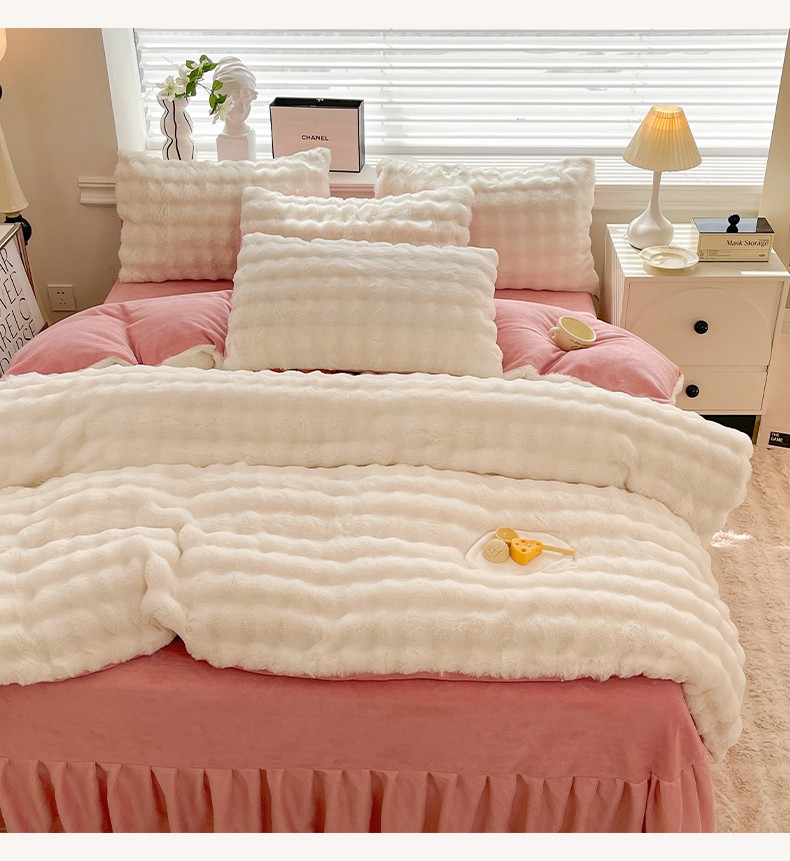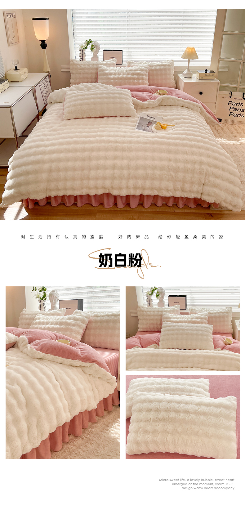 当前位置: 91家纺网 > 商品网购 > 床品套件 > 四件套 > 兔毛绒四件套 > 逸尚阁 2024新款加厚泡泡兔绒四件套 奶白粉