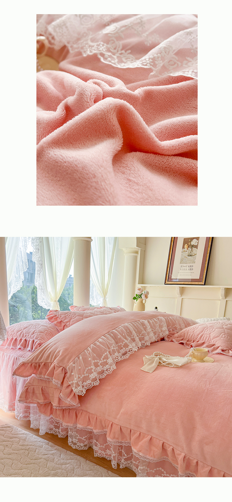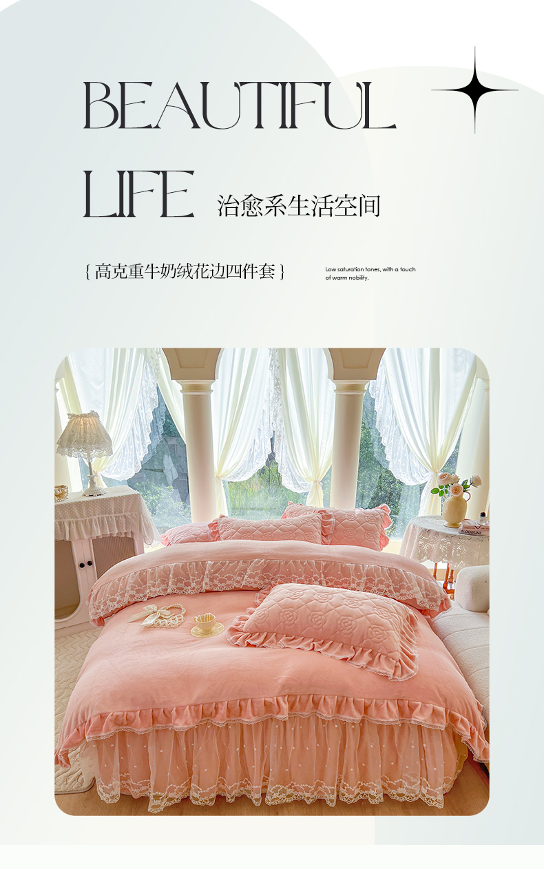 当前位置: 91家纺网 > 商品网购 > 床品套件 > 四件套 > 牛奶绒四件套 > 网红馆 2025新款高克重牛奶绒花边床裙四件套-山茶系列 山茶-粉