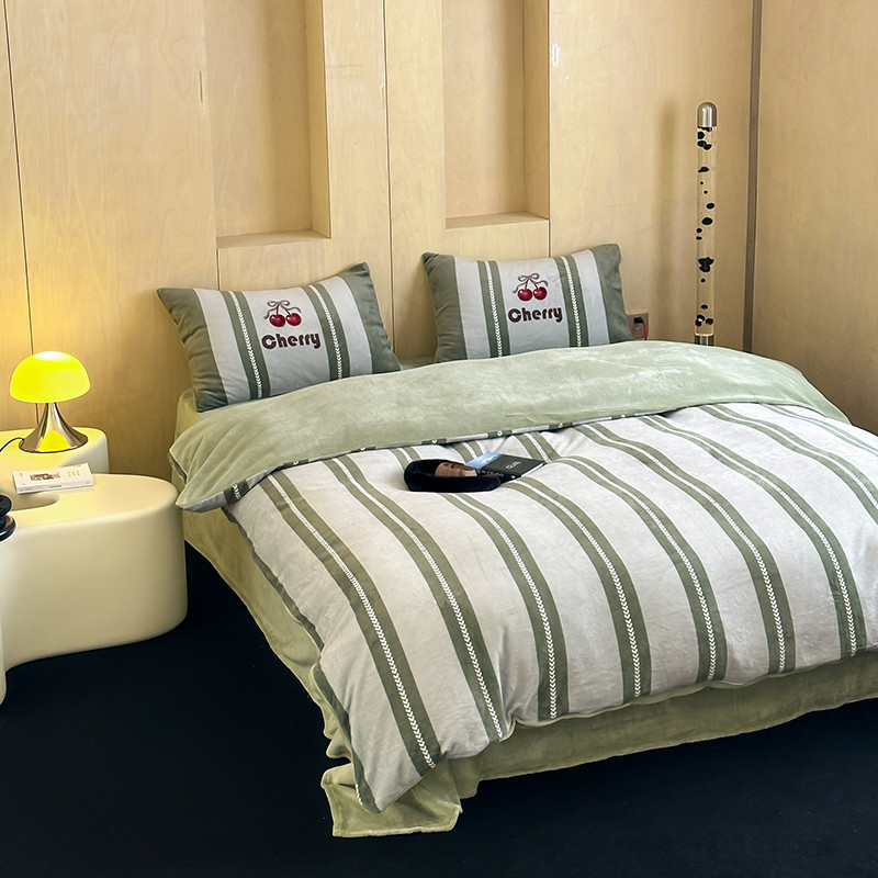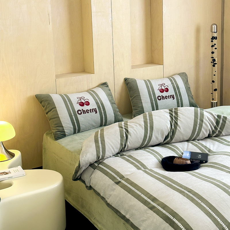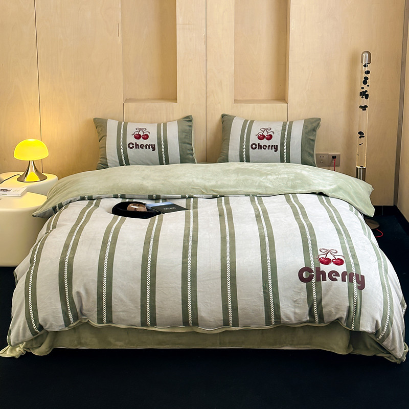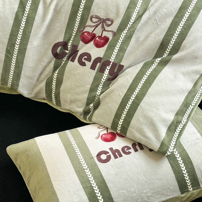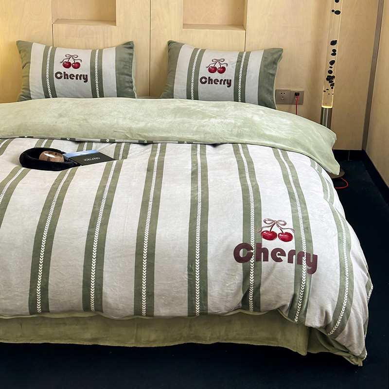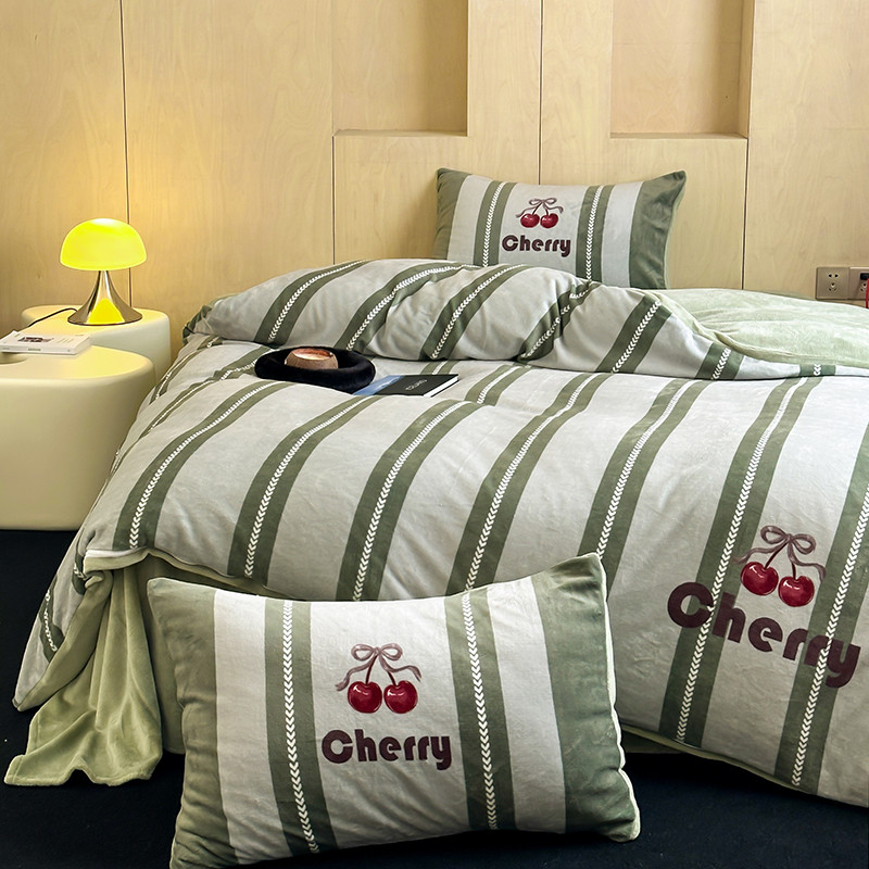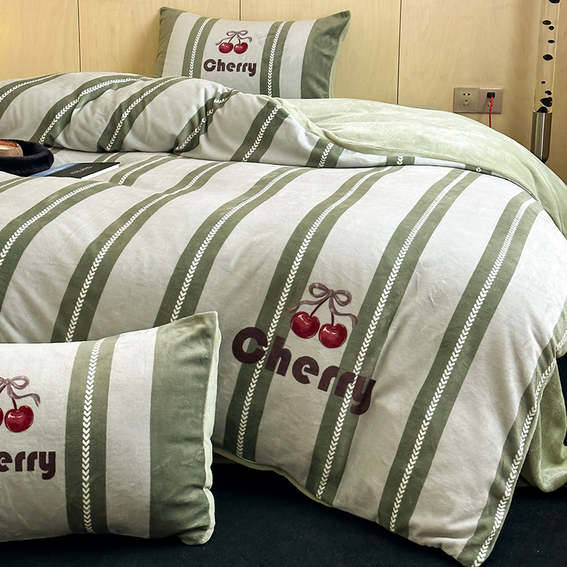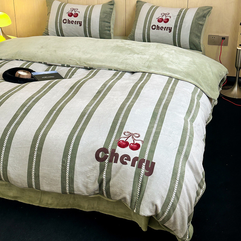 昔可 2023新款大版数码印花牛奶绒四件套 复古丝带樱桃