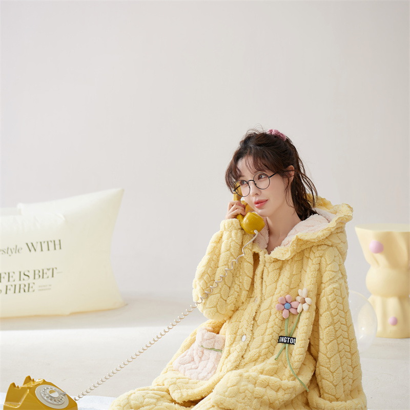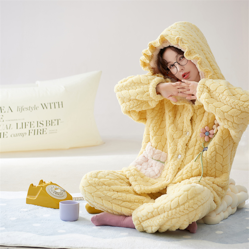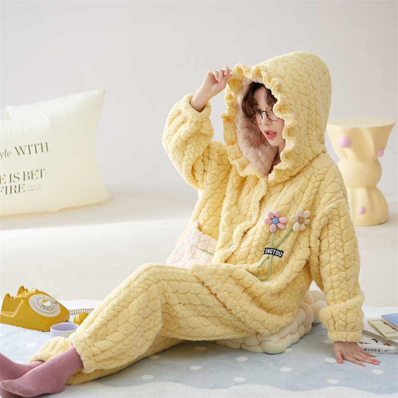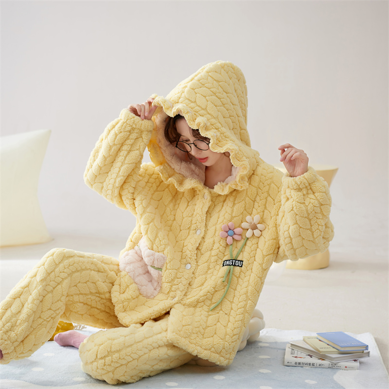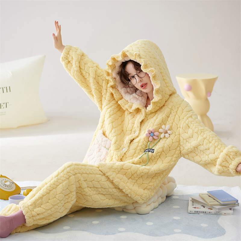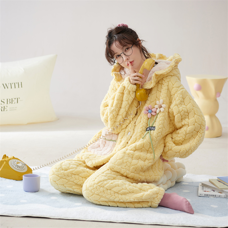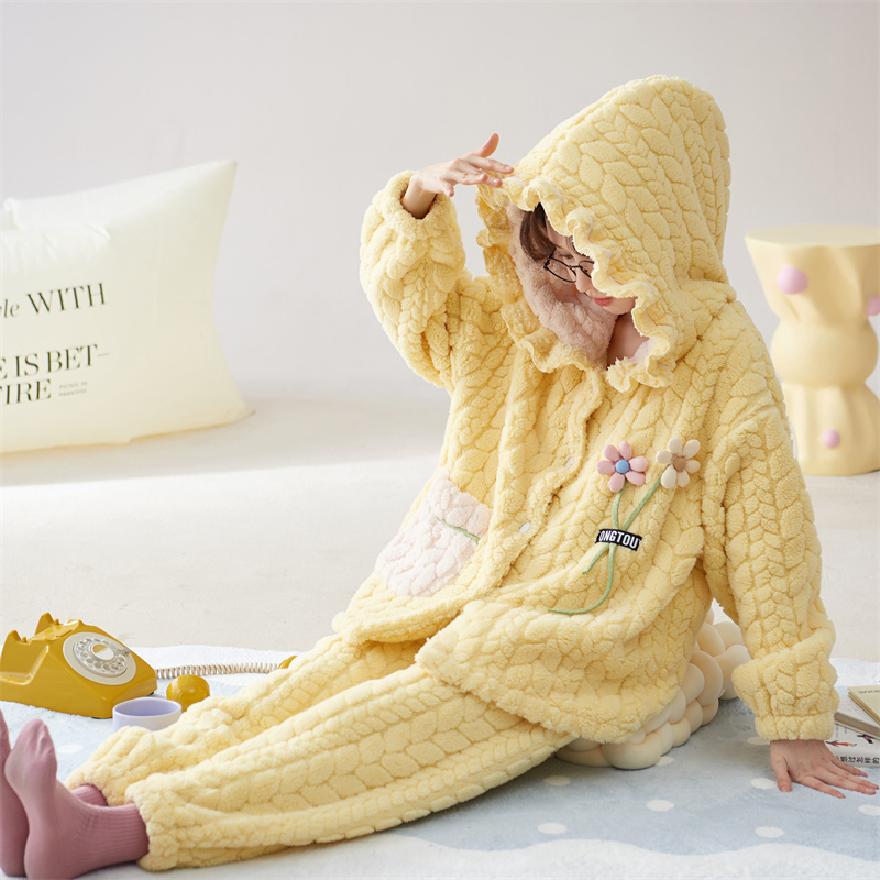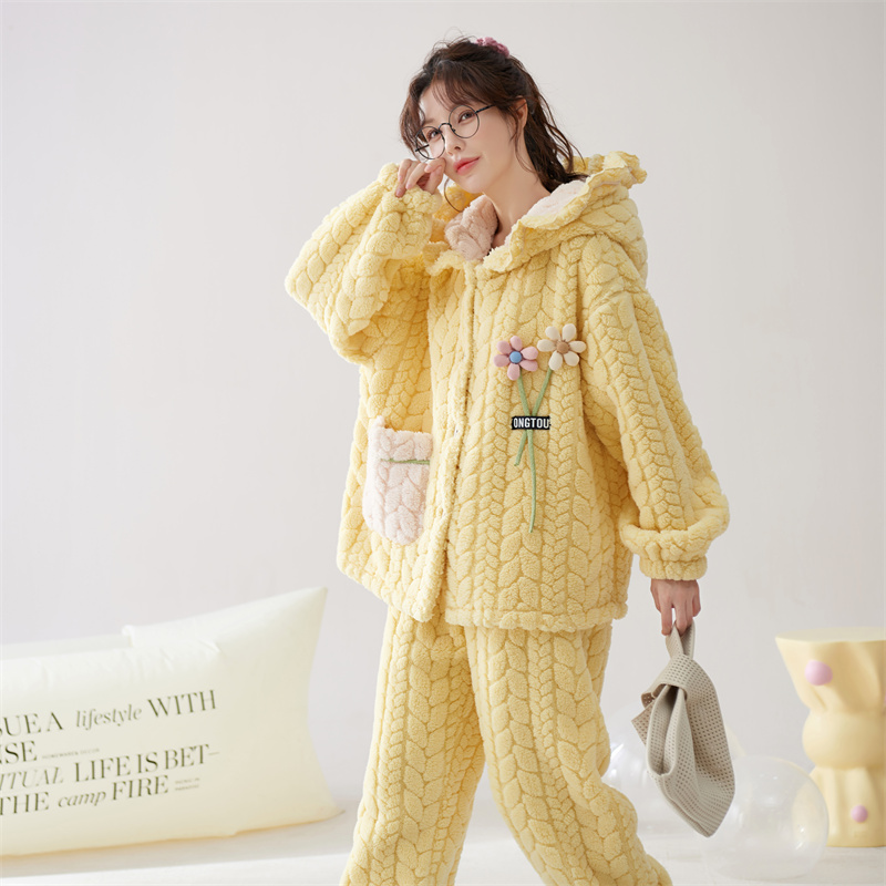 (总)洛兰沙家居馆 2024秋冬新款清新睡衣女三层夹棉玉兔绒加厚保暖两件套女士可外穿加绒家居服,粉色,黄色