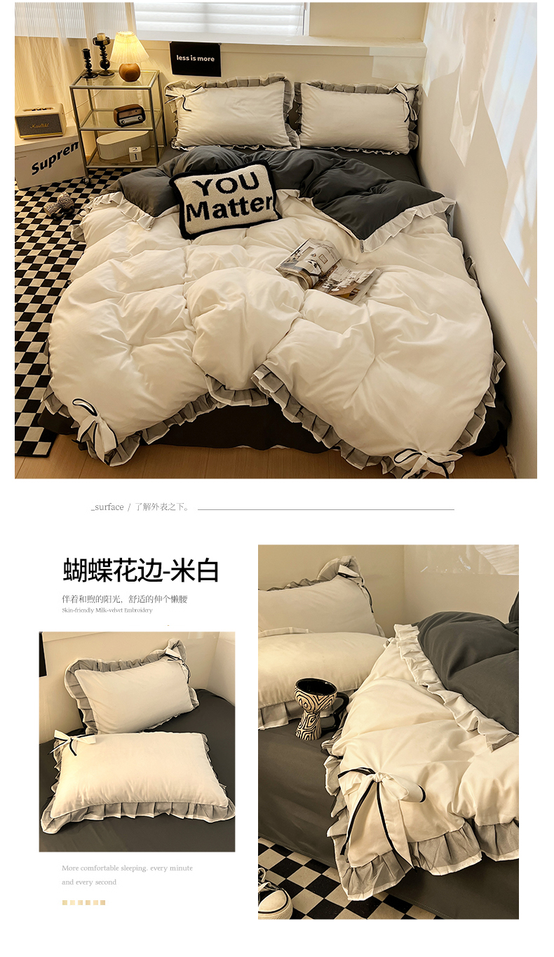 当前位置: 91家纺网 > 商品网购 > 床品套件 > 四件套 > 磨毛活性四件套 > 春光里 2024新款蝴蝶结花边磨毛四件套 蝴蝶花边-米白