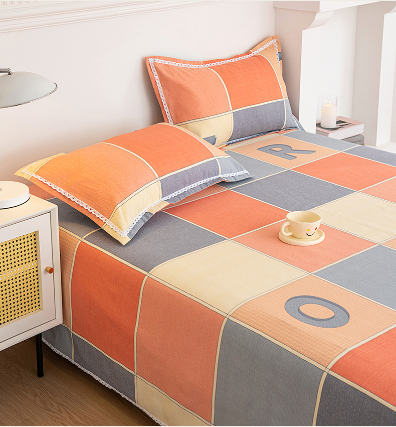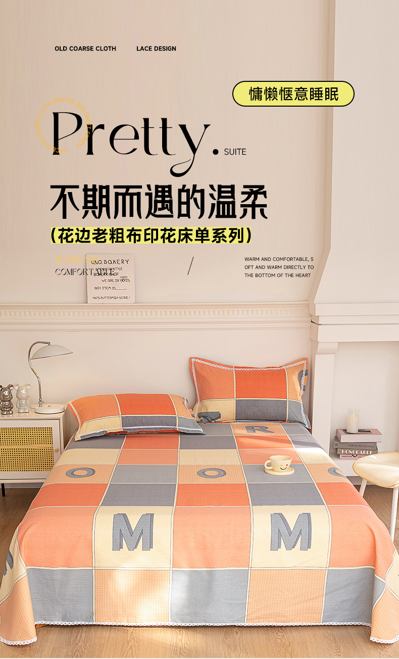 首爱家纺 2025新款花边老粗布印花床单系列套件 字母风格
