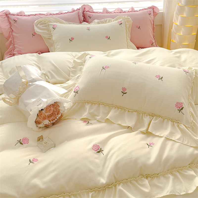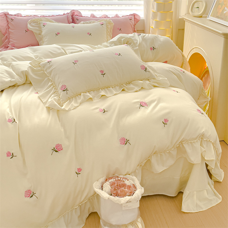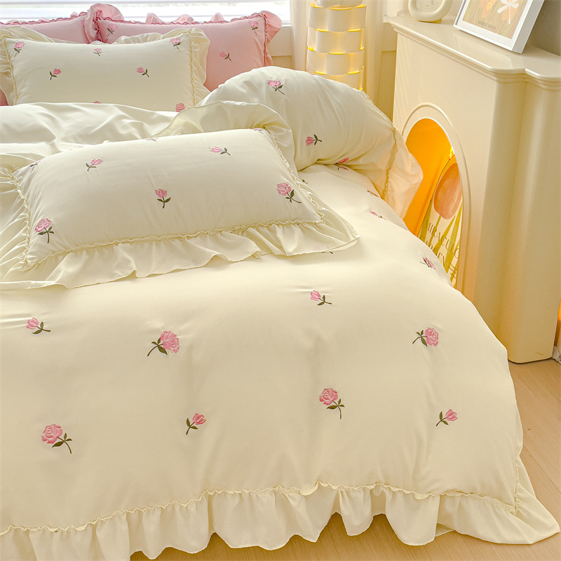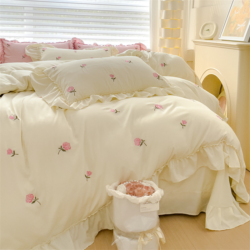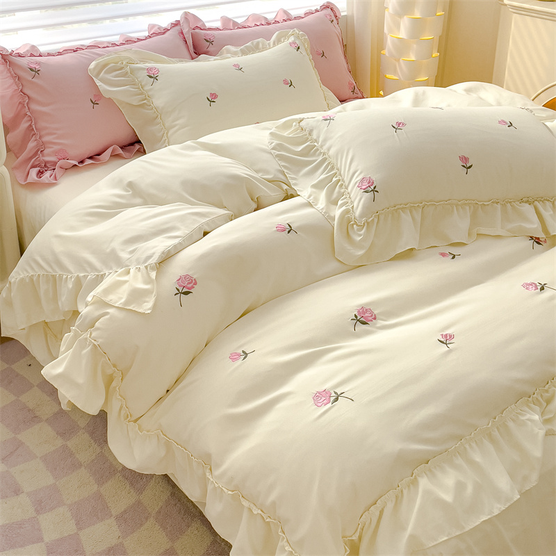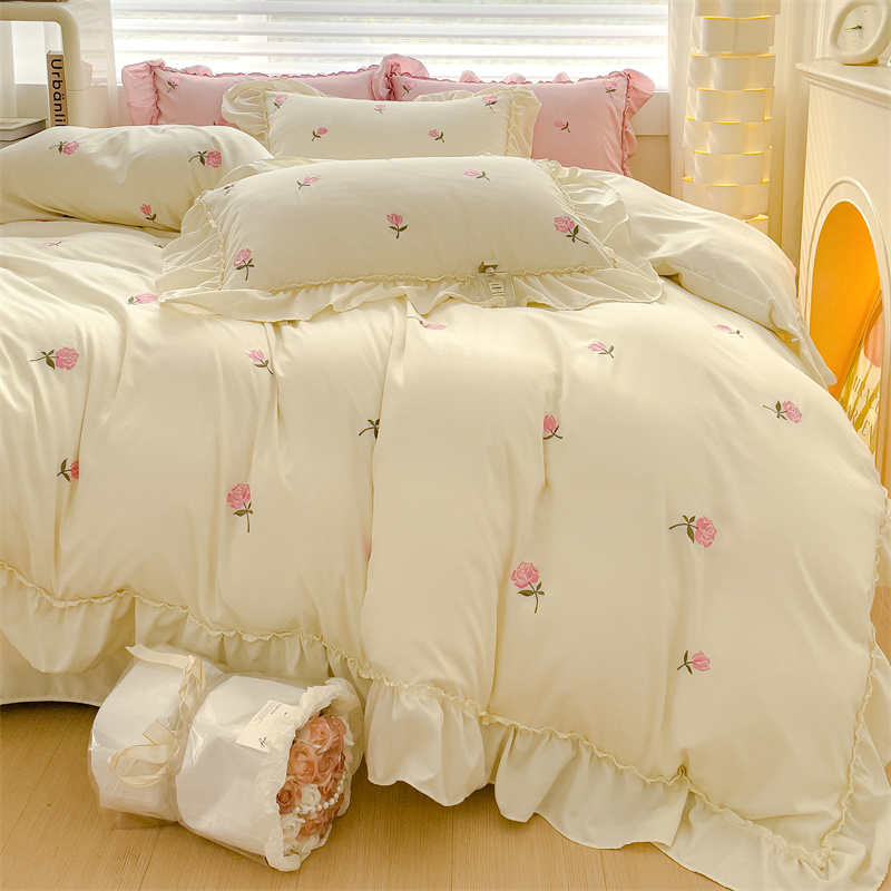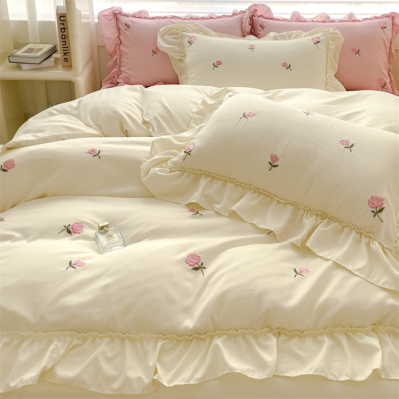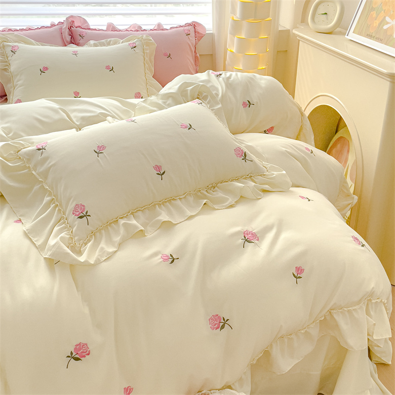 可思家纺 2024新款水洗棉满版刺绣大宽花边款四件套 玫瑰满园-奶油白