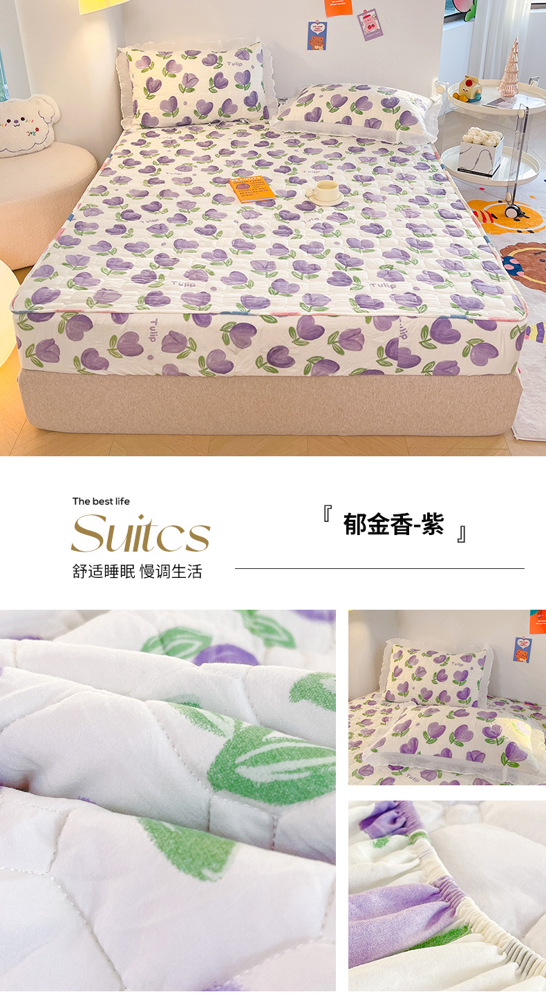 • 91家纺网 家纺一手货源 找家纺 默忆 2025新款水洗棉双层纱印花夹棉床笠  郁金香紫