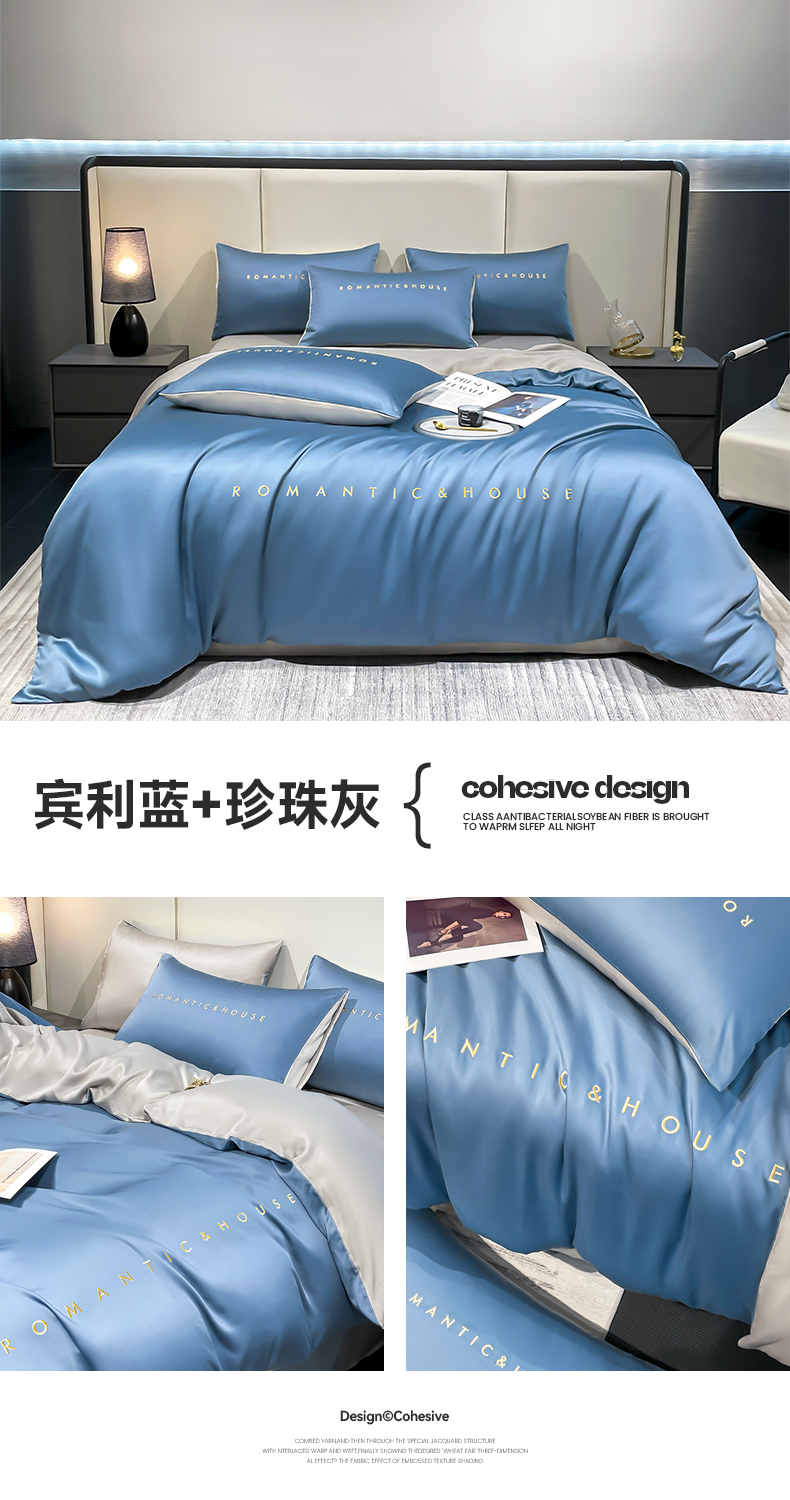 商品名称:花愿(原花纪) 2025新款轻奢刺绣水洗冰丝四件套-贝拉 宾利蓝+珍珠灰