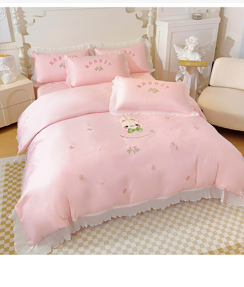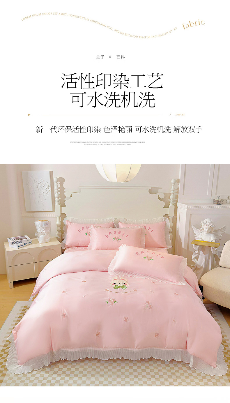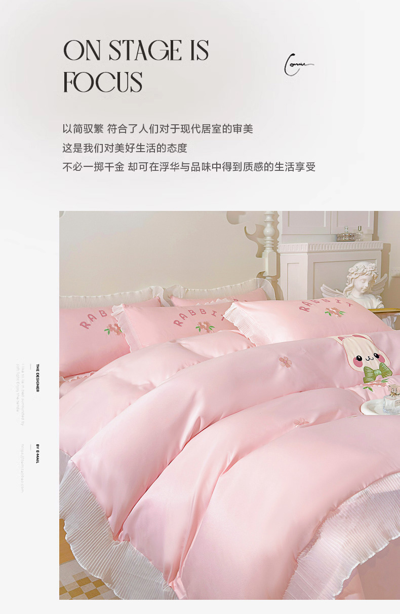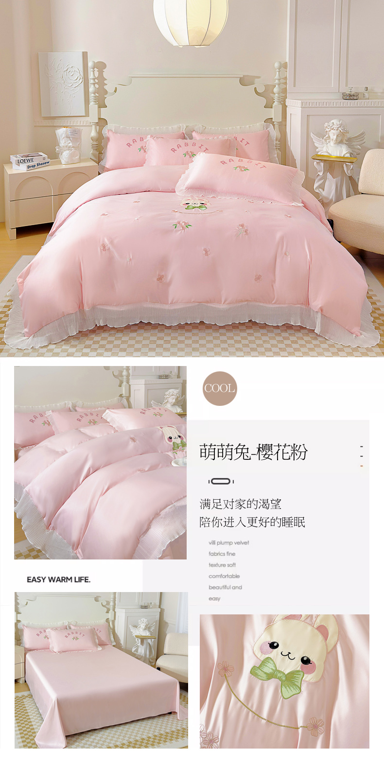 当前位置: 91家纺网 > 商品网购 > 床品套件 > 四件套 > 全棉普通四件套 > 菲儿家纺 2024新款水洗真丝花边刺绣四件套-萌萌兔系列 萌萌兔樱花粉