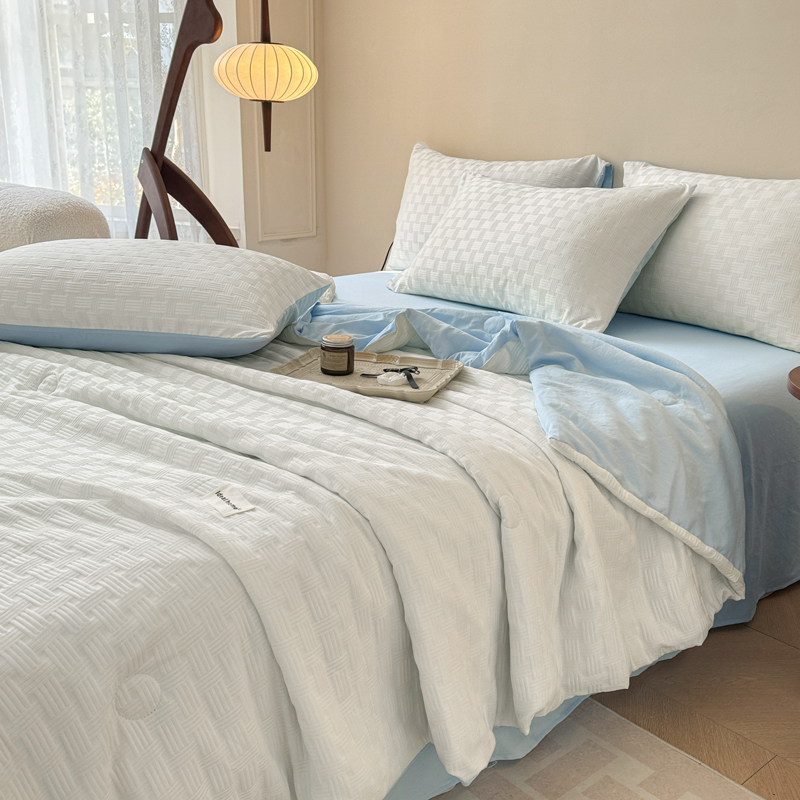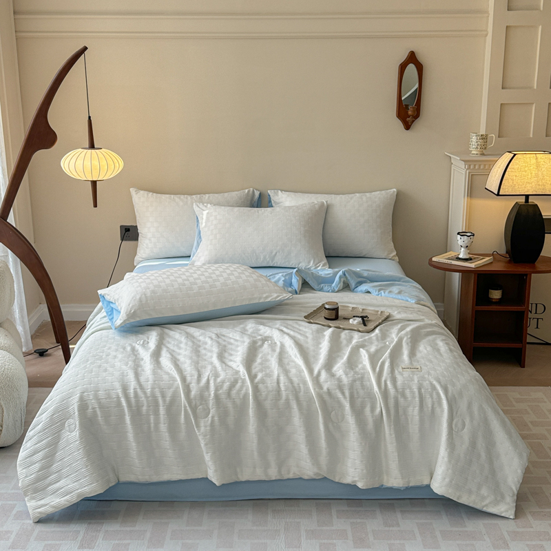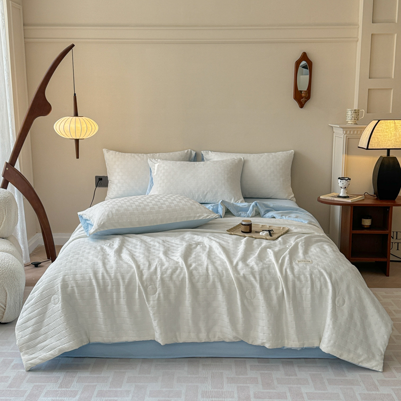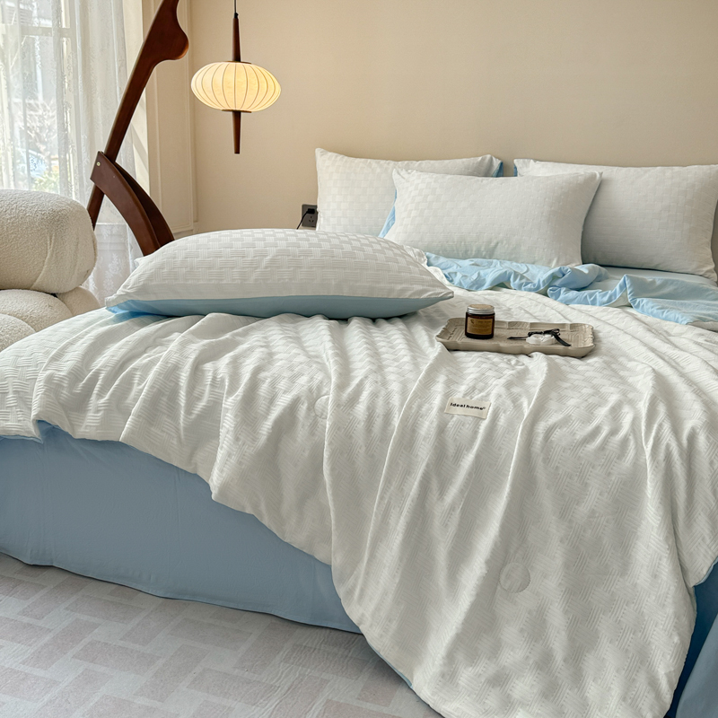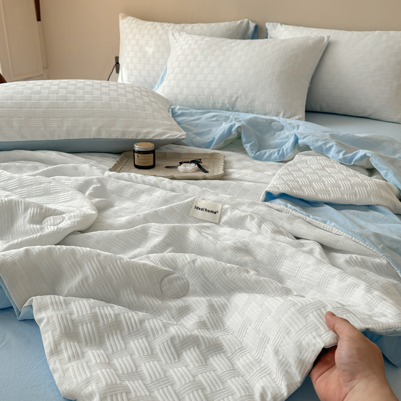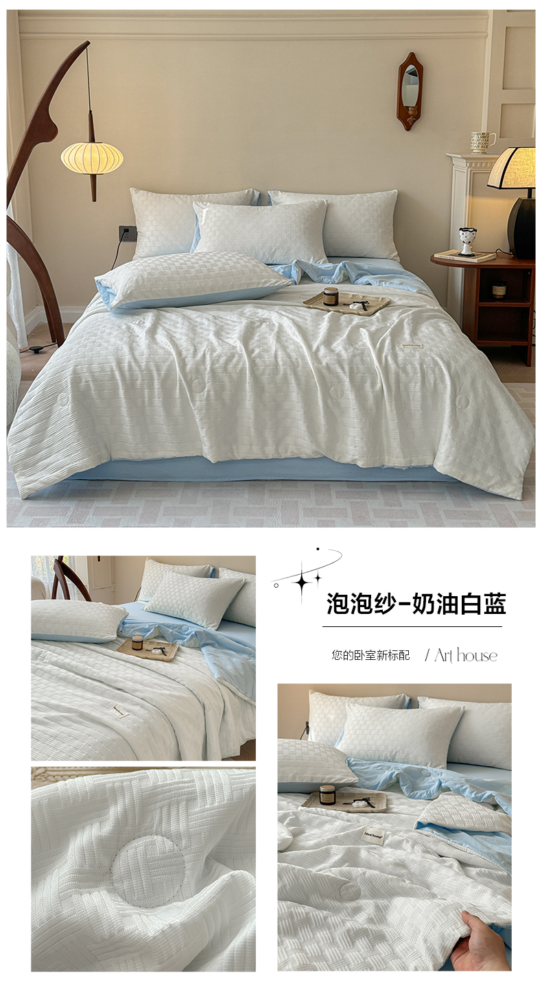 当前位置: 91家纺网 > 商品网购 > 床品套件 > 四件套 > 夏被四件套 > 2024沐辰家居-新款泡泡纱A类大豆纤维夏被四件套 奶油白蓝