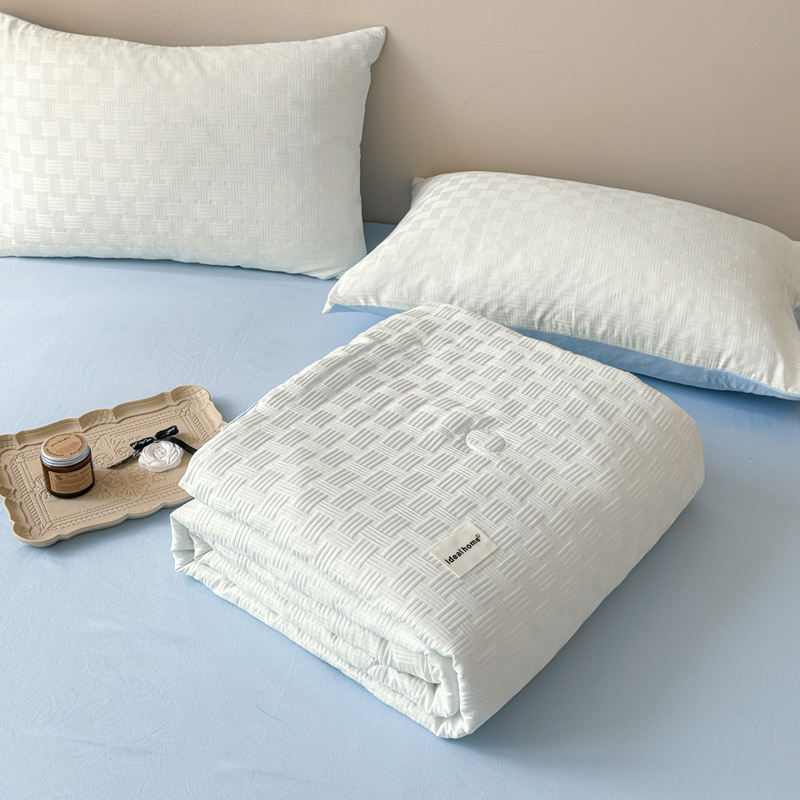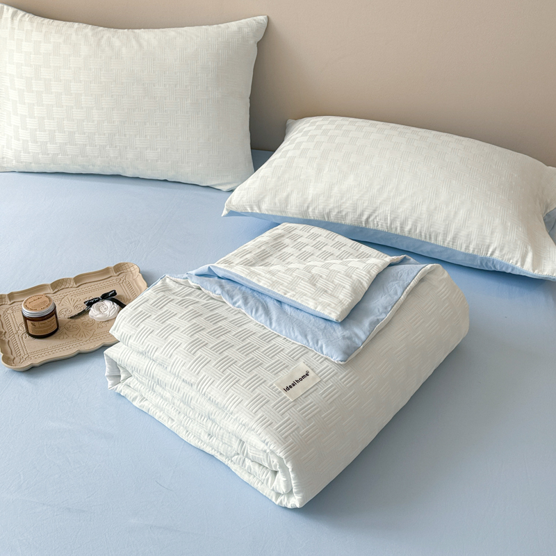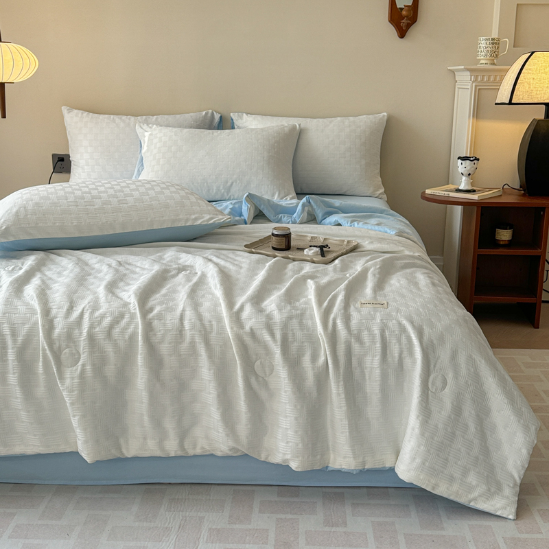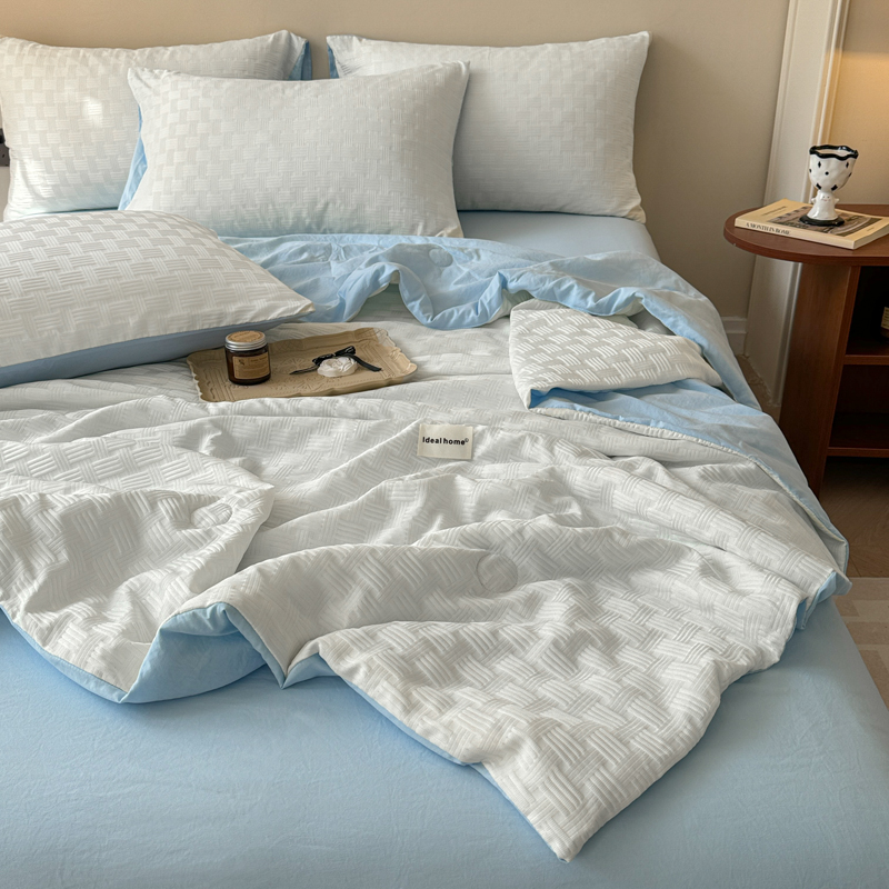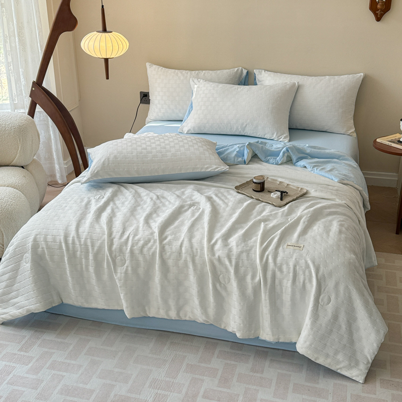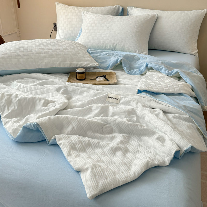 当前位置: 91家纺网 > 商品网购 > 床品套件 > 四件套 > 夏被四件套 > 2024沐辰家居-新款泡泡纱A类大豆纤维夏被四件套 奶油白蓝