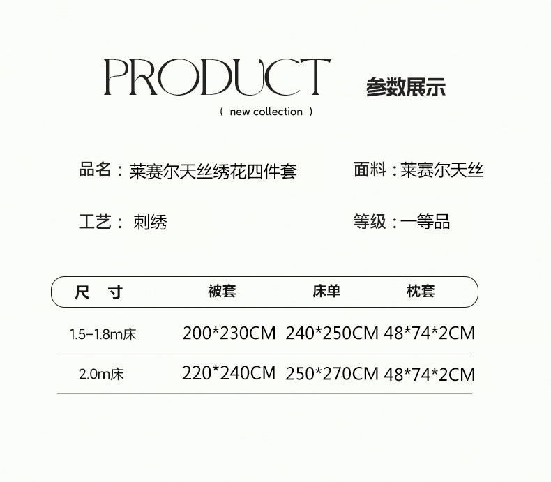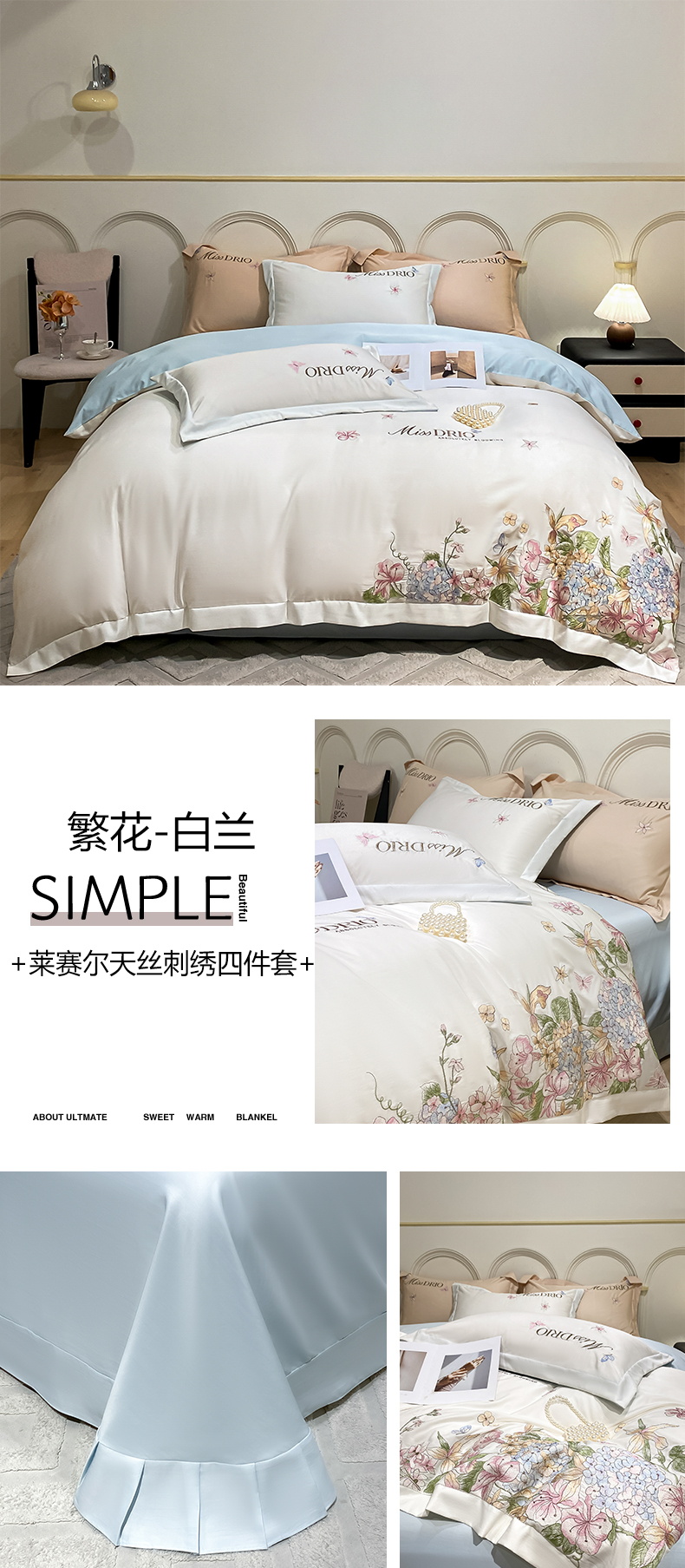 商品名称:新印象 2024新款60s天丝宽边绣花工艺四件套-繁花 繁花-白兰