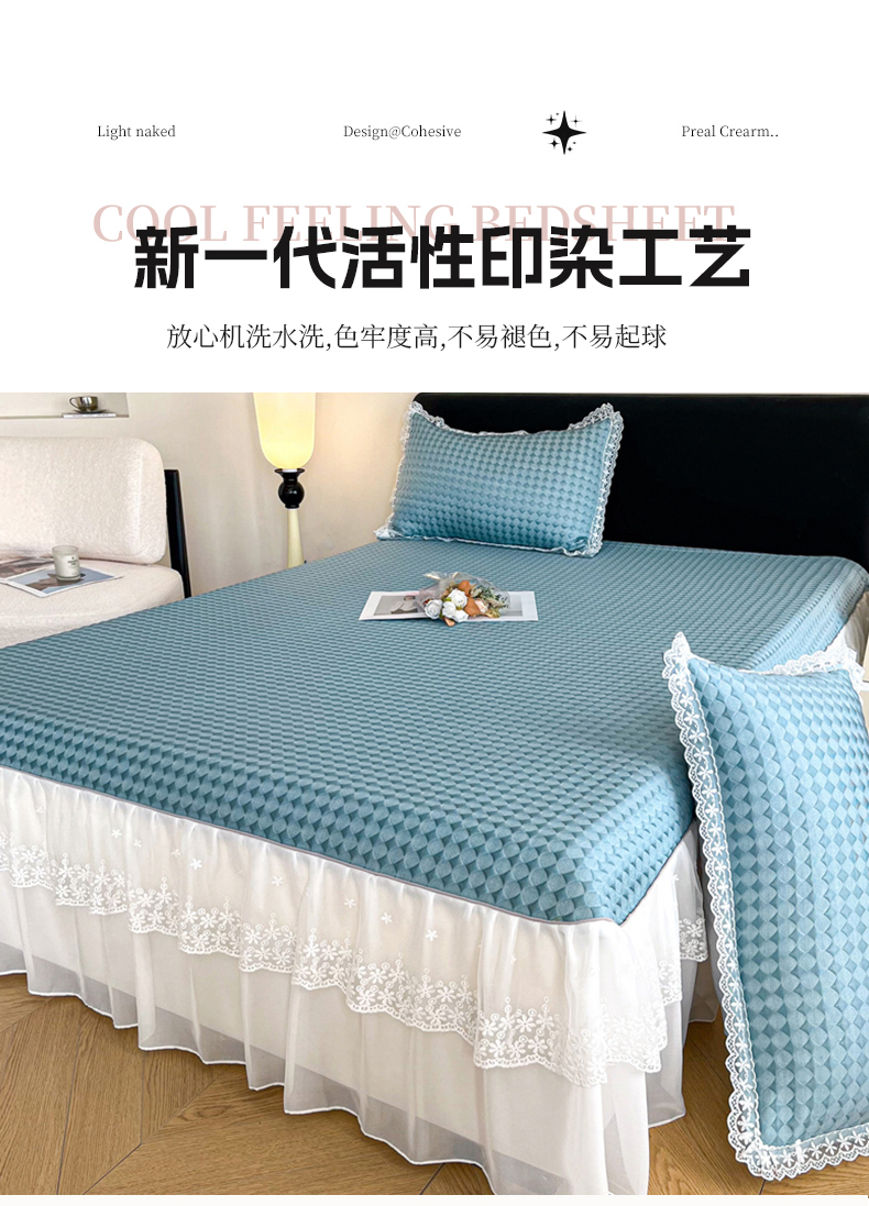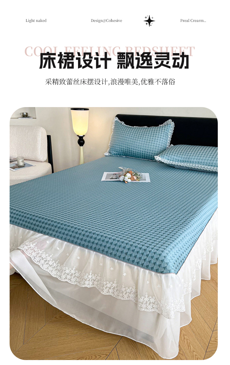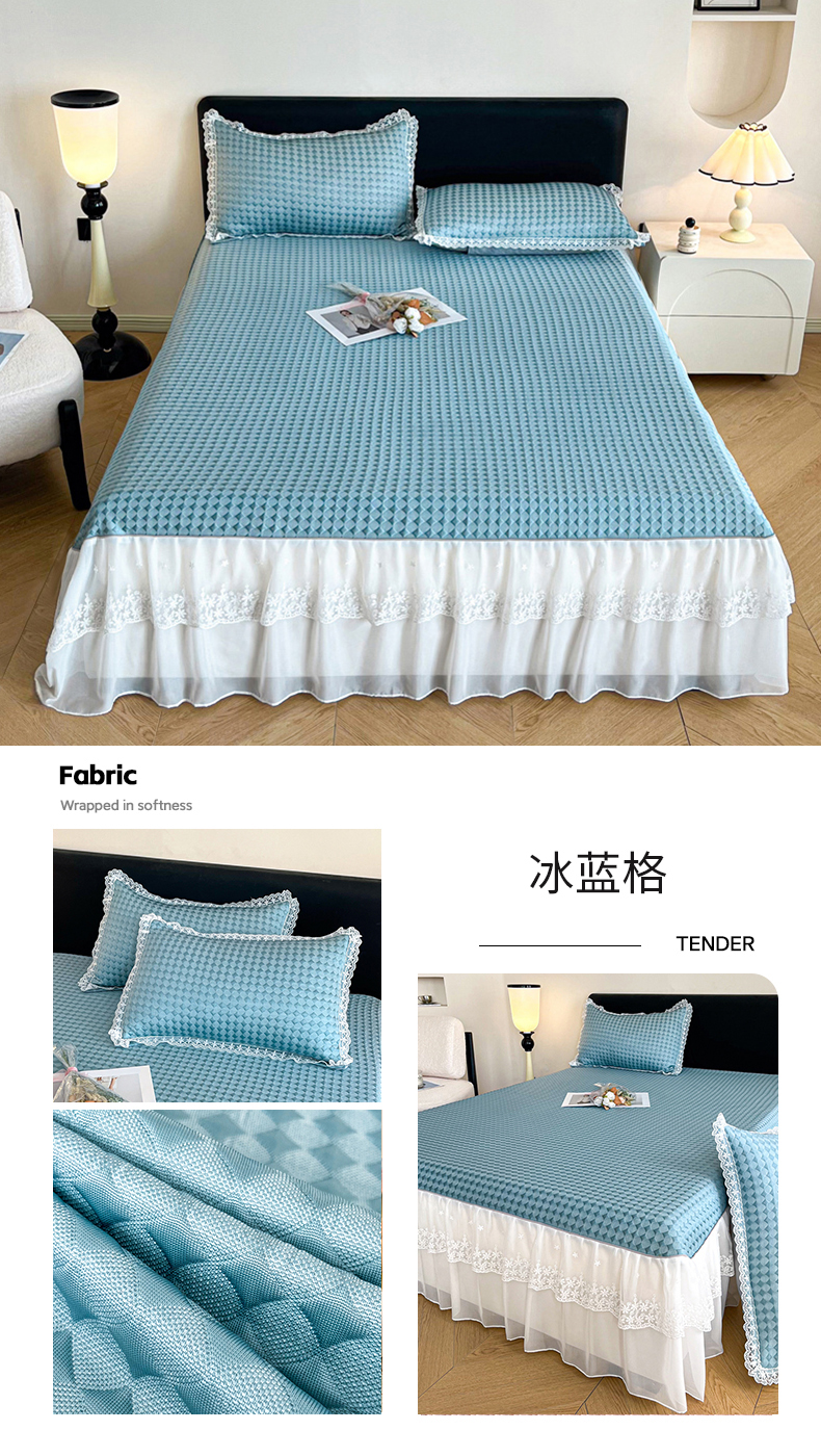 商品名称:吉祥家纺 2024新款华夫格冰豆豆凉感床裙套件 冰蓝格