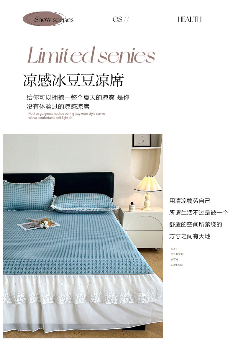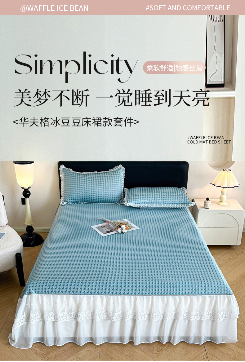 (总)吉祥家纺 2024新款华夫格冰豆豆凉感床裙套件,冰蓝格,冰灰格,冰粉格,冰绿格,灰豆格,粉豆格,绿豆格,蓝豆格