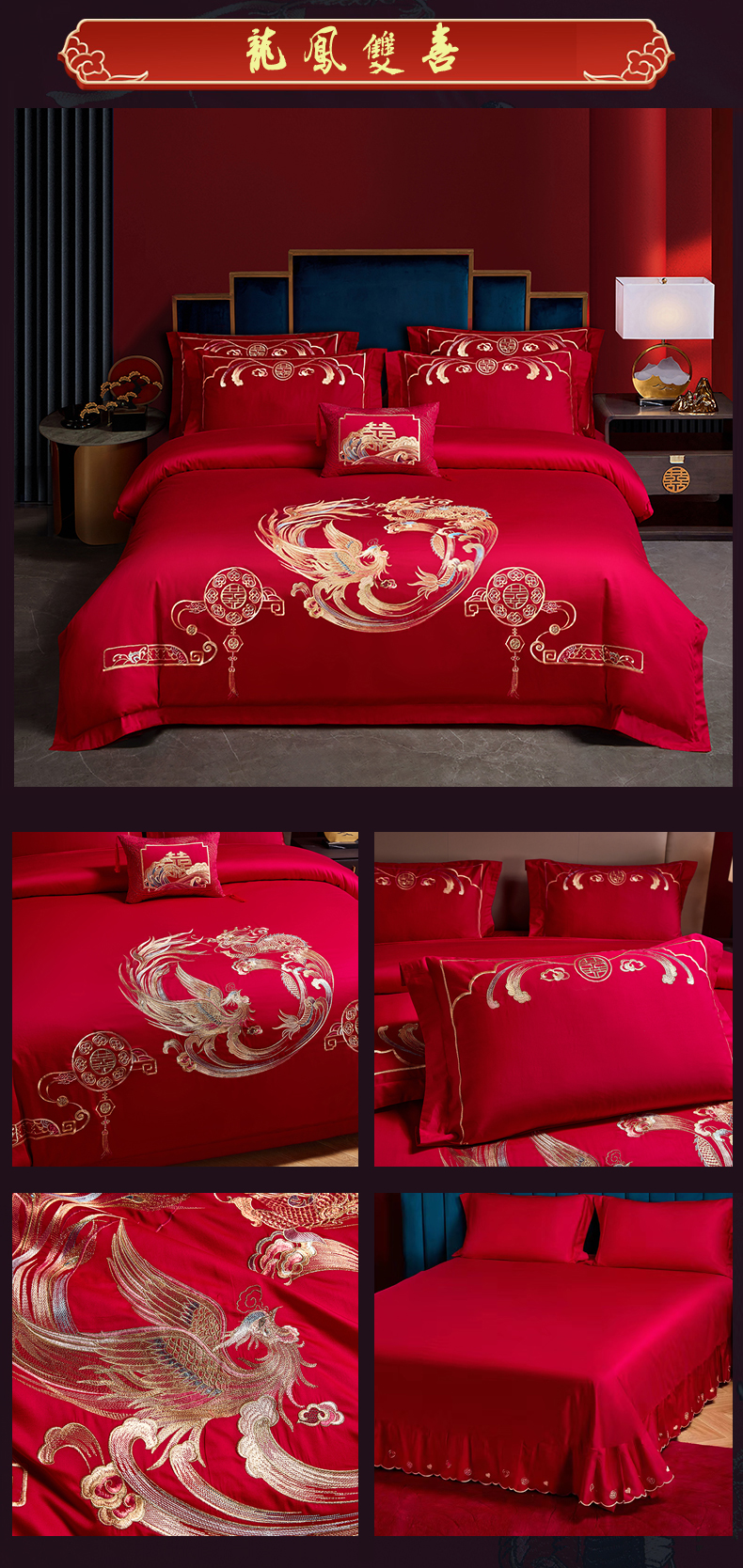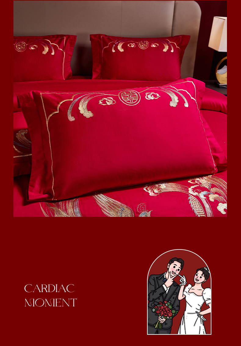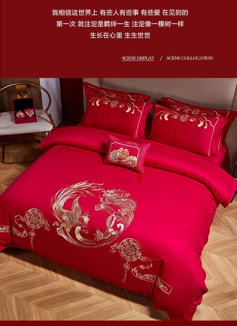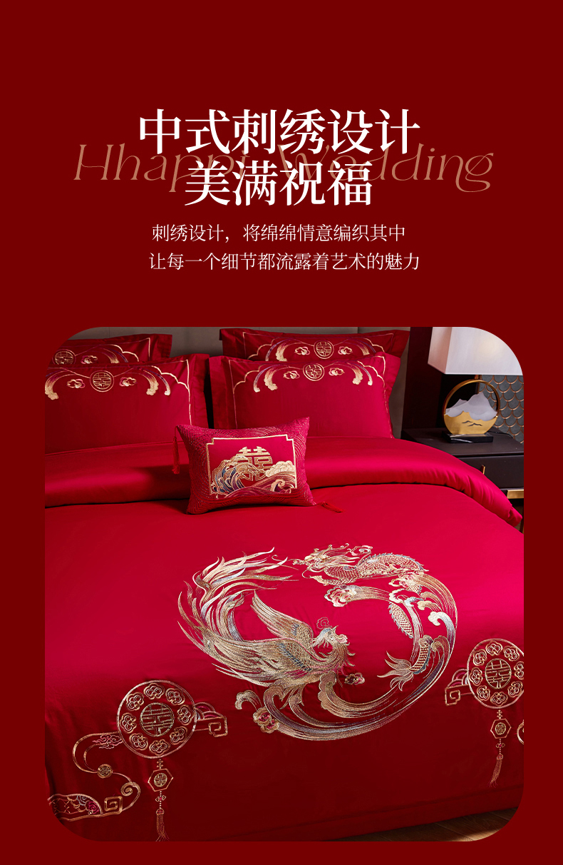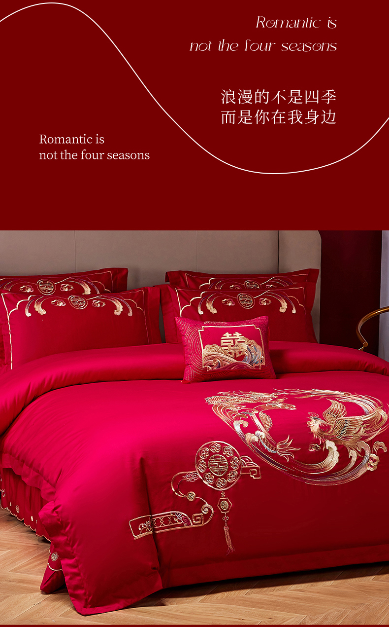 商品名称:晶缦家纺 2024纯棉全棉60支贡缎长绒棉刺绣花婚庆四件套--绣花贴边床单款 龙凤双喜