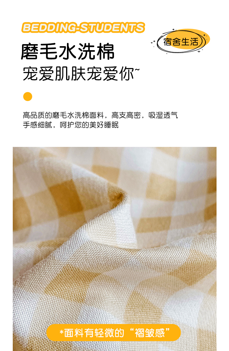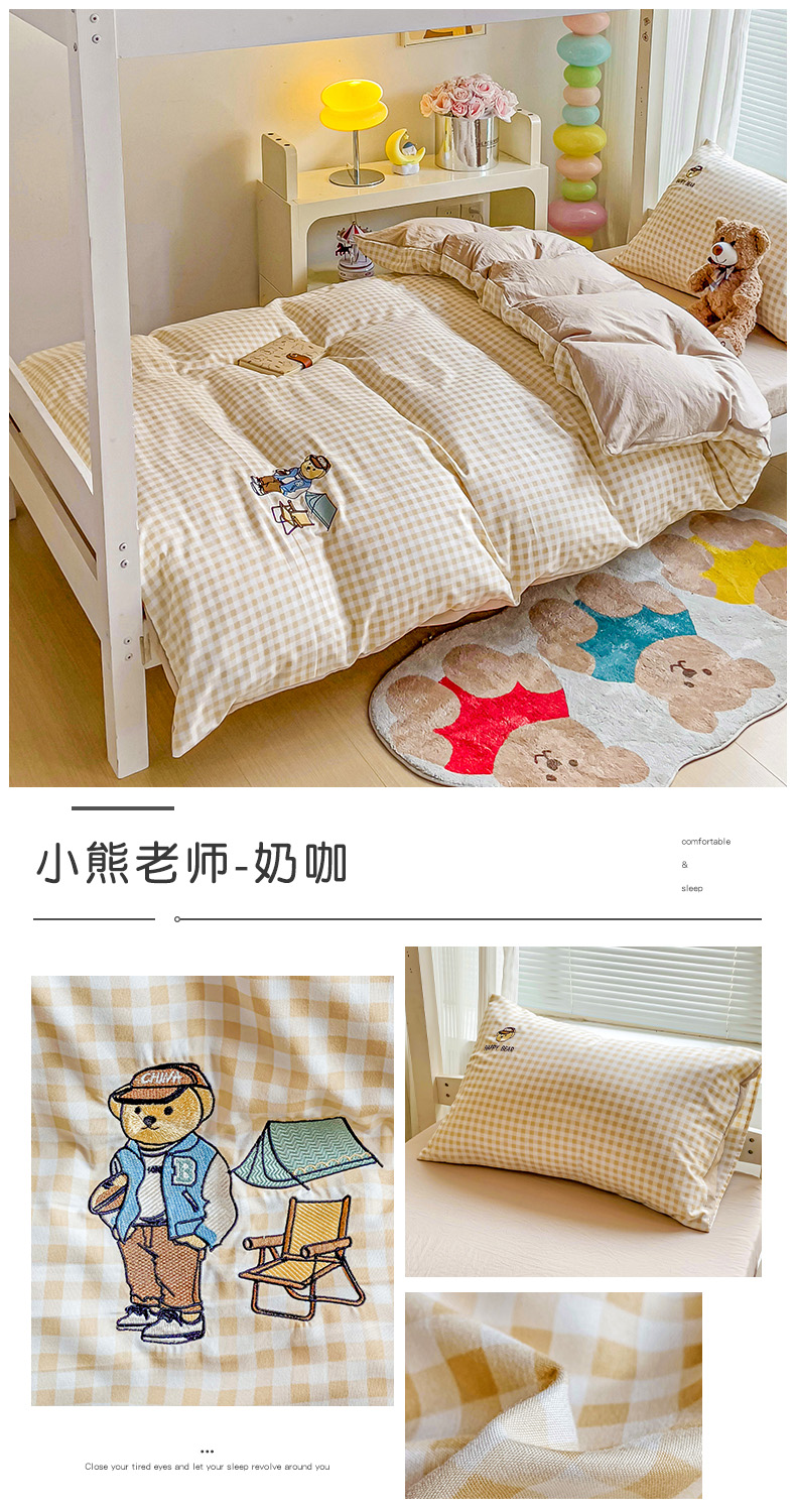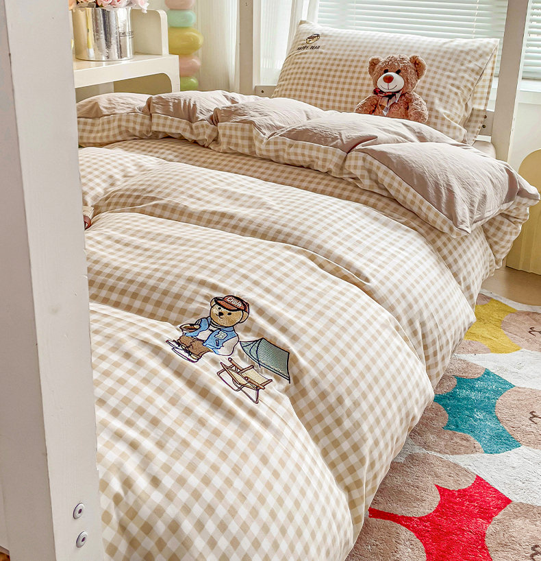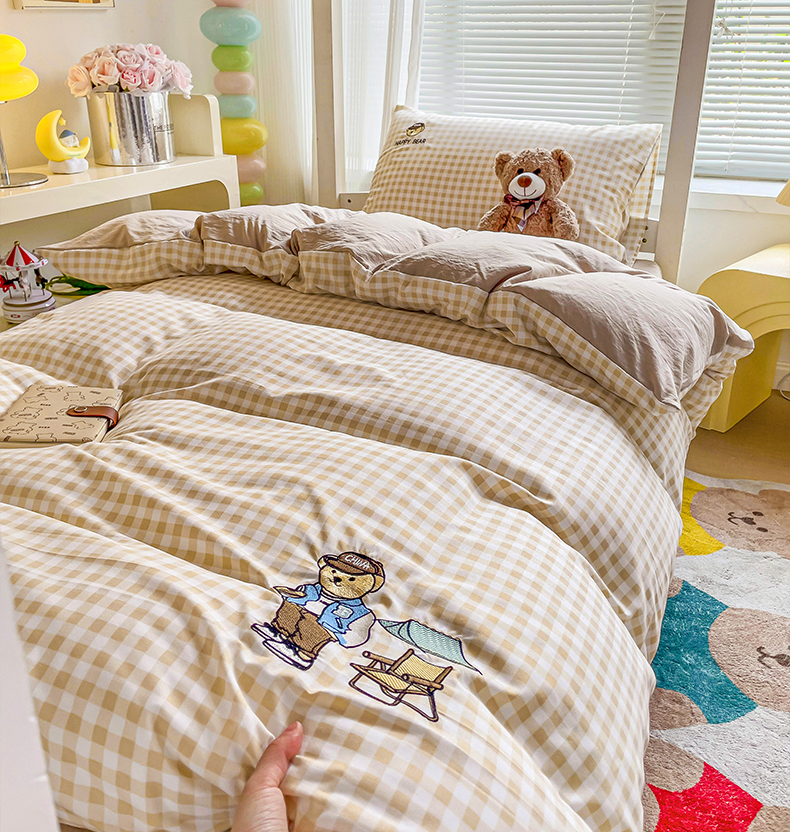 商品名称:(总)2024新款磨毛水洗棉学生宿舍精美刺绣时尚格子四件套--小熊老师系列