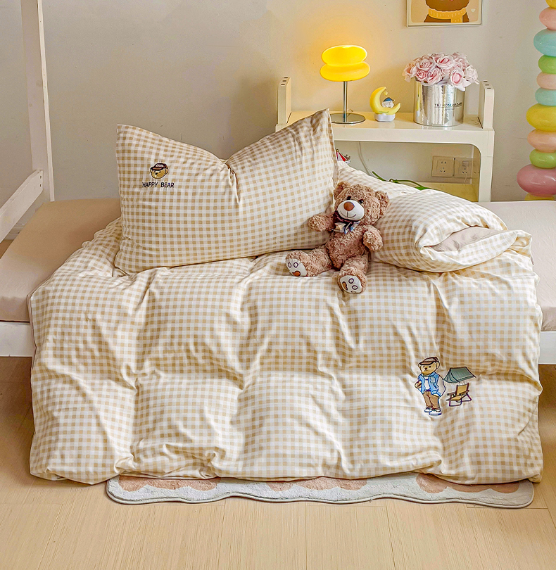 (总)2024新款磨毛水洗棉学生宿舍精美刺绣时尚格子四件套--小熊老师系列