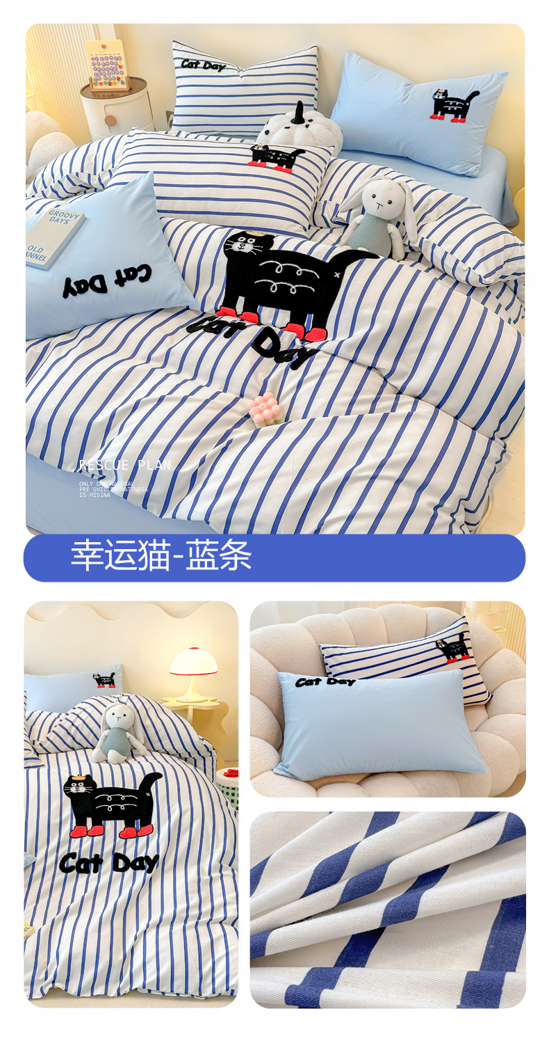 商品名称:大境 2024新款毛巾绣全棉纯棉学生三件套四件套 幸运猫-蓝条