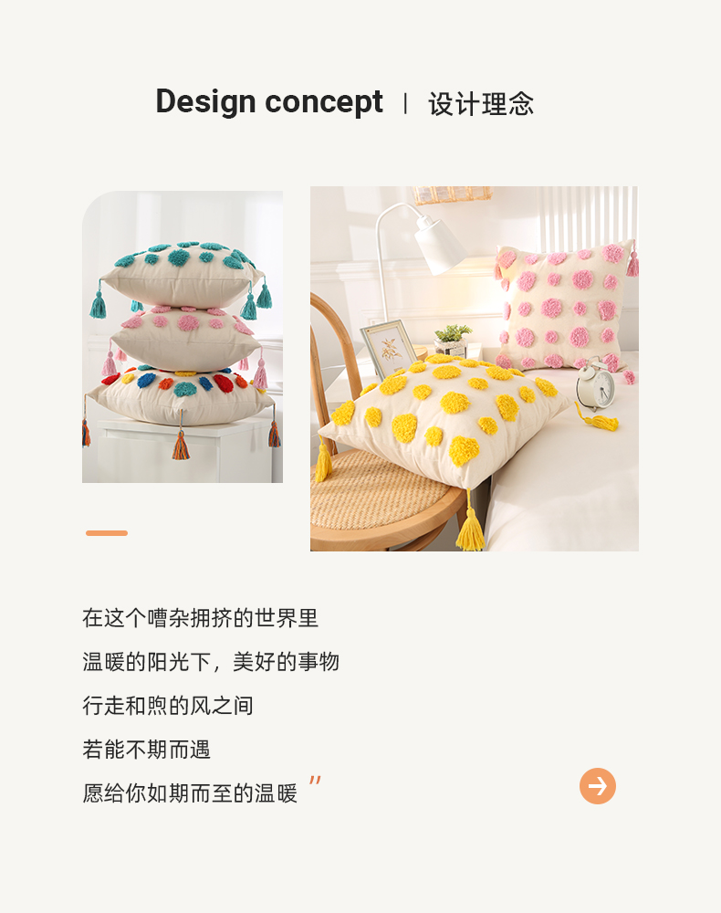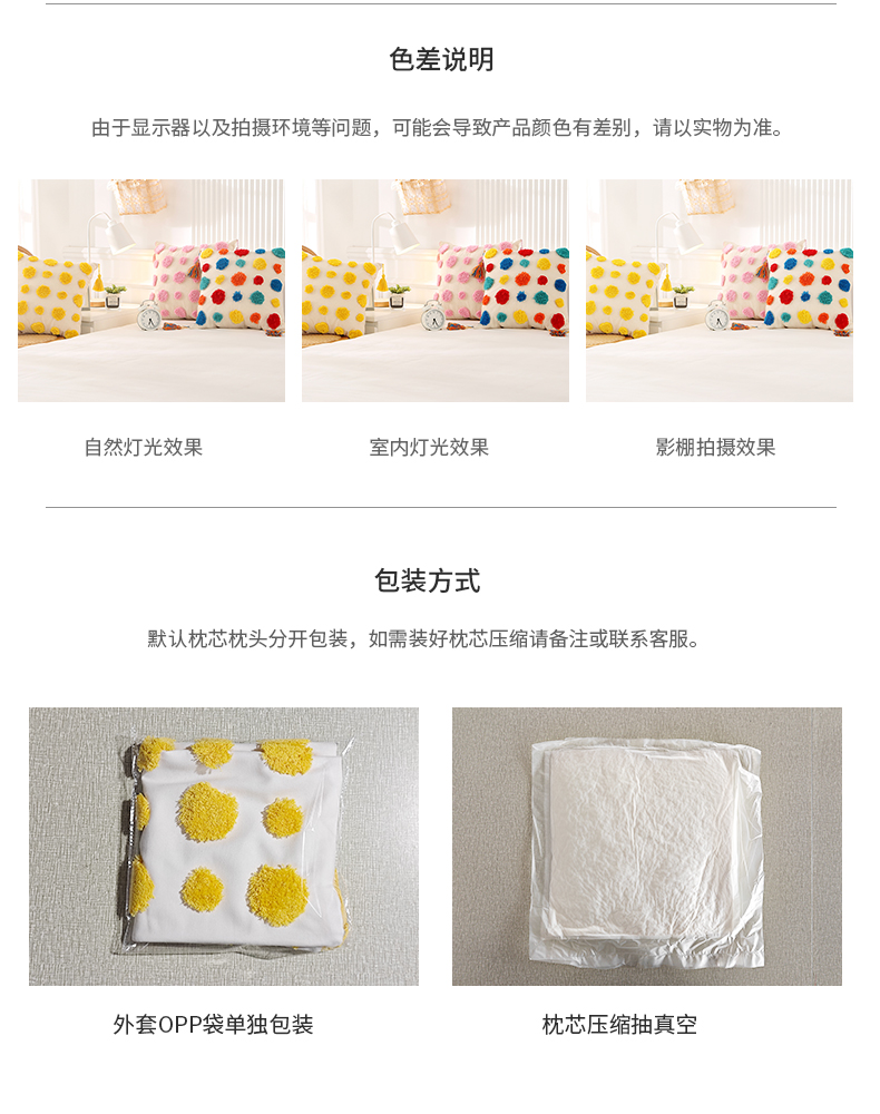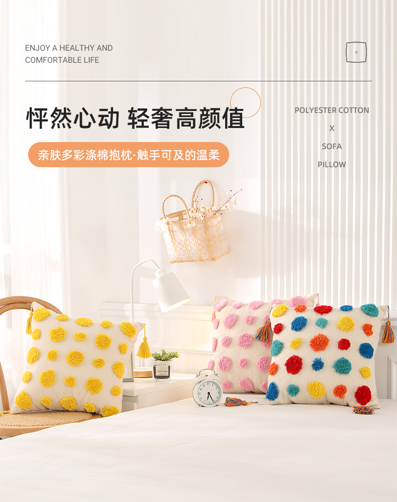 商品名称:囍莱家纺 2024新款亲肤多彩涤棉抱枕 流苏圆点-黄色