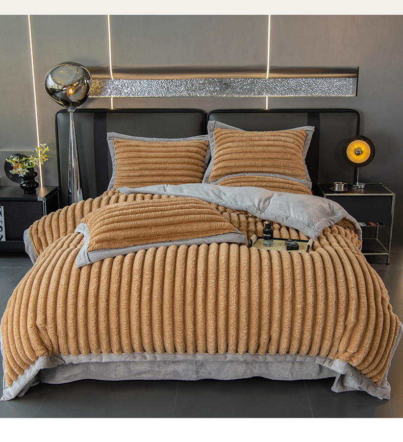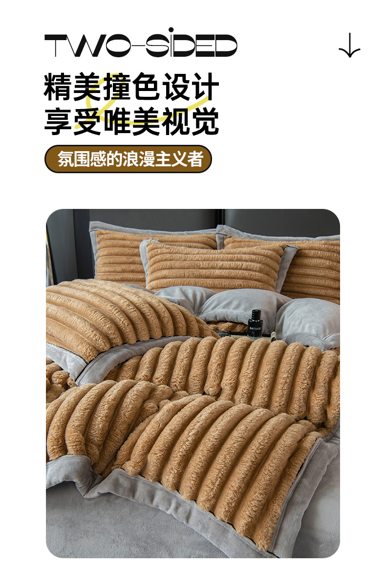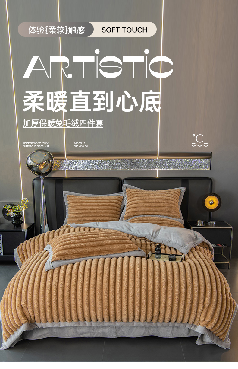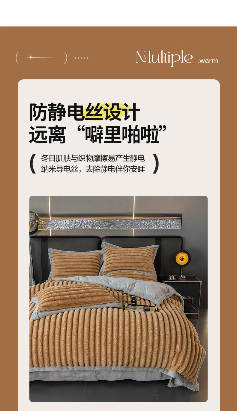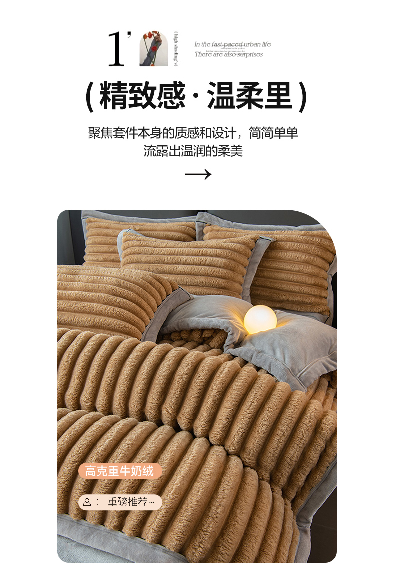 商品名称:妮恒美家纺 2024新款400克超厚竖条兔毛绒四件套 竖条兔绒-拿铁咖