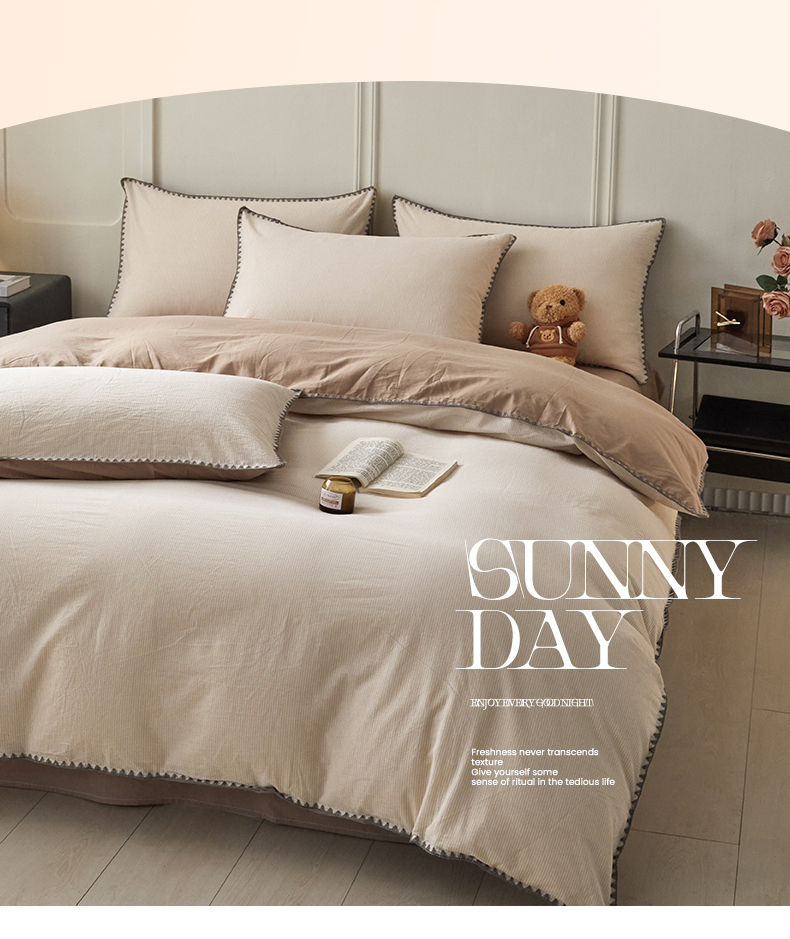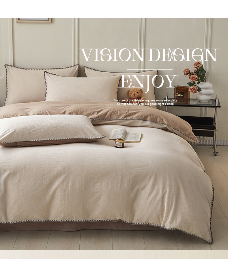 吉象家纺 2024新款A类全棉色织水洗棉贝壳边三角针四件套 秘境奶咖