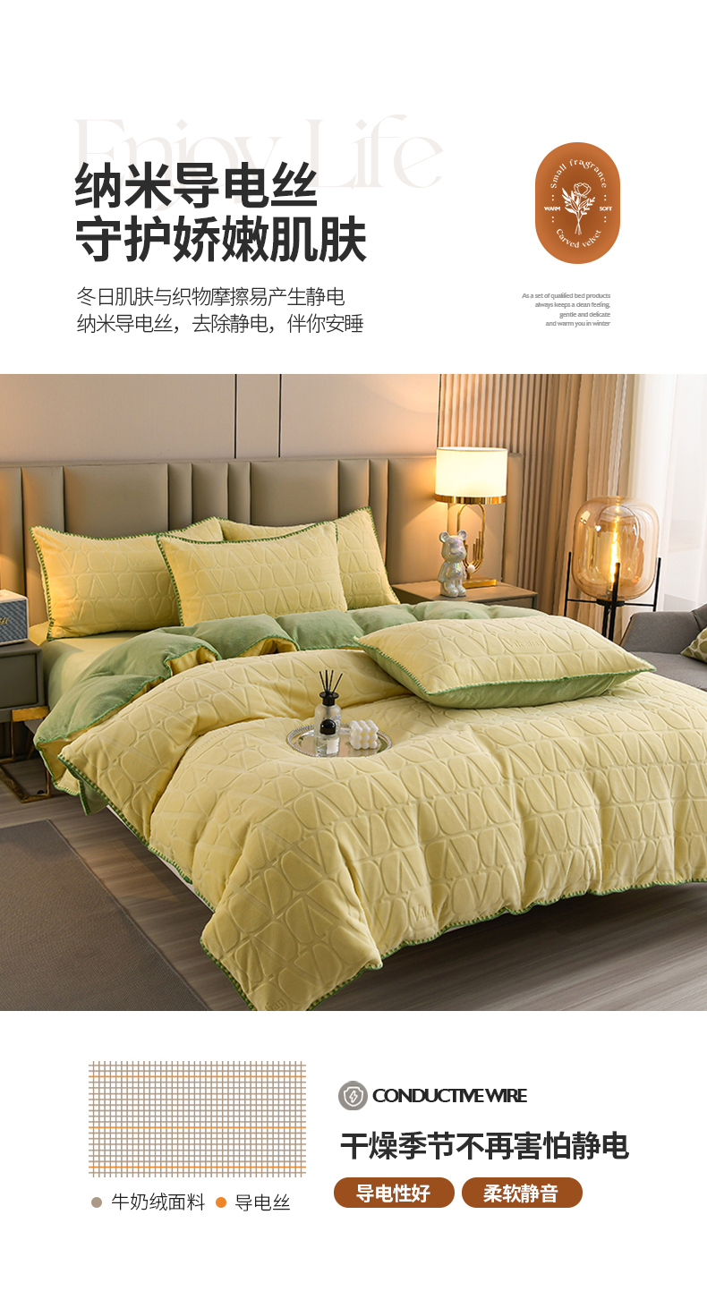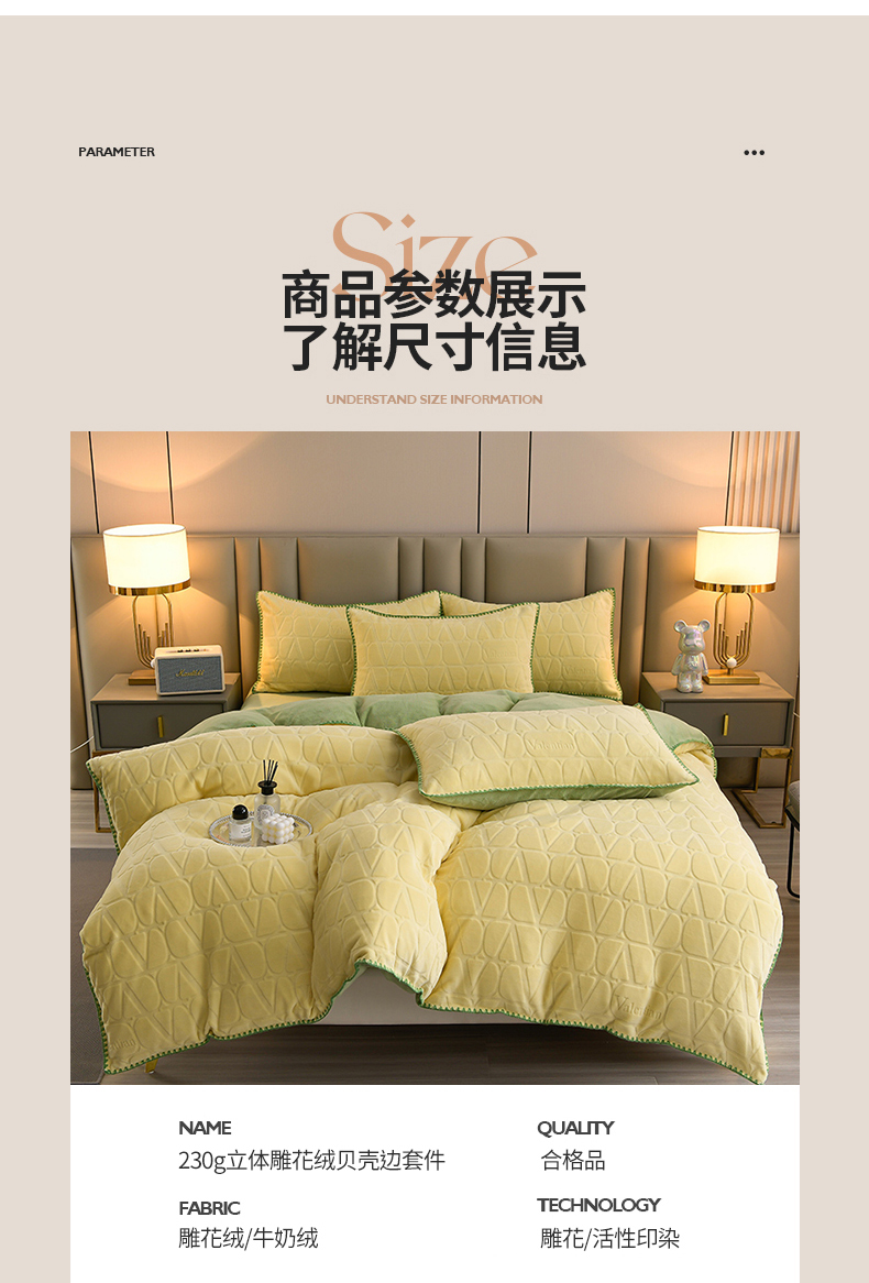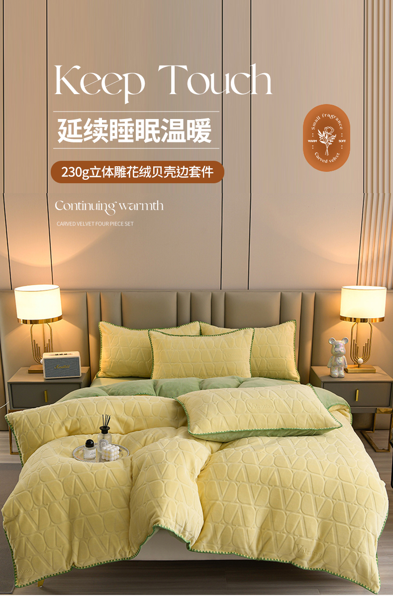 当前位置: 91家纺网 > 商品网购 > 床品套件 > 四件套 > 雕花绒四件套 > 菡宝 2024新款贝壳边雕花绒四件套 华威-鹅黄