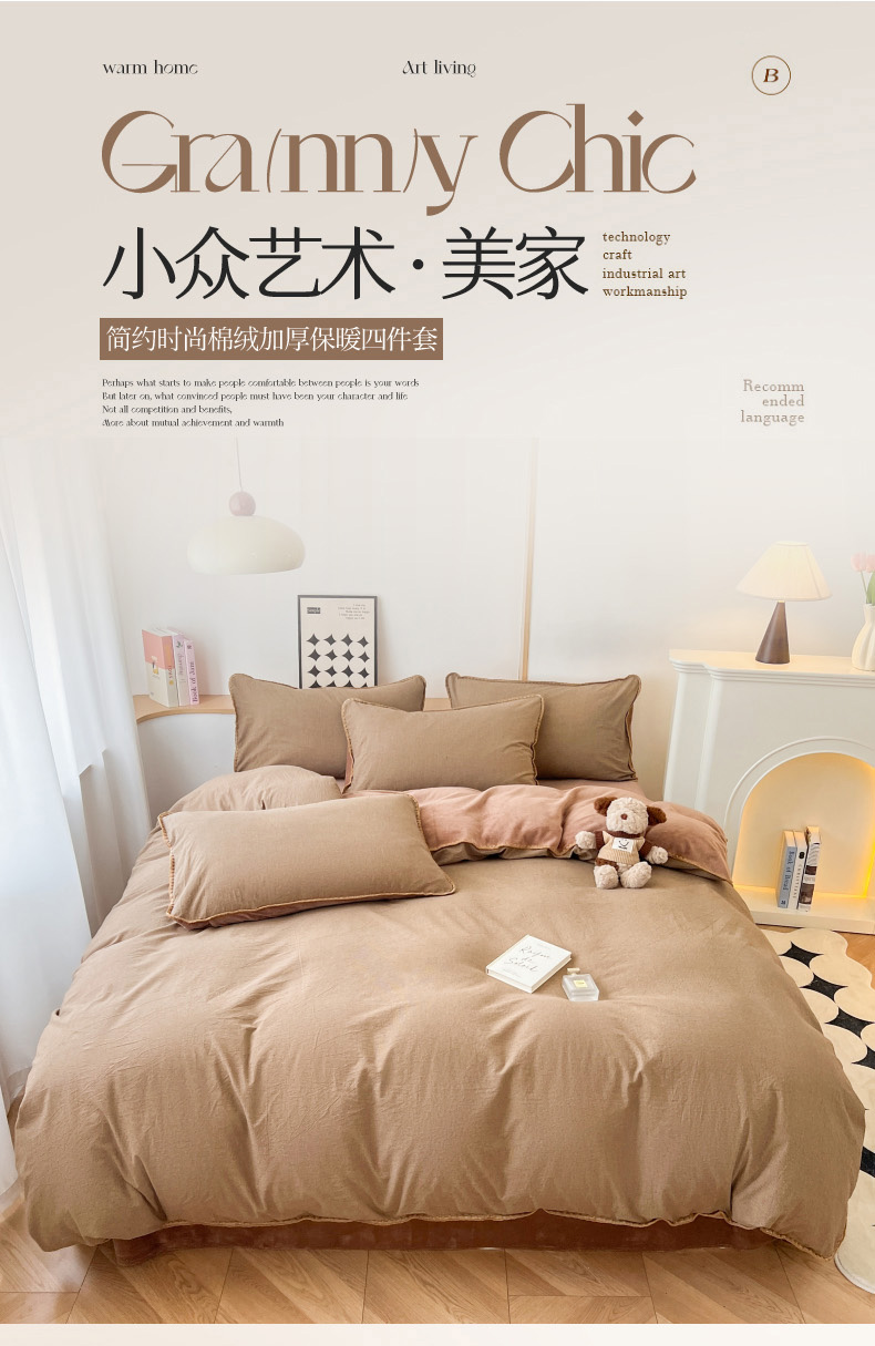 商品名称:柠馨 2024新款简约时尚全棉牛奶绒棉绒四件套 棉绒肌理咖