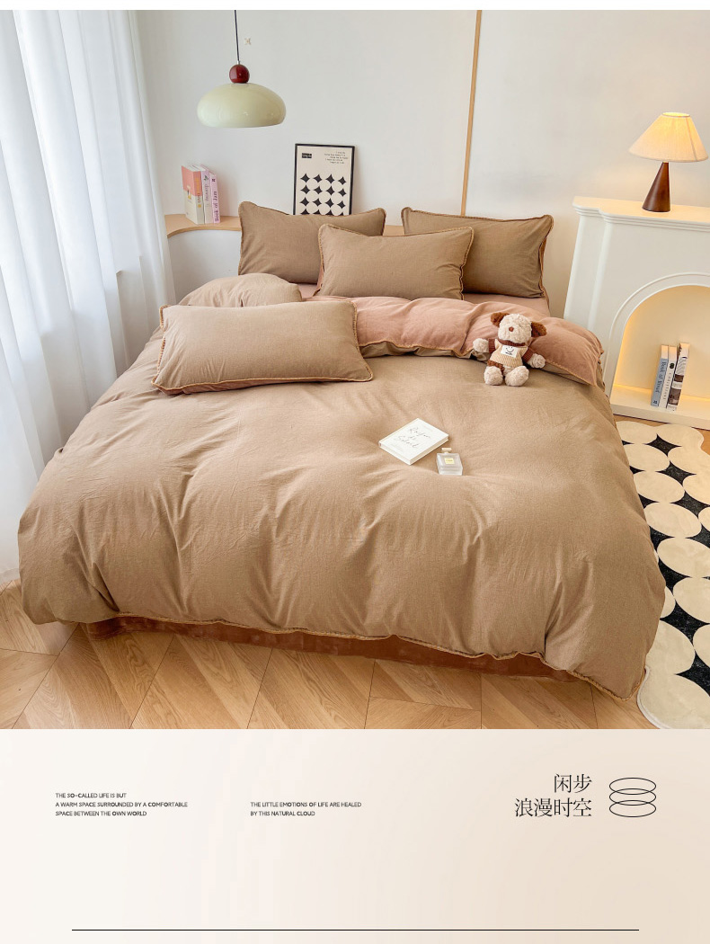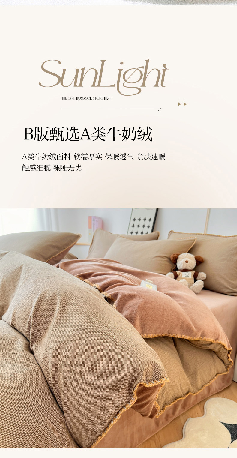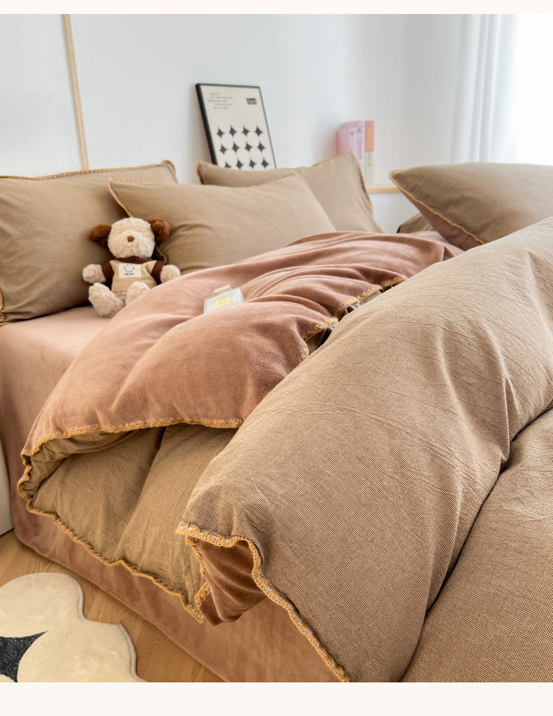 柠馨 2024新款简约时尚全棉牛奶绒棉绒四件套 棉绒肌理咖