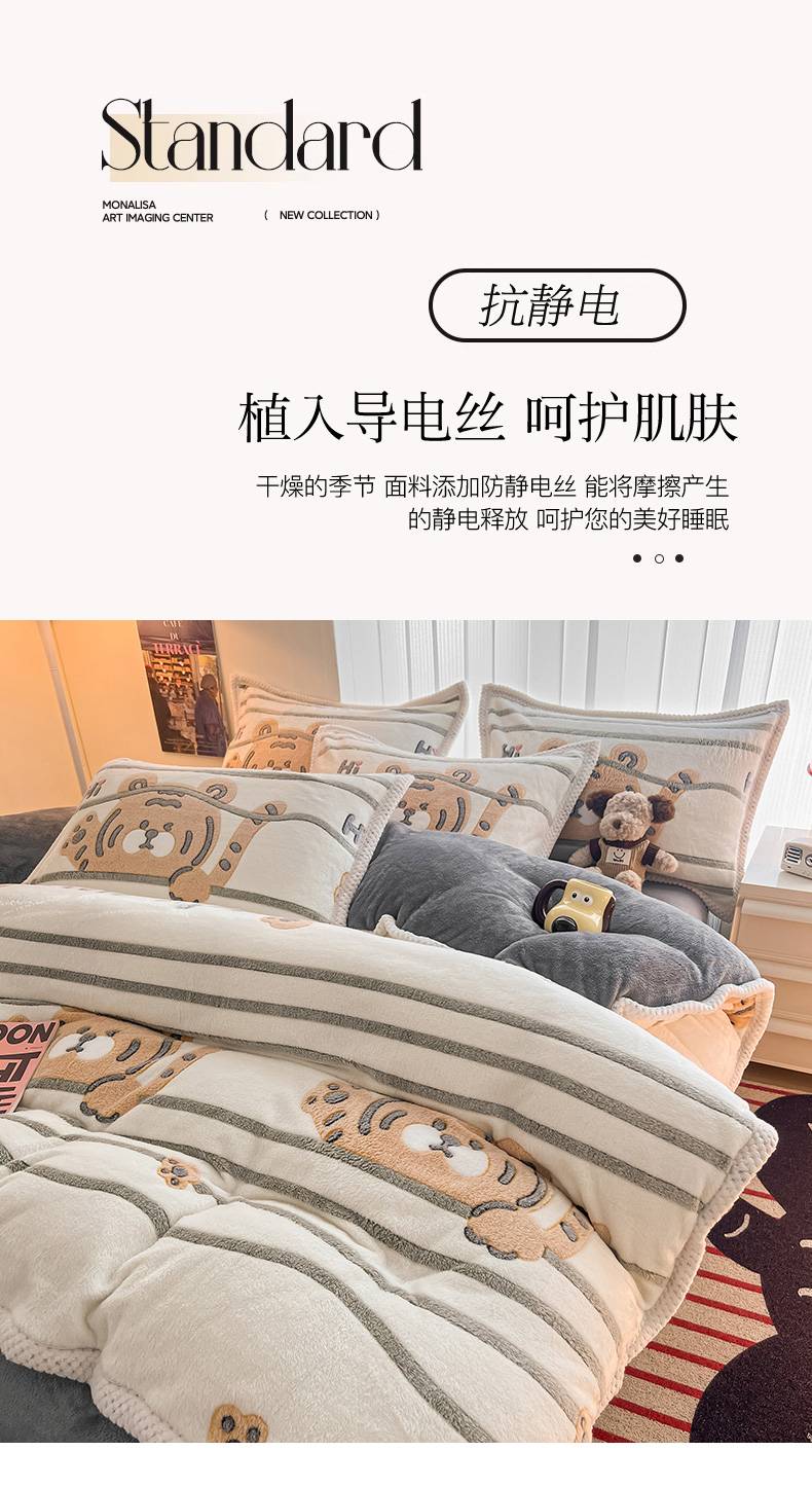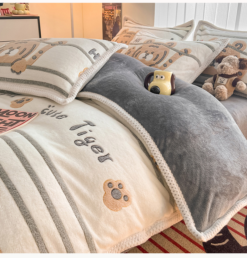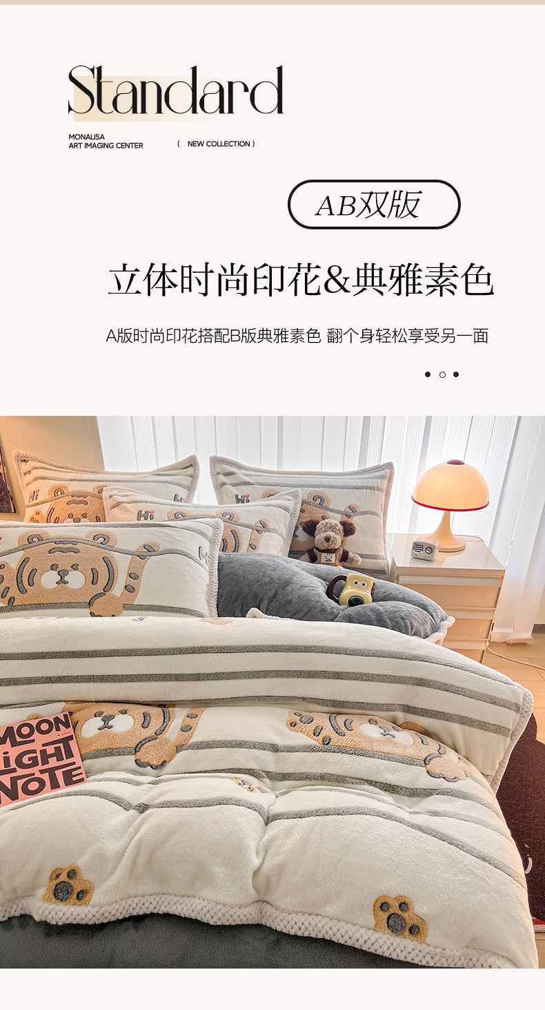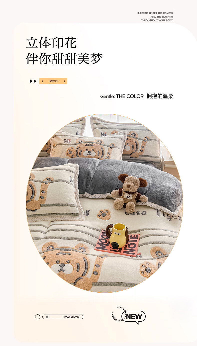 (总)倾慕家纺 2025新款卡通毛巾绣加厚保暖牛奶绒四件套,爱心女孩,咖啡小狗,猫咪熊兔,迷你小车,圣诞树熊,音乐企鹅